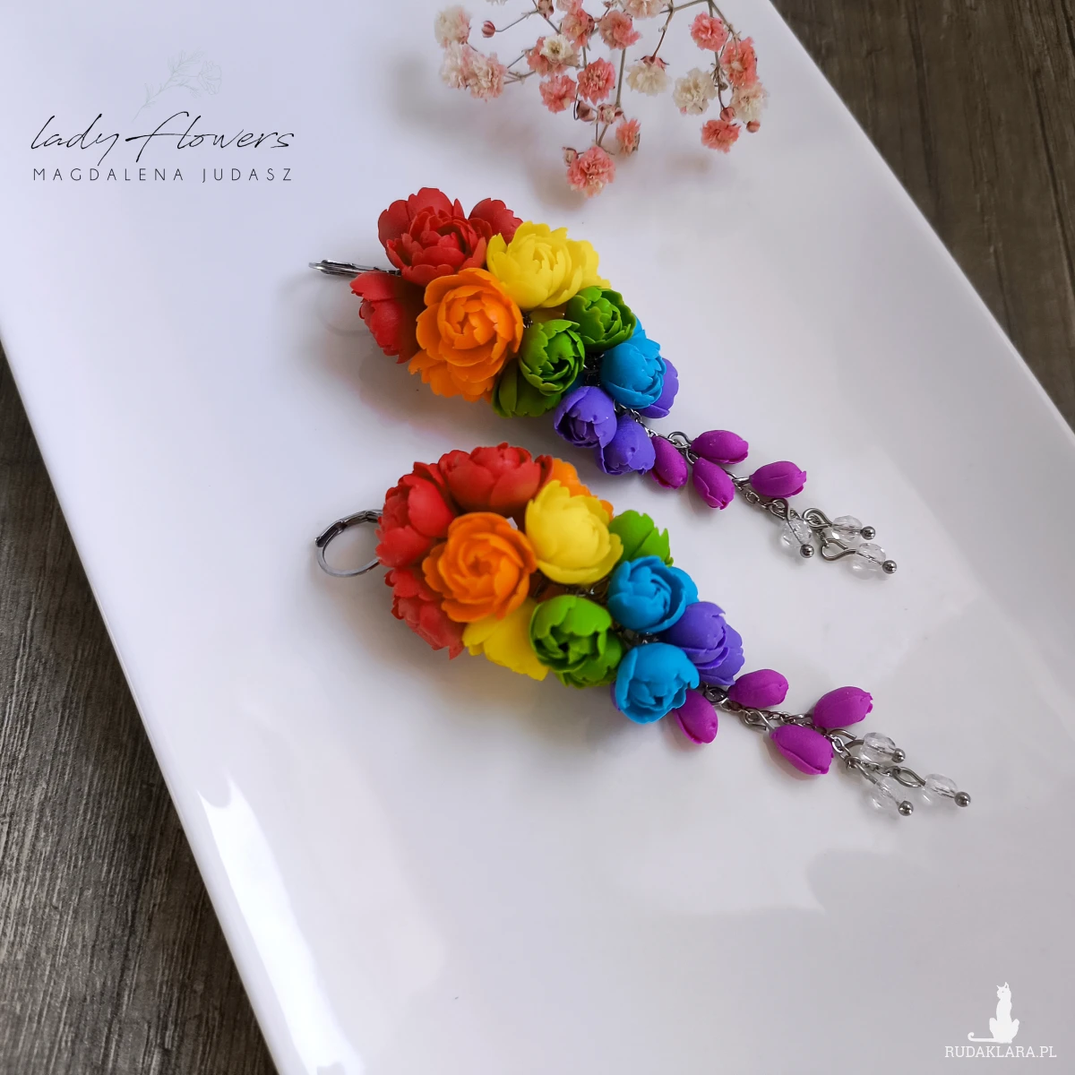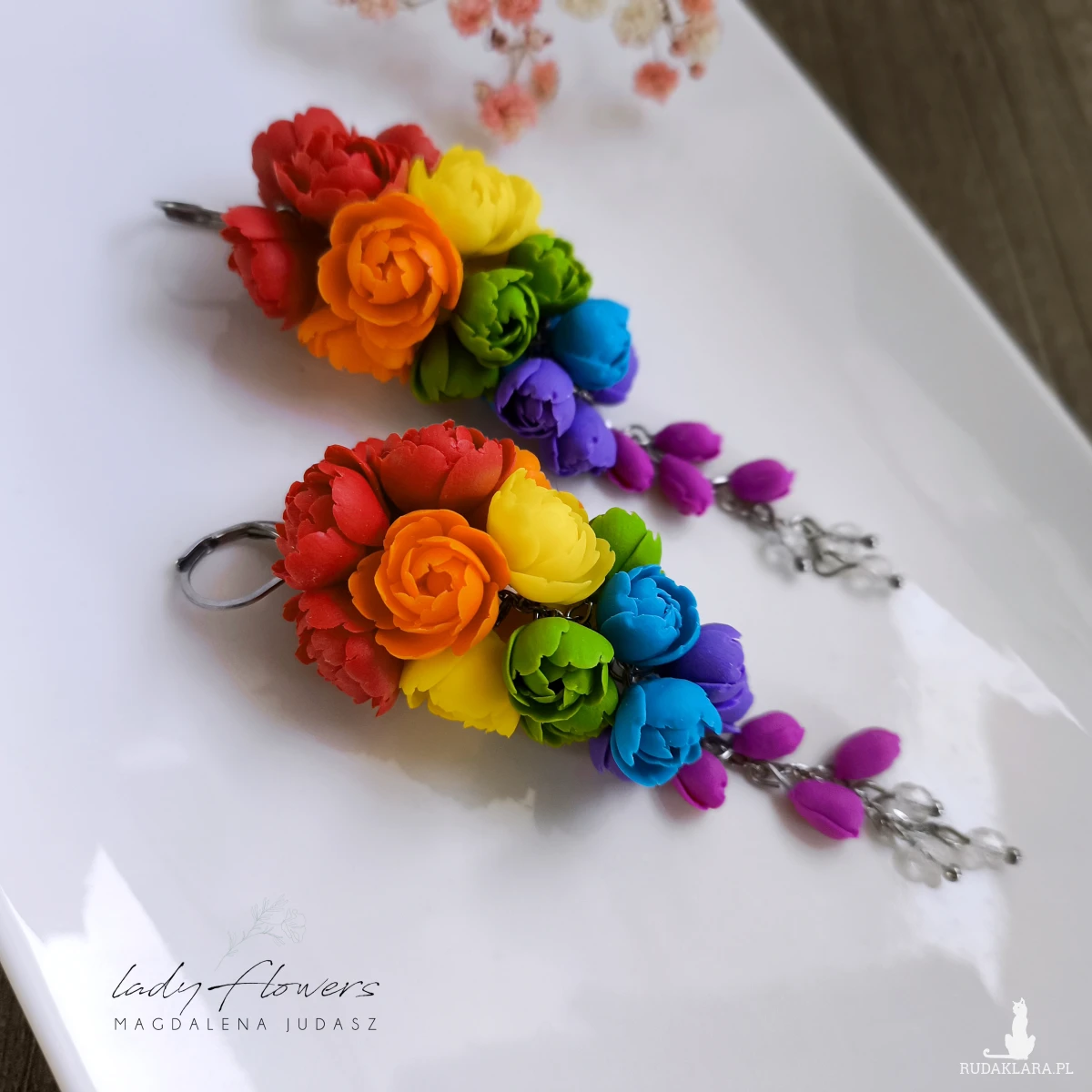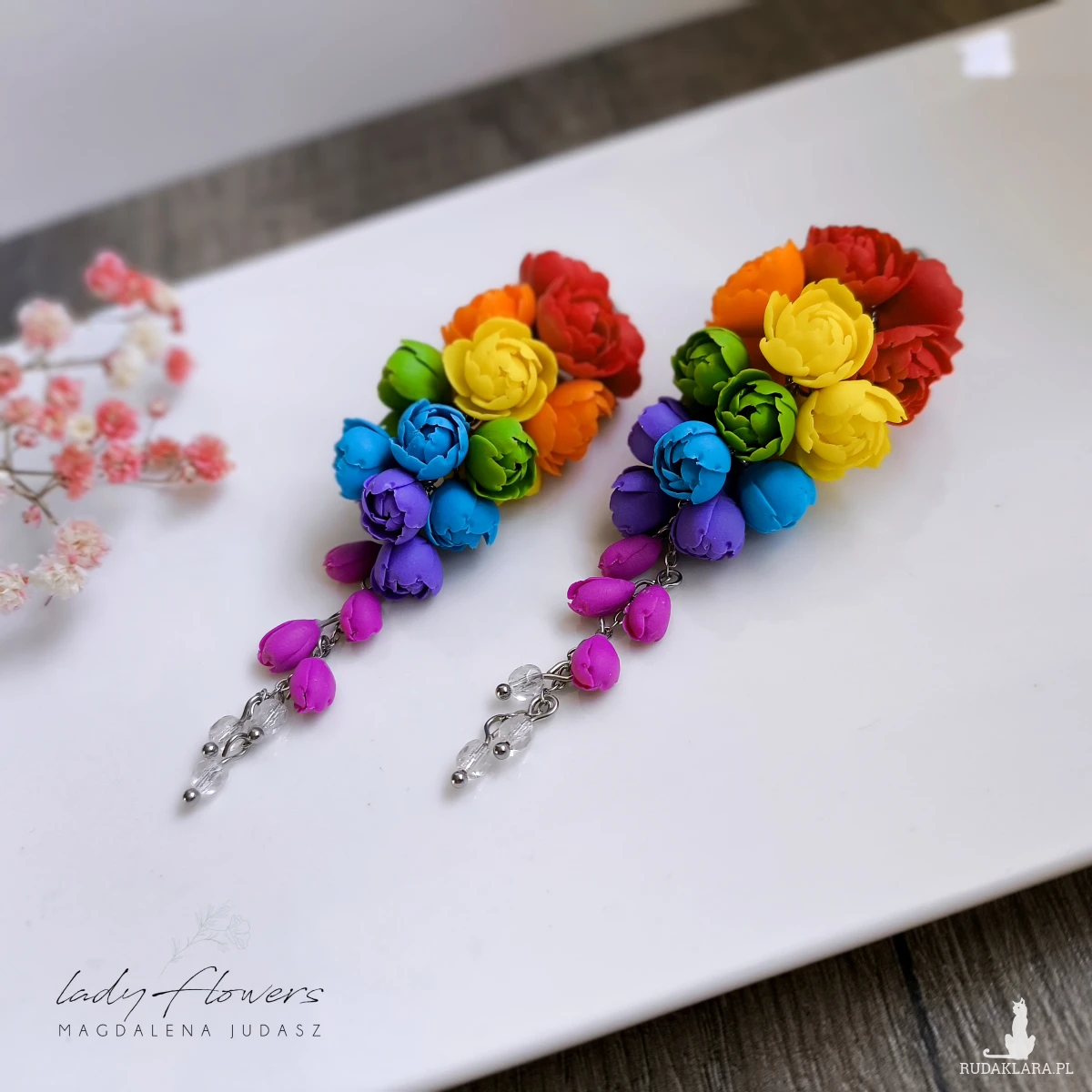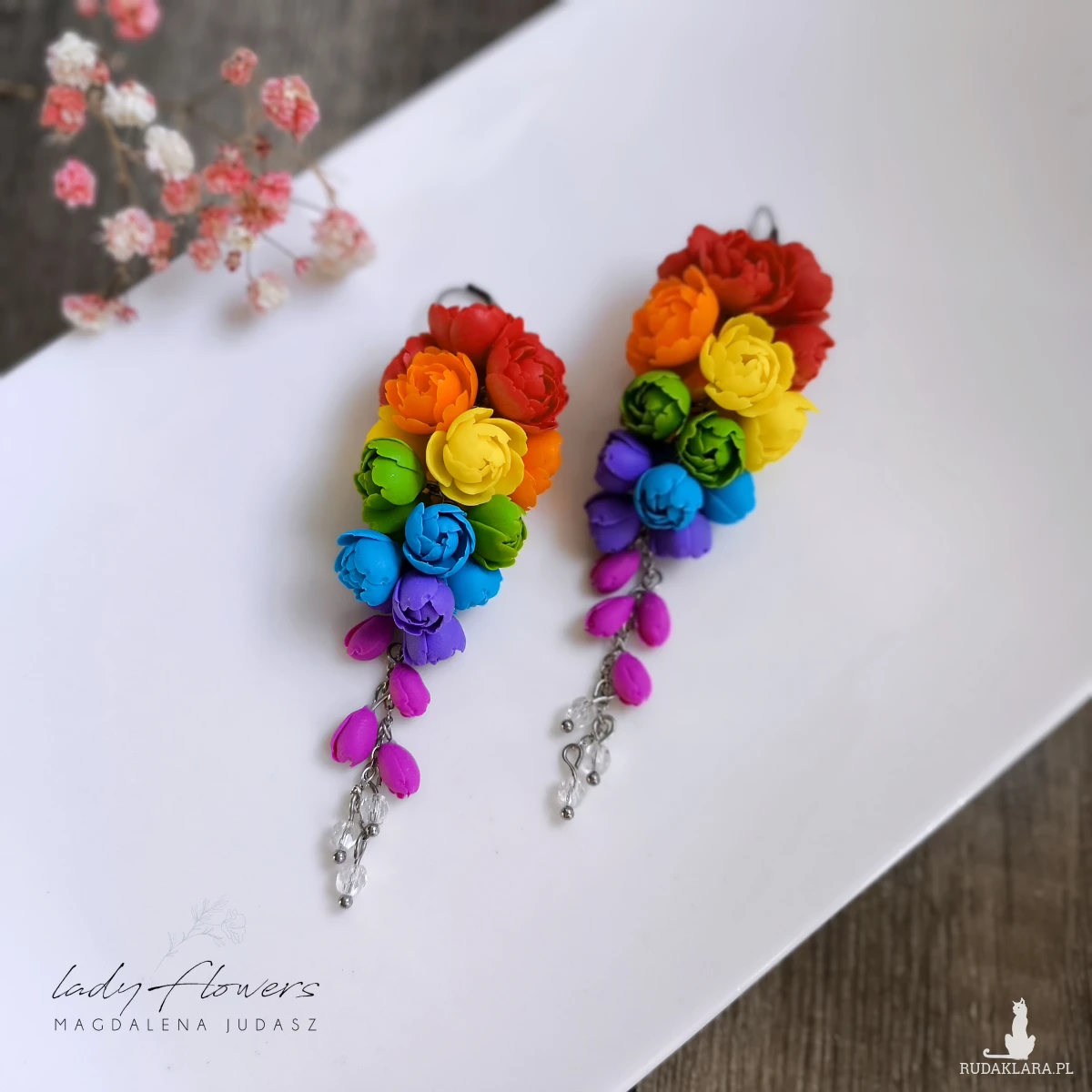 Kolczyki z kolorowymi kwiatami wykonane z dbałością o każdy szczegół z profesjonalnej masy termoutwardzalnej marki Fimo.