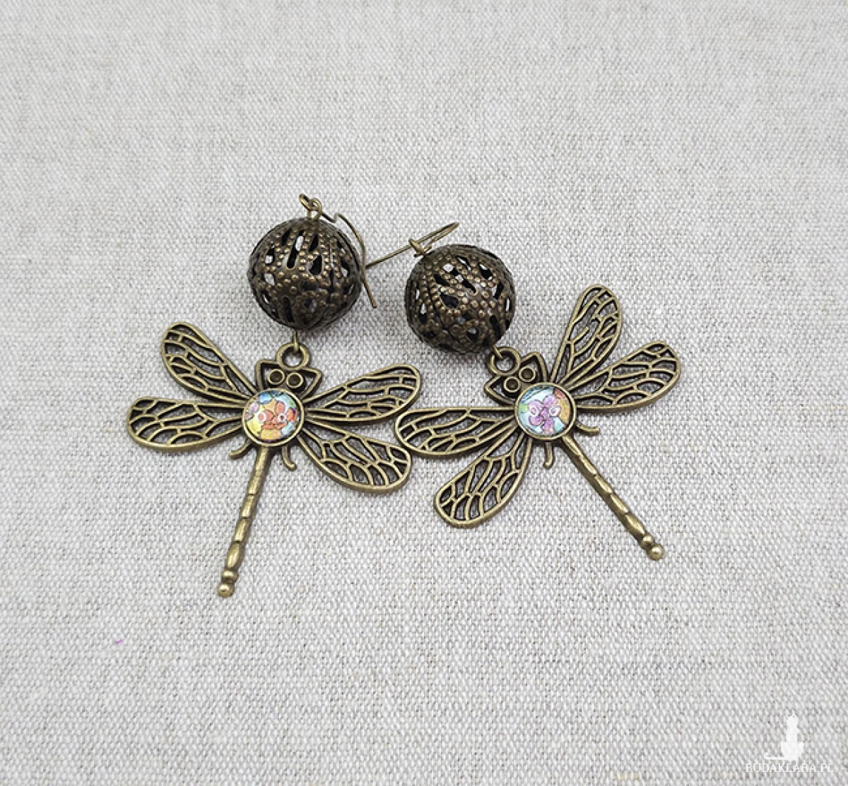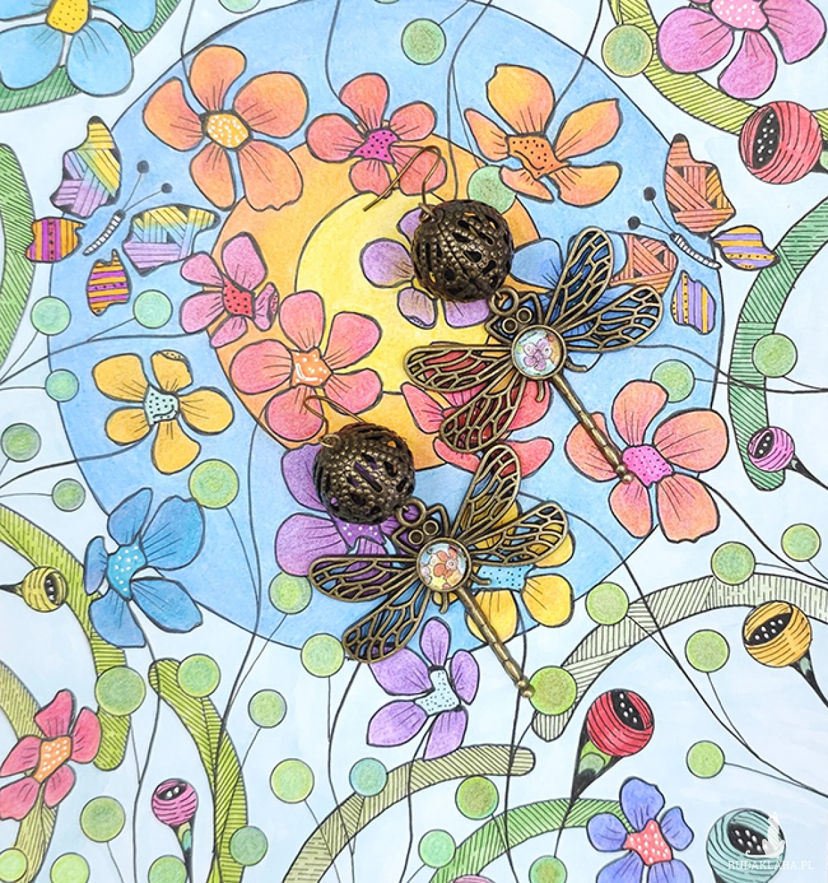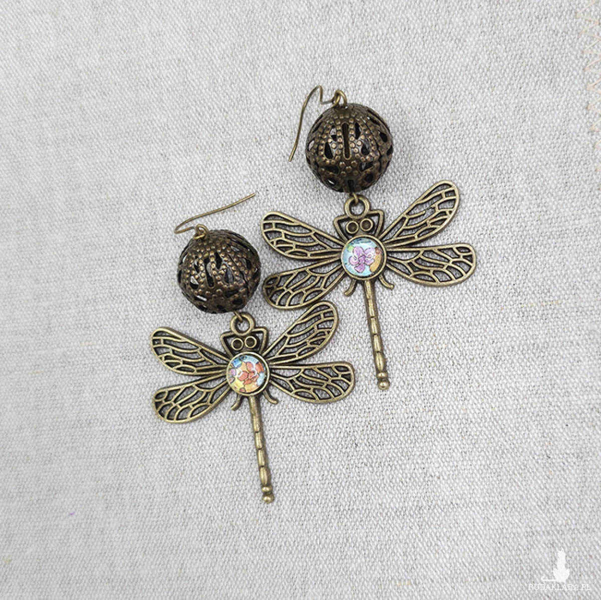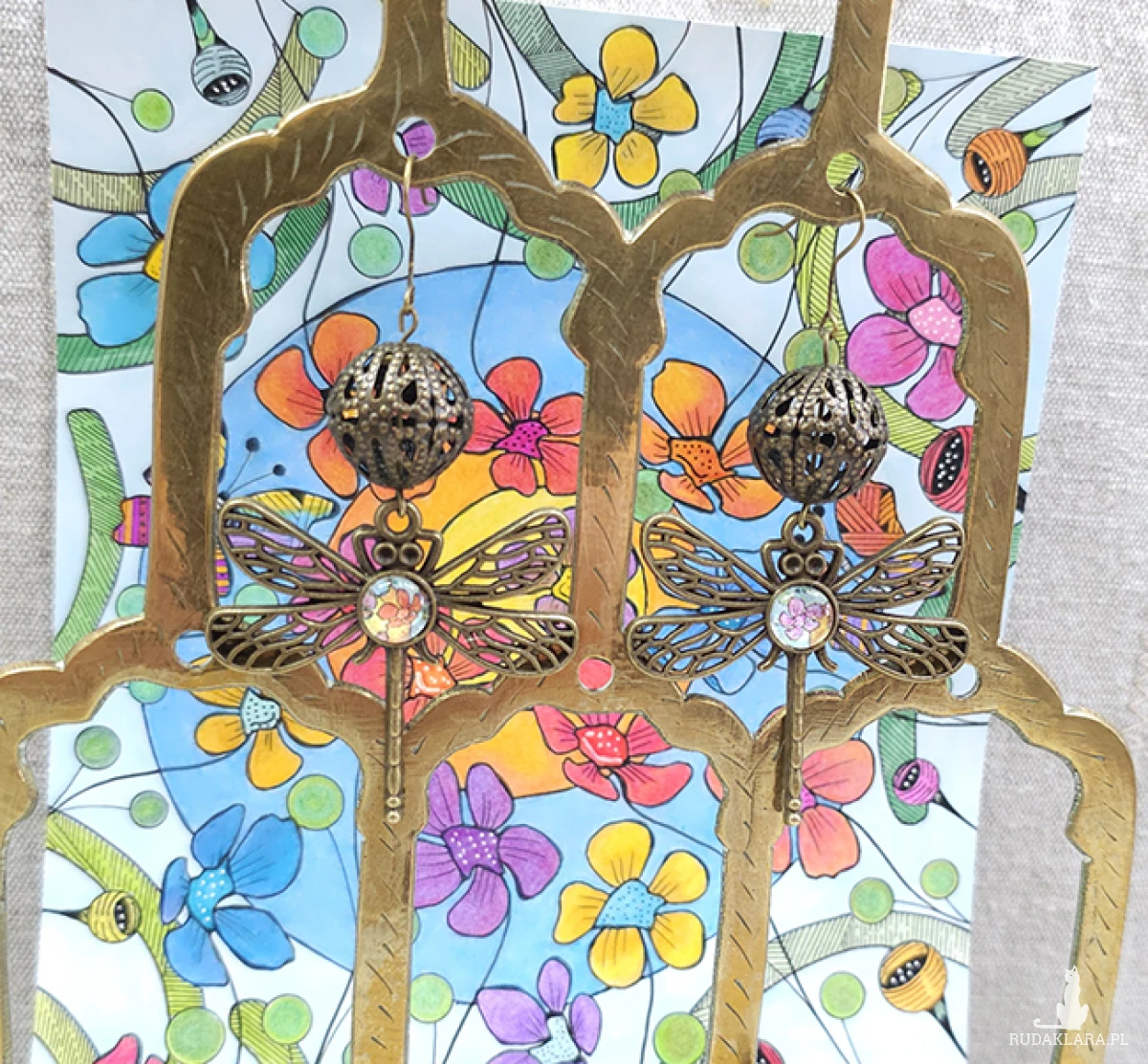 Kolczyki wykonane z metalowych elementów w kolorze starego mosiądzu i fragmentu rysunku mojego autorstwa ukrytego za szkłem.