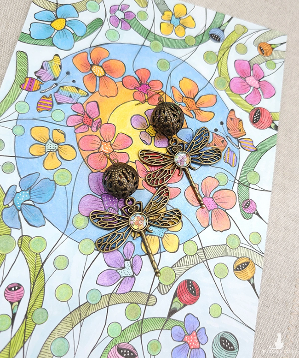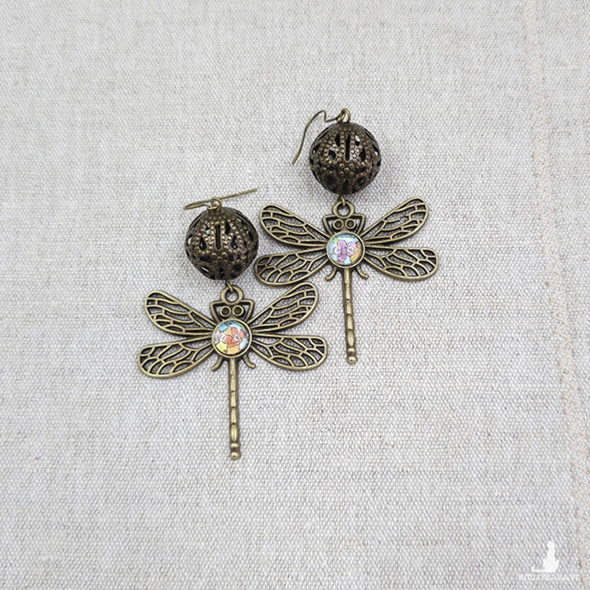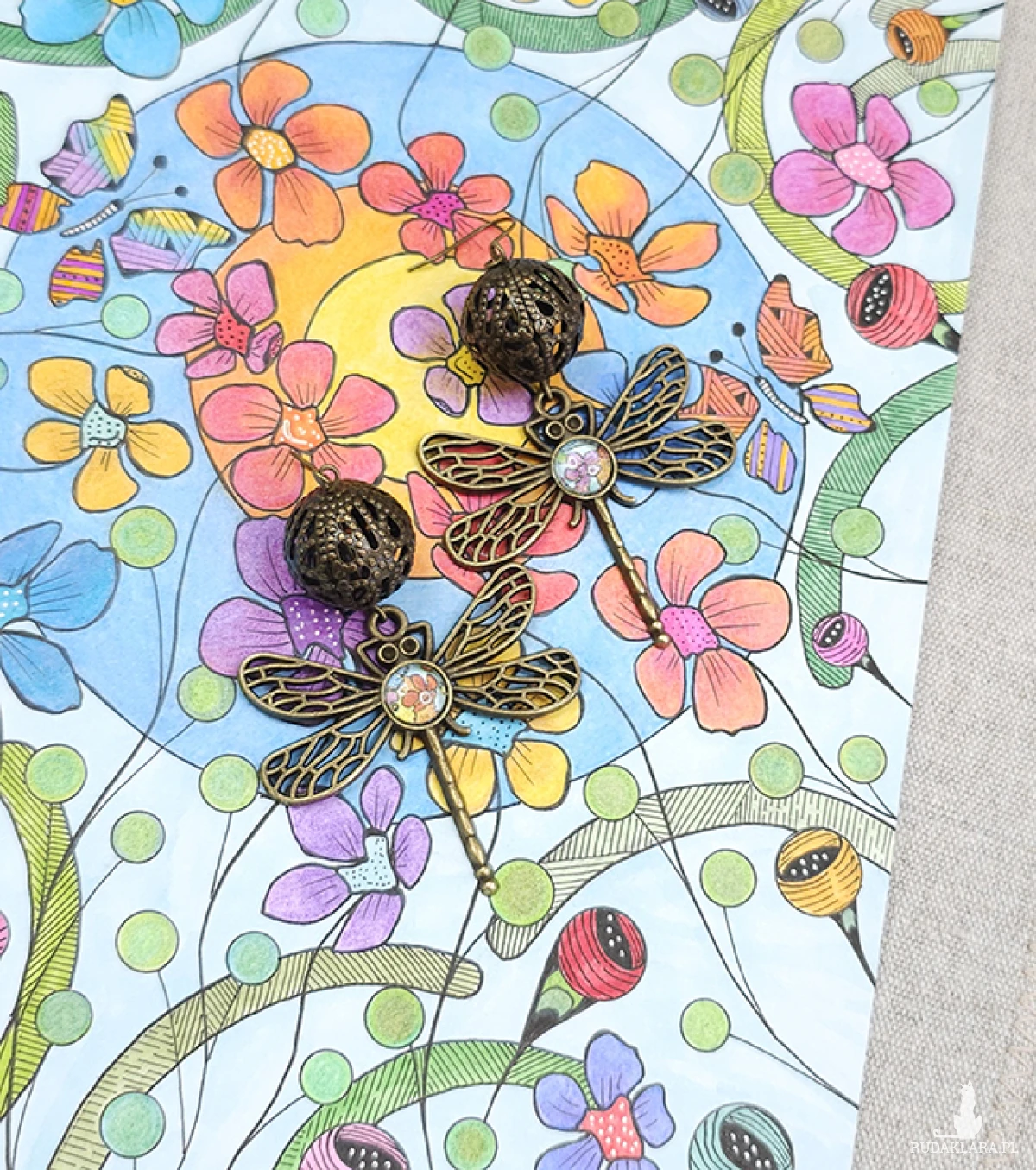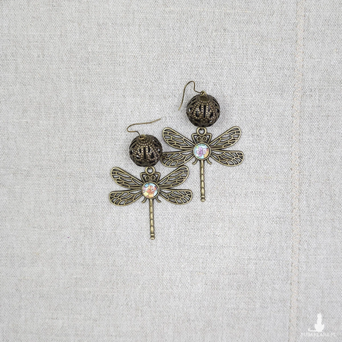 Kolczyki wykonane z metalowych elementów w kolorze starego mosiądzu i fragmentu rysunku mojego autorstwa ukrytego za szkłem.