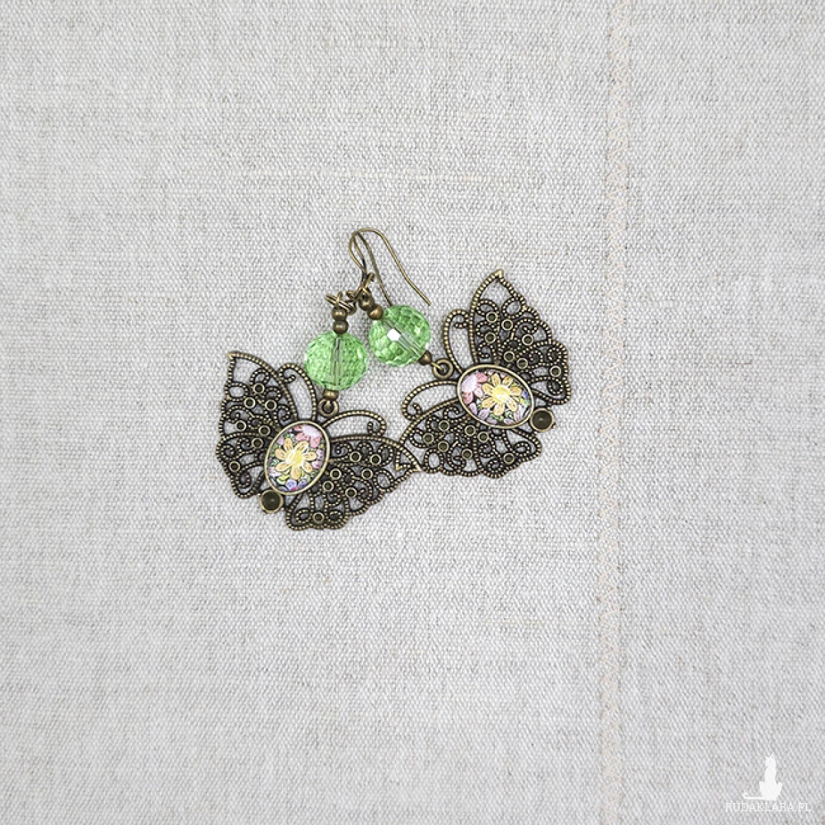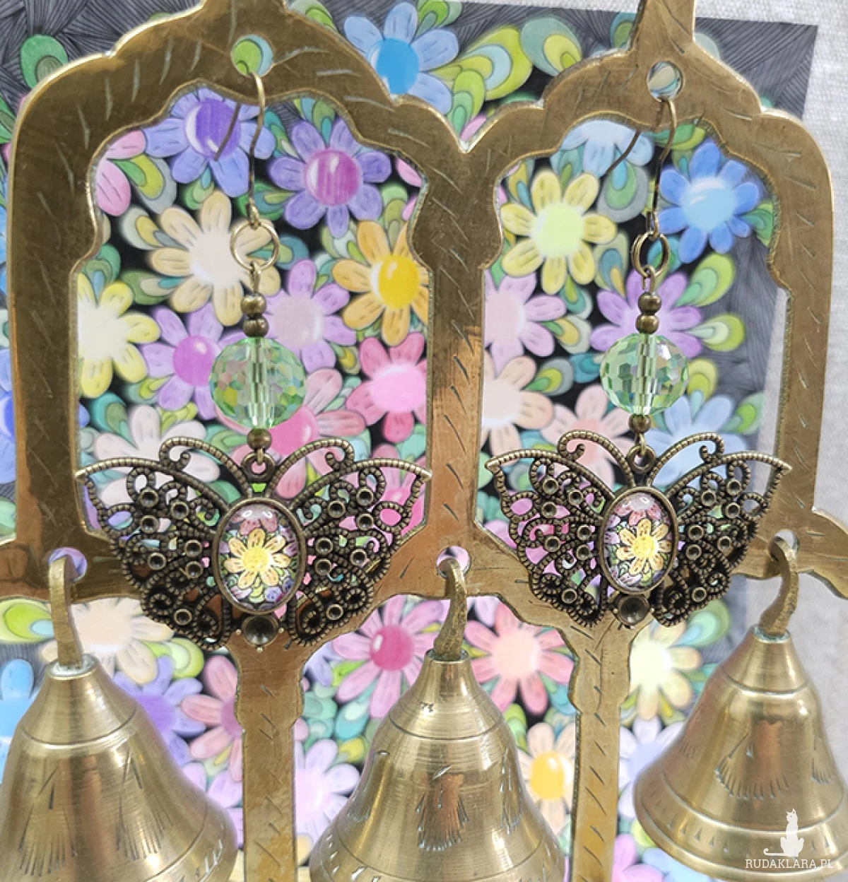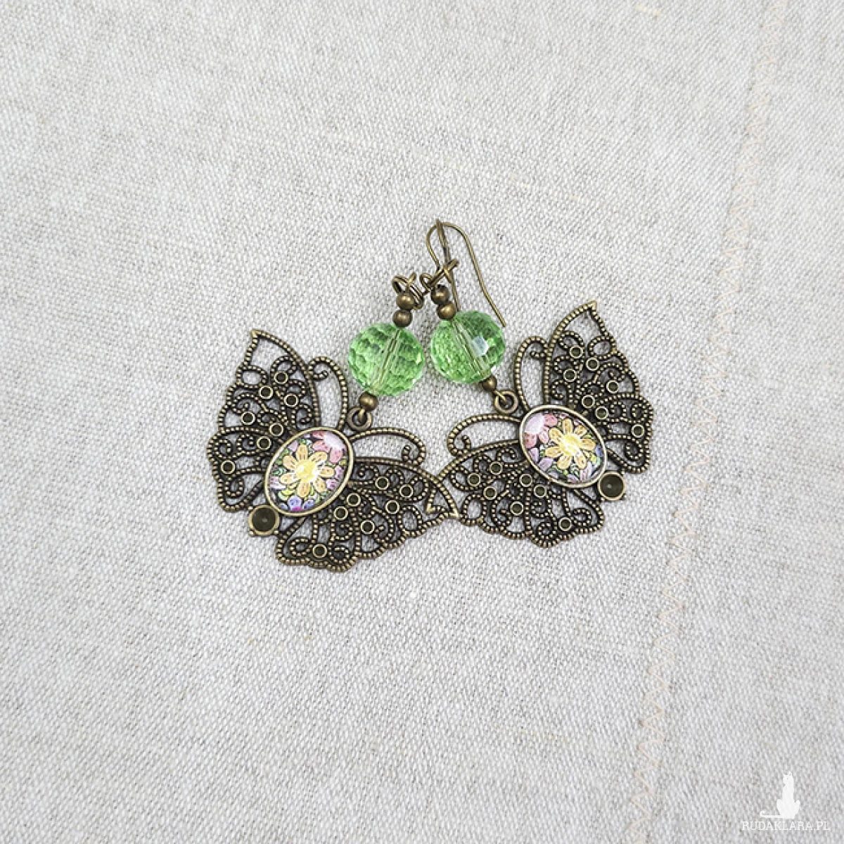 Kolczyki wykonane z metalowych elementów w kolorze starego mosiądzu, fasetowanych, szklanych korali i fragmentu rysunku mojego autorstwa ukrytego za szkłem.