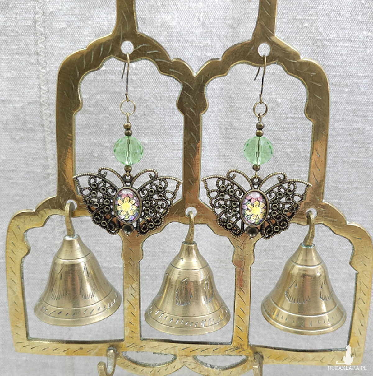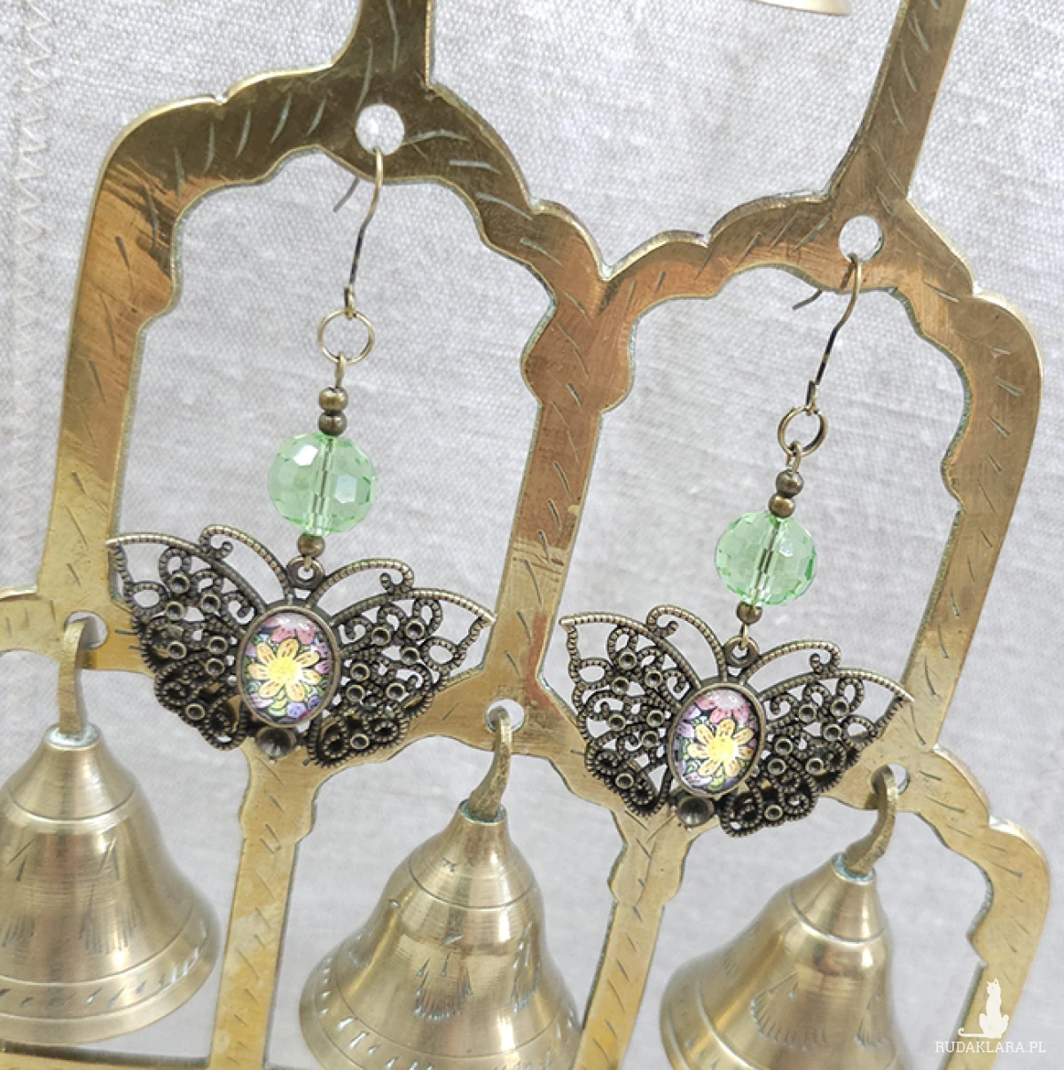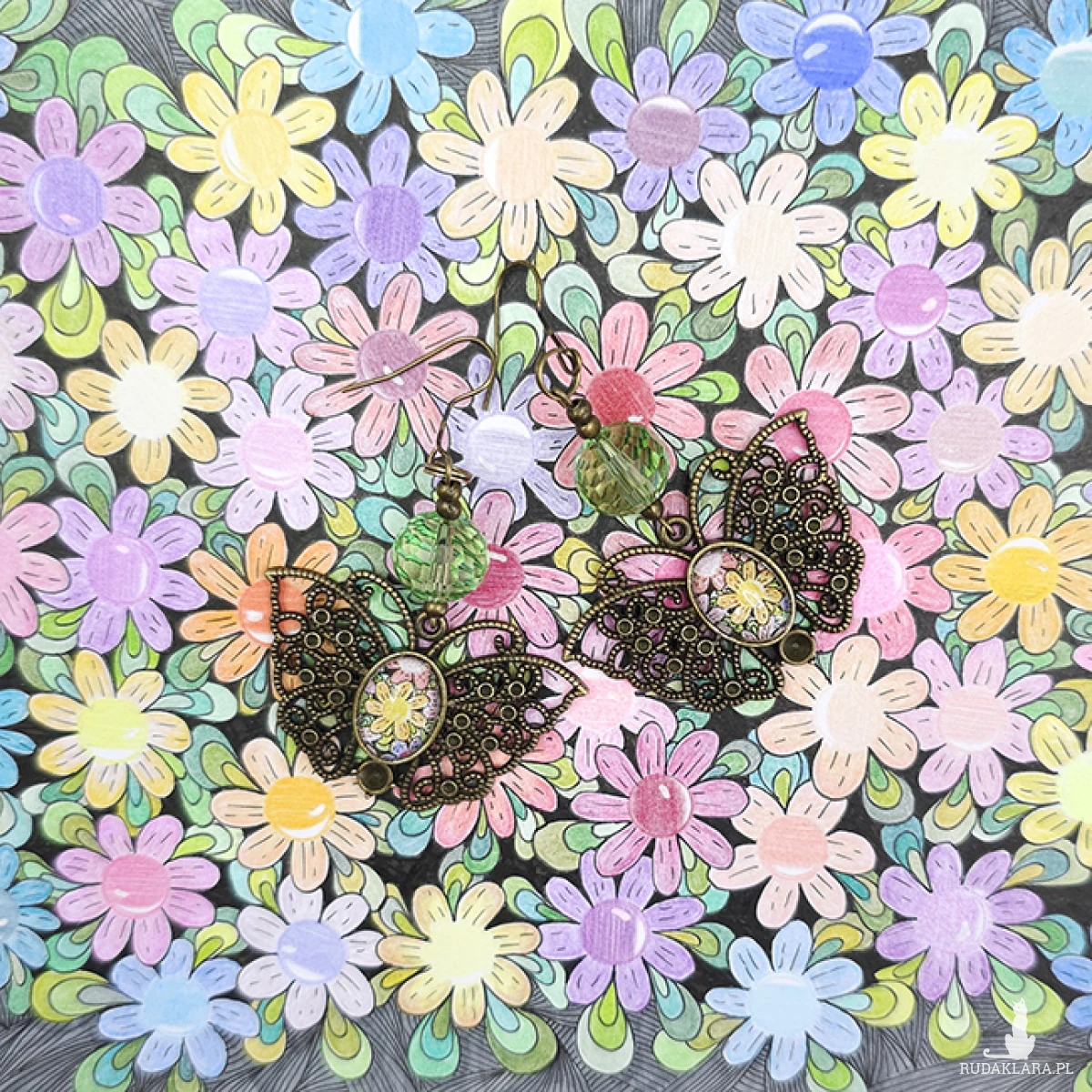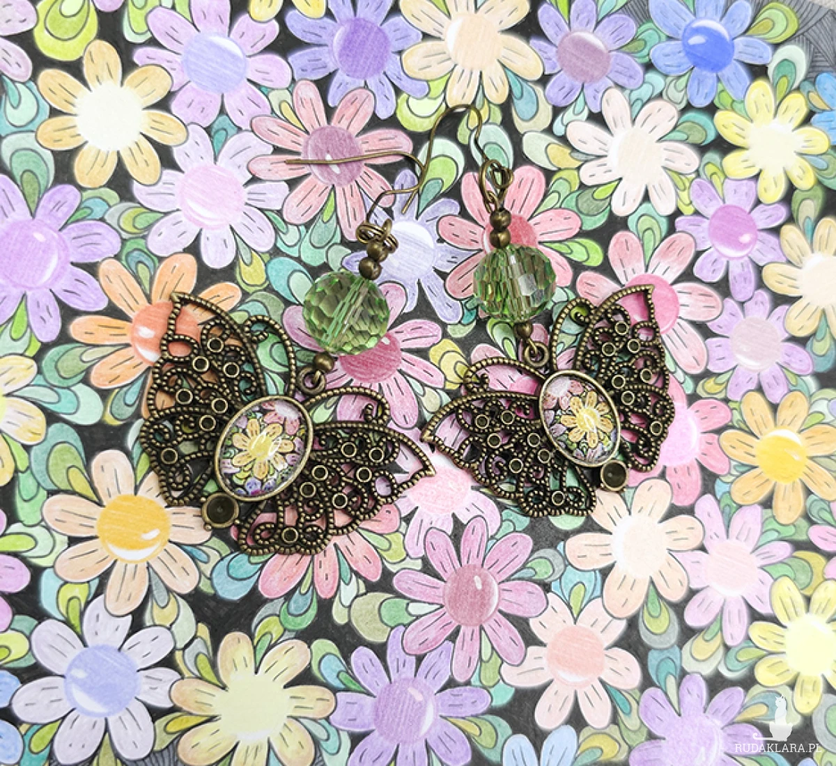Kolczyki wykonane z metalowych elementów w kolorze starego mosiądzu, fasetowanych, szklanych korali i fragmentu rysunku mojego autorstwa ukrytego za szkłem.