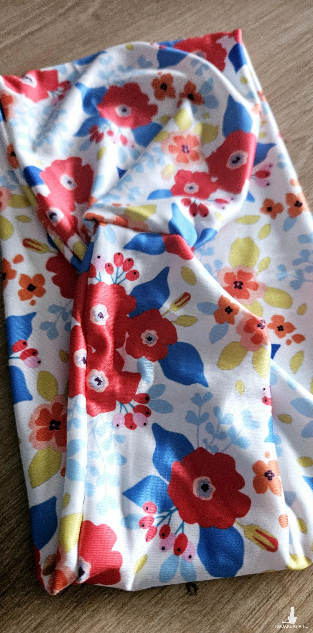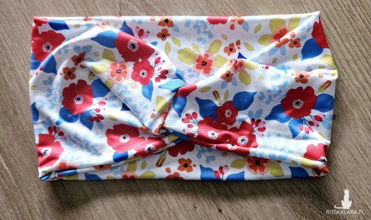 Oto opis kolorowej, ręcznie szytej opaski na głowę z dzianiny: