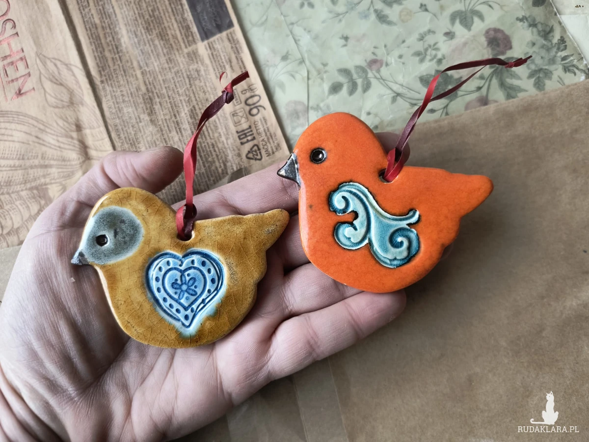 Zestaw złożony z 2 ptasząt do powieszenia na rarfii. Wykonany z gliny szamotowej, wypalony na biskwit, a następnie szkliwiony w temperaturze 1260 stopni C, o wymiarach ok 4,5 cm x 7 cm. Idealnie sprawdzą się jako prezent okolicznościowy lub ozdoba domu.