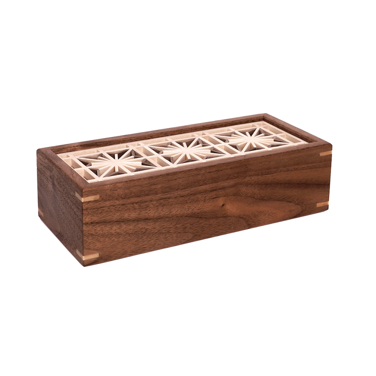 Szkatułka na biżuterię drewniana z wzorem Kumiko Asa no ha w wariancie „dark” to doskonały sposób na dodanie wnętrzu elegancji i szyku. Sprawdzi się także doskonale jako pomysł na wyjątkowy prezent dla osób ceniących piękno naturalnych materiałów i oryginalność w japońskim klimacie.