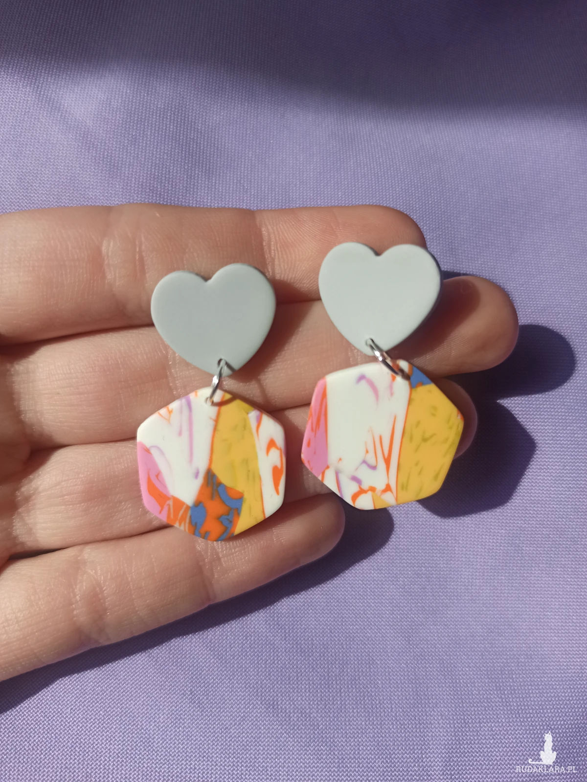 Kolczyki wiszące sztyfty w kształcie połączonych ze sobą szarego serca i wzorzystego sześciokąta.