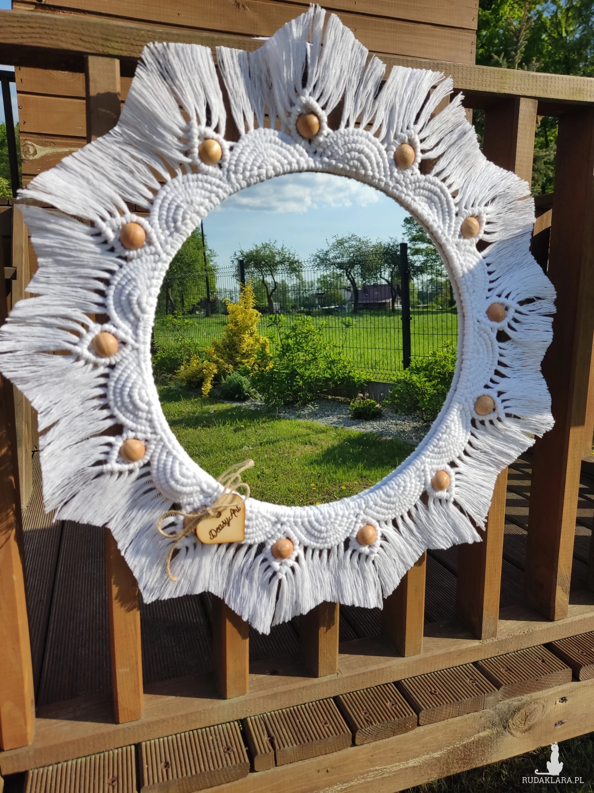 Sprzedam nowe ręcznie wykonane makramowe lustro w stylu Boho. Średnica całości wynosi 50 cm natomiast średnica samego lustra wynosi 30 cm.