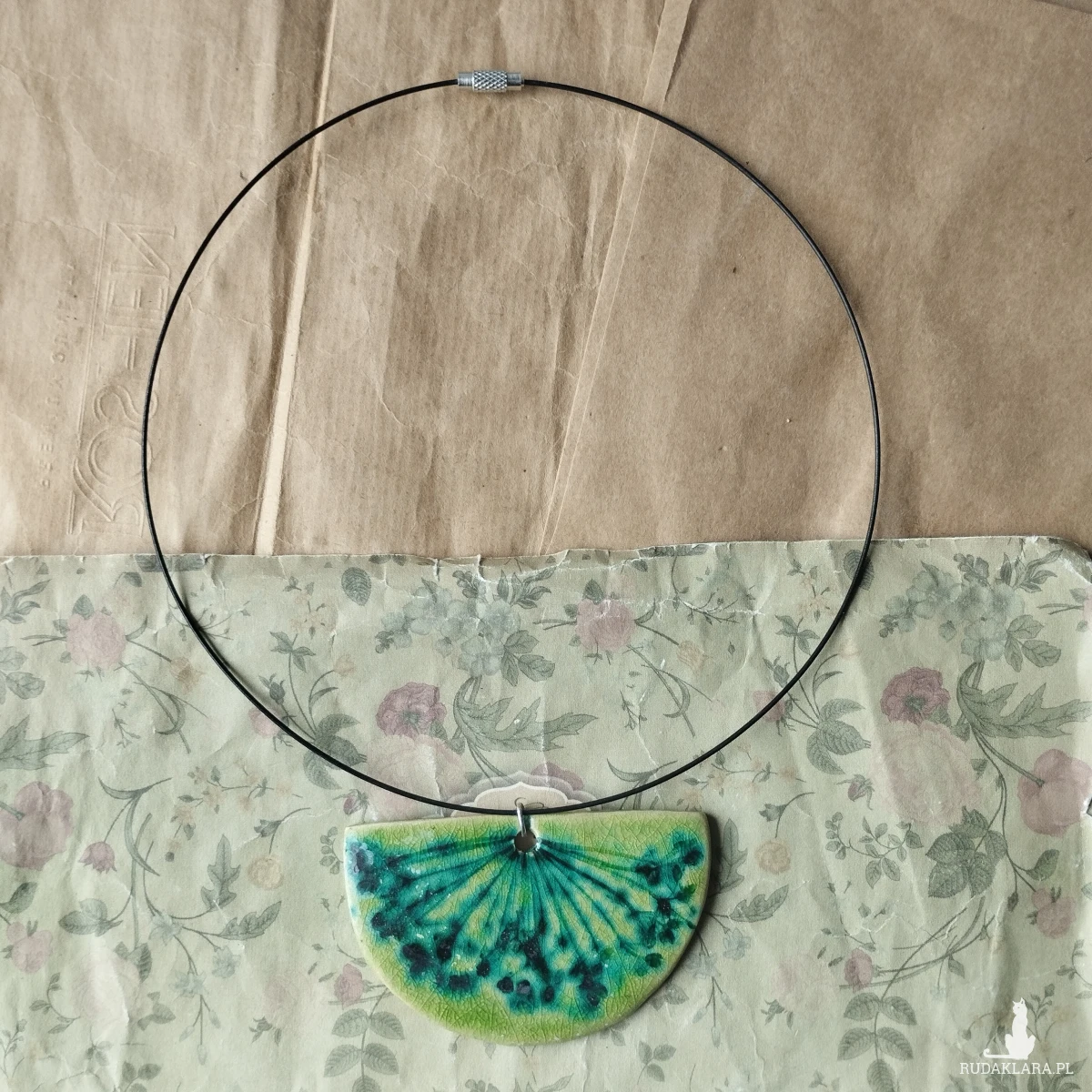 Naszyjnik w kolorze szmaragdowym wykonany z gliny szamotowej, wypalony na biskwit, a następnie szkliwiony w temperaturze 1260 stopni C. Wymiary wisiora: ok. 4,5 cm x 7 cm. Na drucianej kolii. W ciekawym zestawieniu kolorystycznym. Serdecznie polecam wszystkim Paniom poszukującym nietuzinkowej biżuterii!