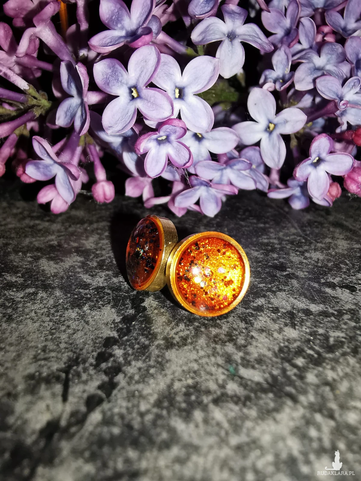 Drobne kolczyki stalowe, ręcznie wypełnione żywicą epoksydową i brokatami.