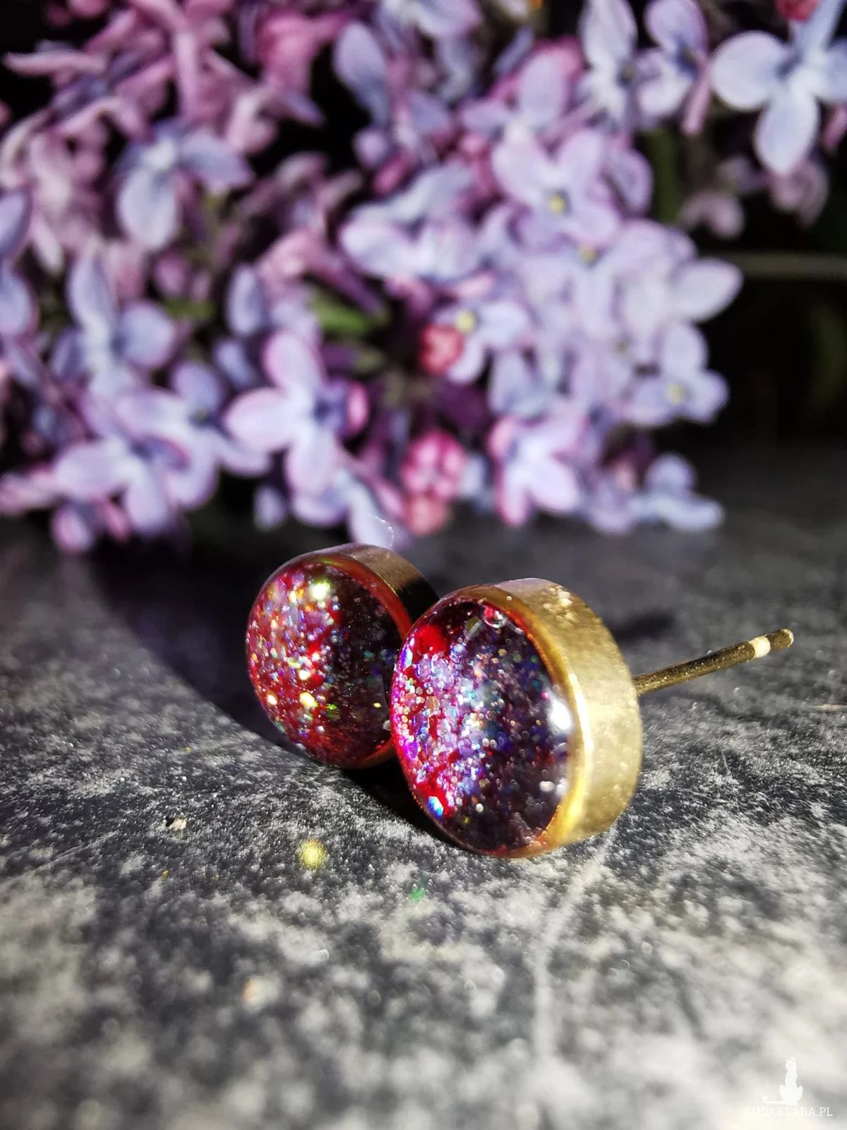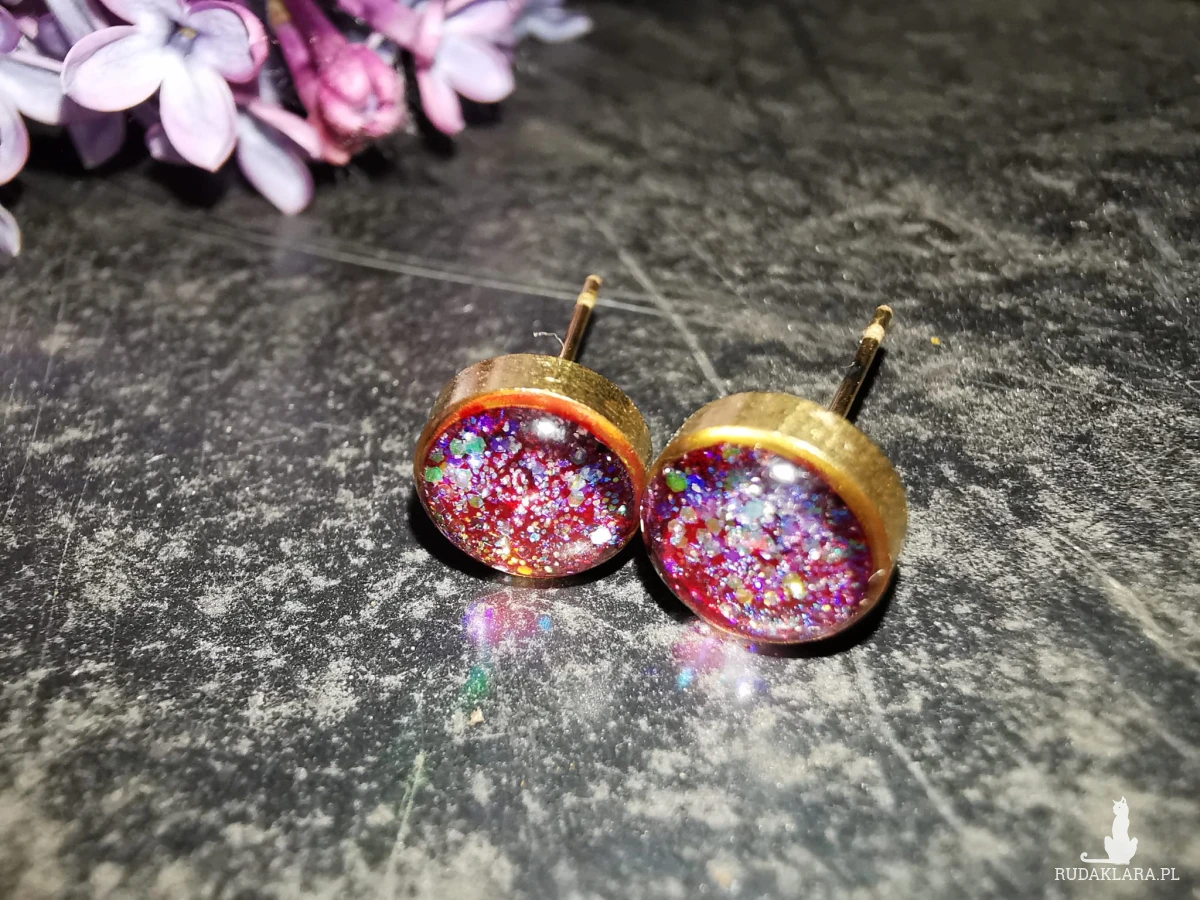 Drobne kolczyki stalowe, ręcznie wypełnione żywicą epoksydową i brokatami.