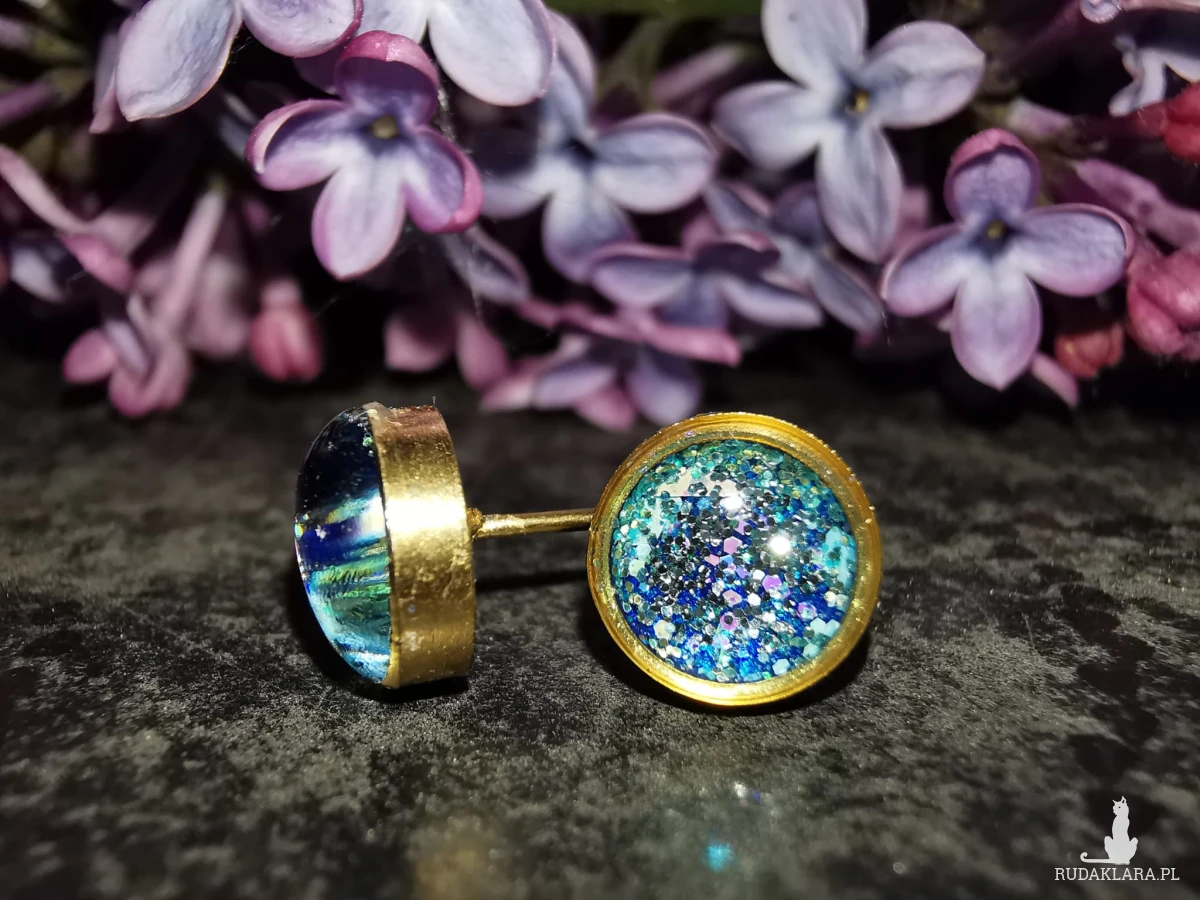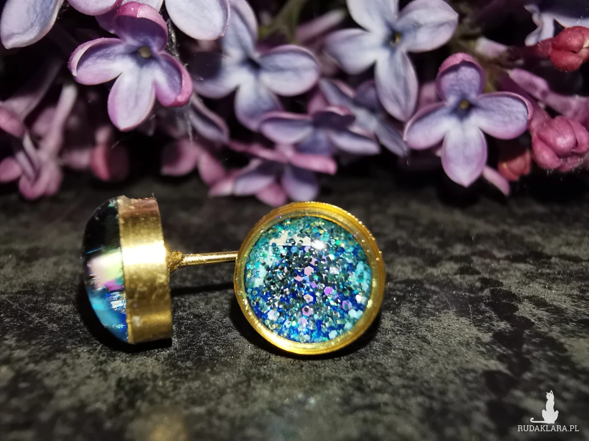 Drobne kolczyki stalowe, ręcznie wypełnione żywicą epoksydową i brokatami.