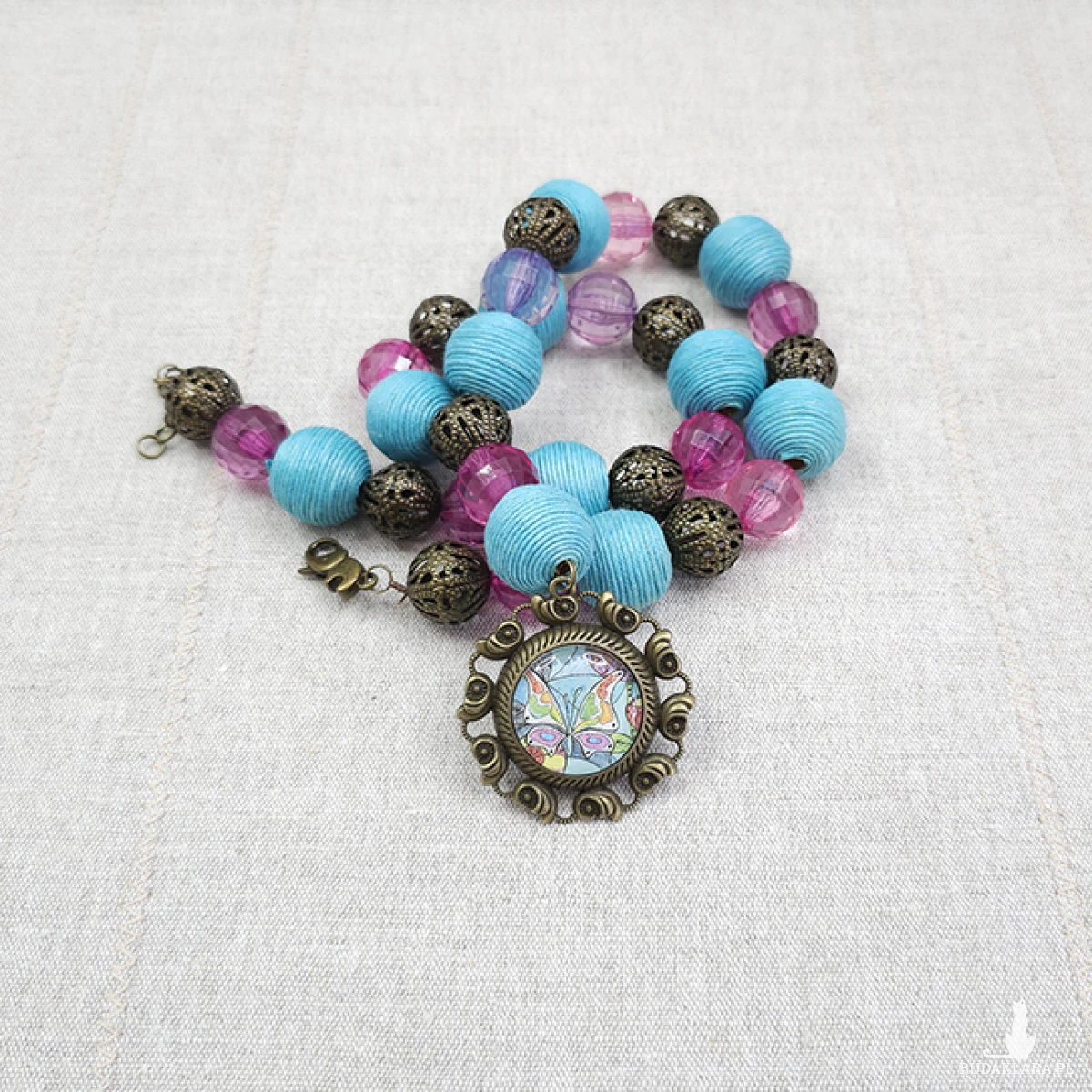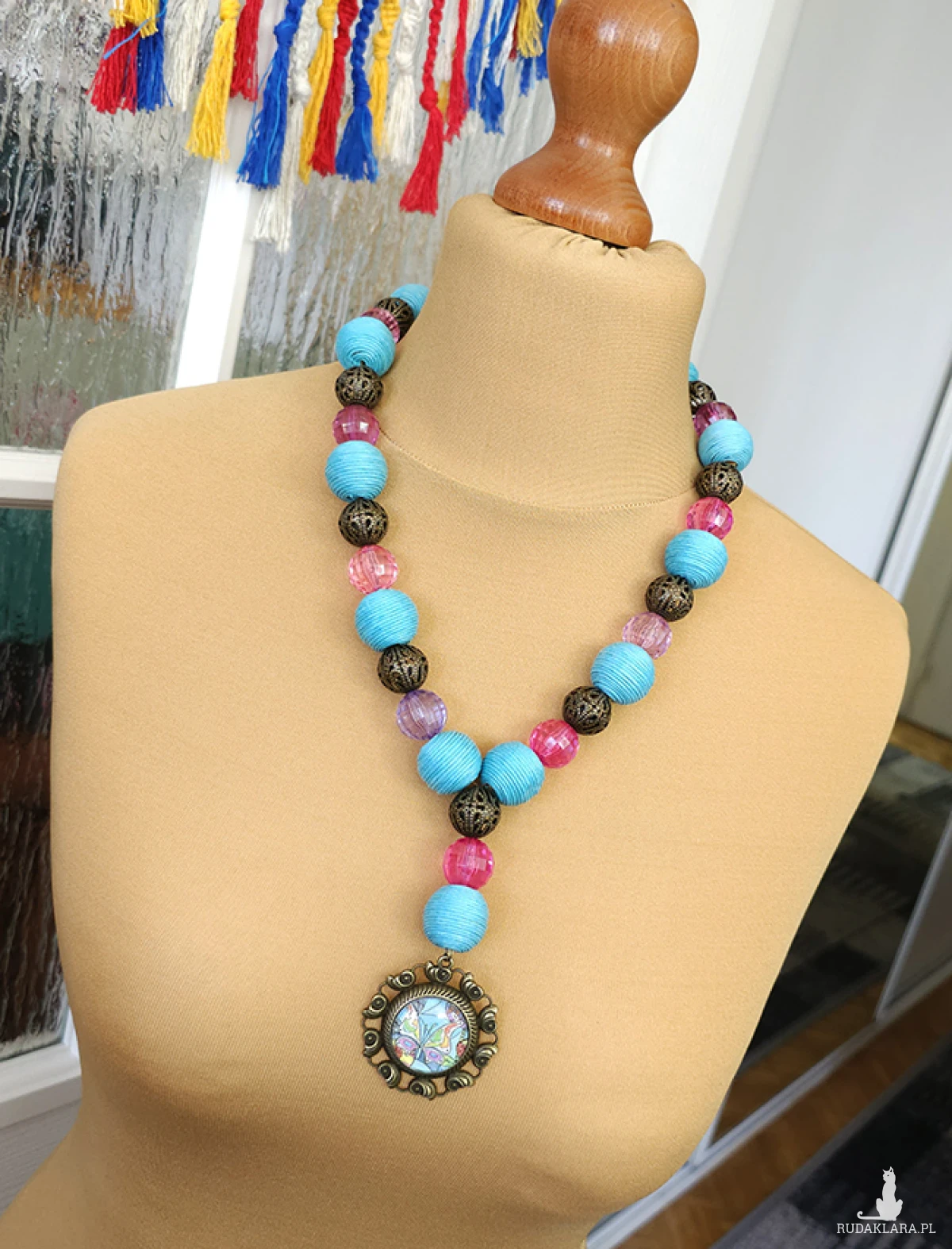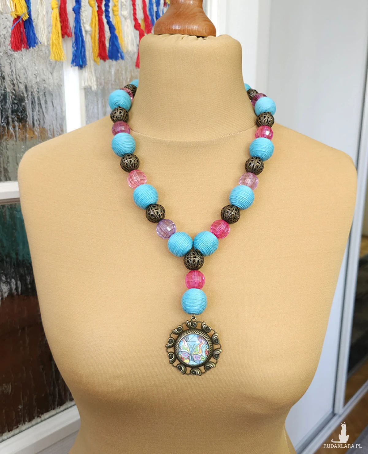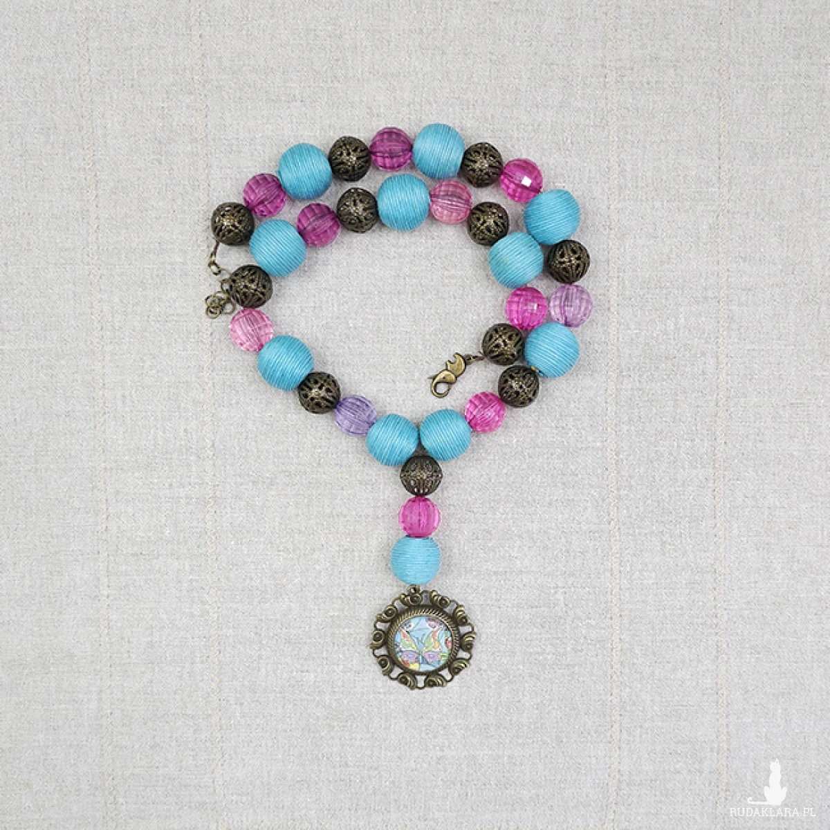6740 duży, niebieski, brązowy, różowy naszyjnik z wisiorkiem; wisiorek motyl