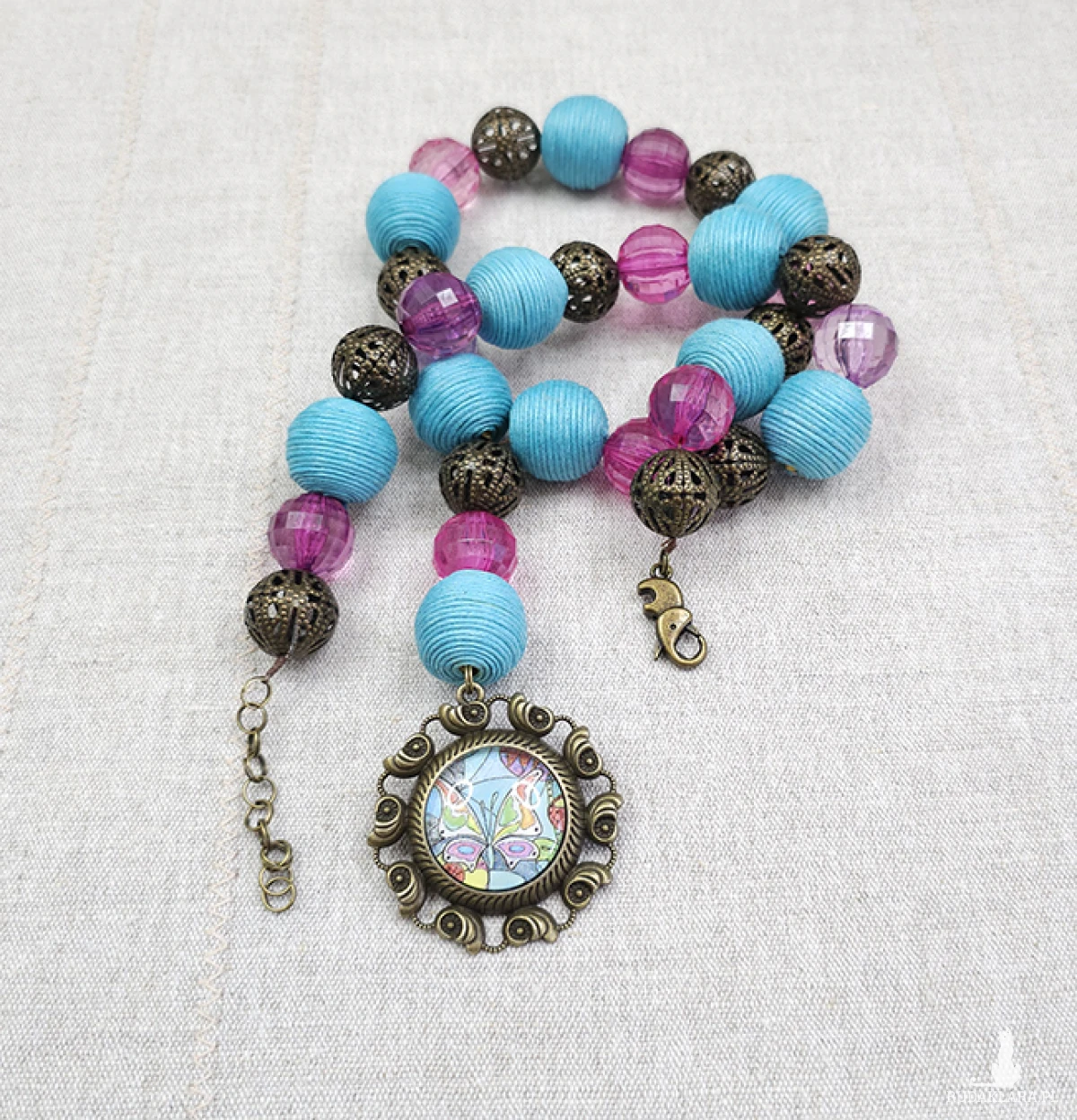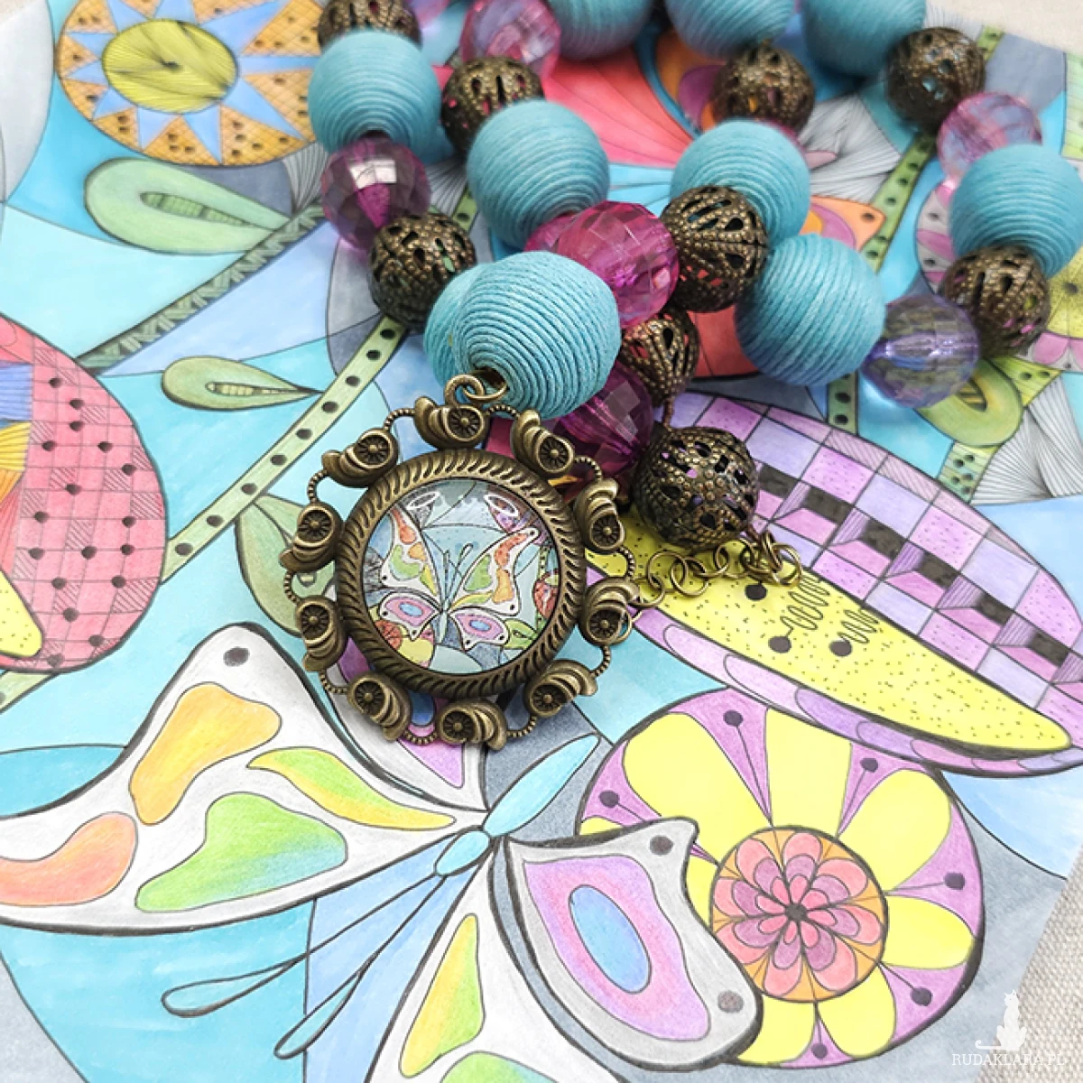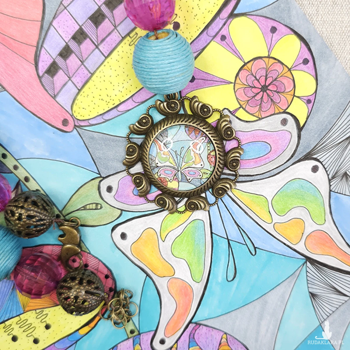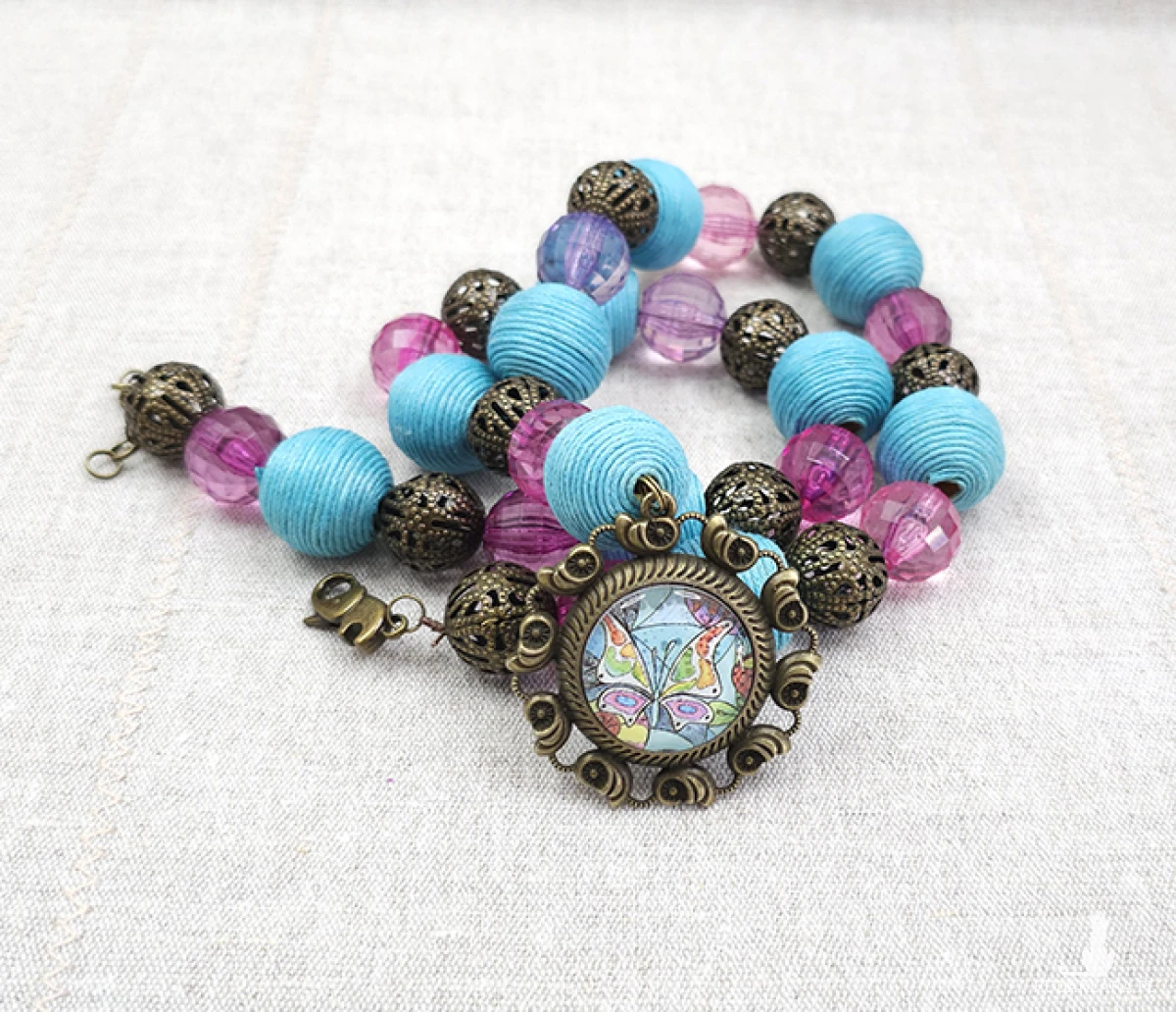 6740 duży, niebieski, brązowy, różowy naszyjnik z wisiorkiem; wisiorek motyl