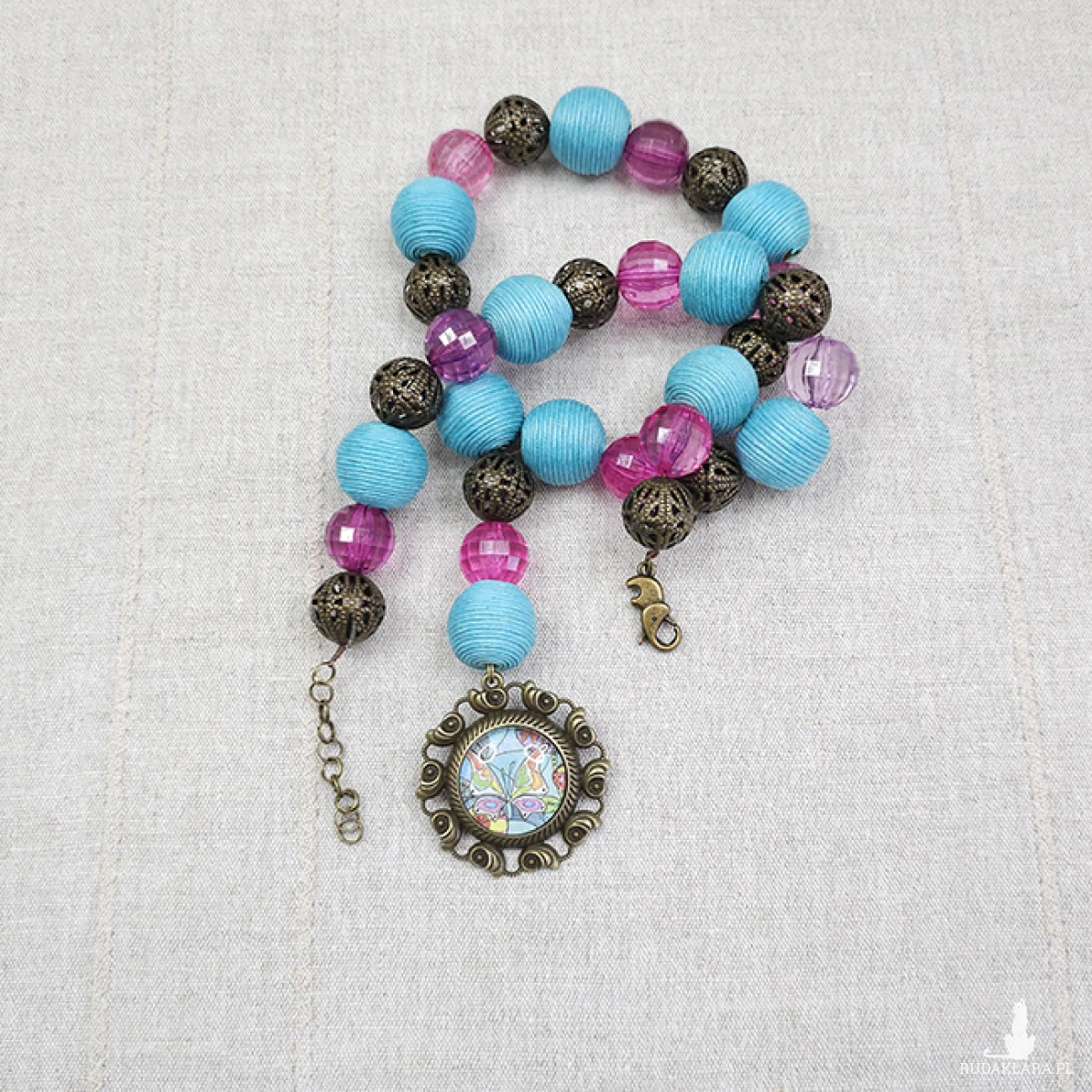 Naszyjnik wykonany z akrylowych korali - fasetowanych i oplatanych bawełną (12-16 mm), metalowych, ażurowych korali (14mm) i fragmentu rysunku mojego autorstwa ukrytego za szkłem w wisiorku.