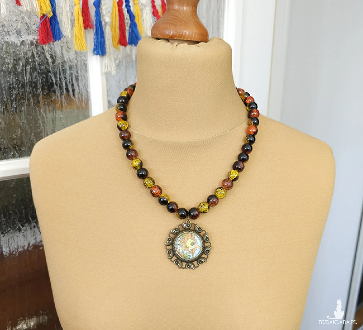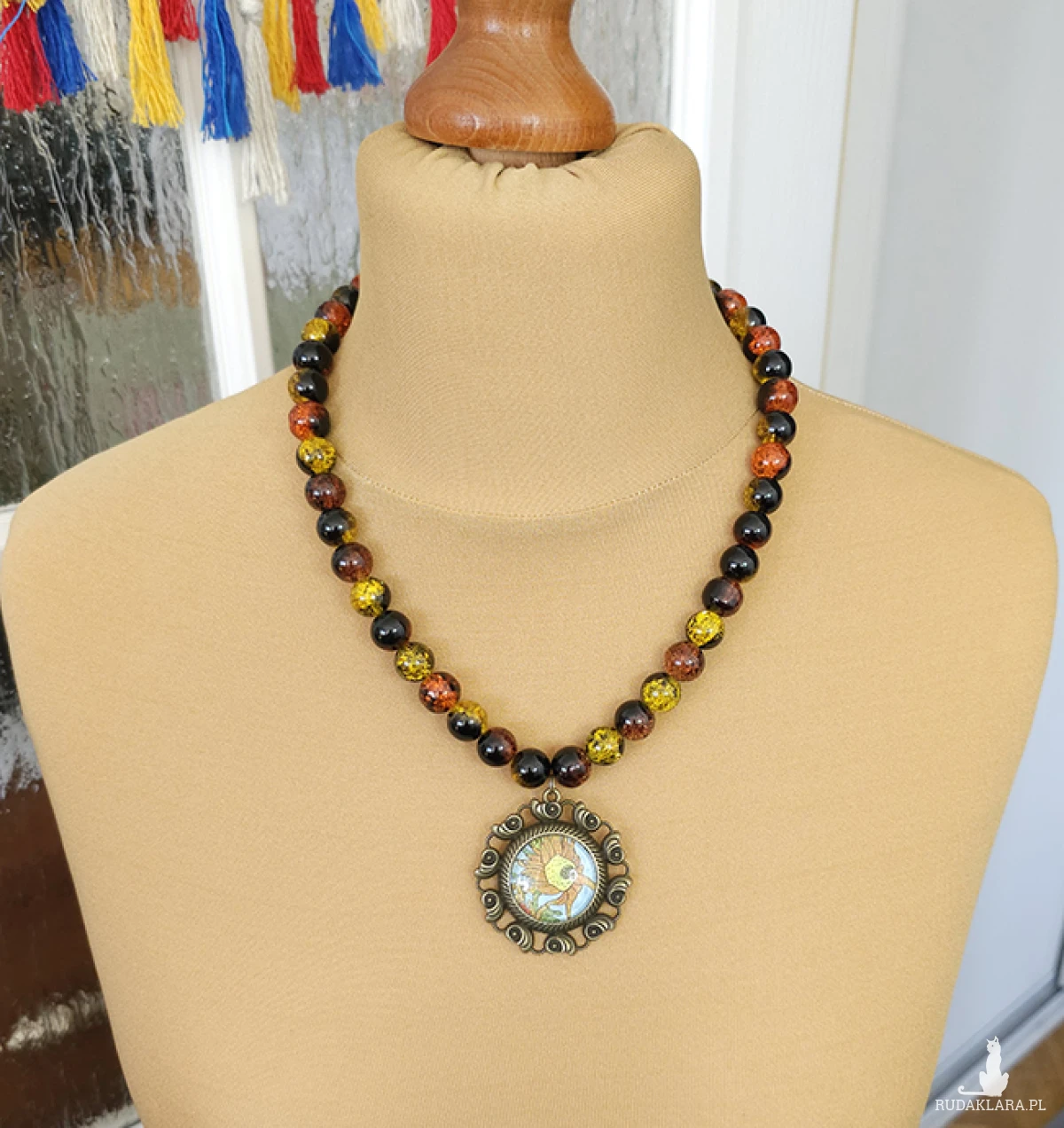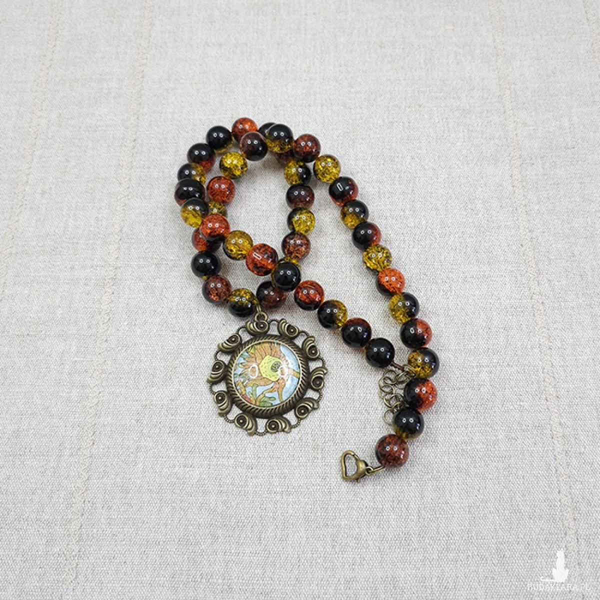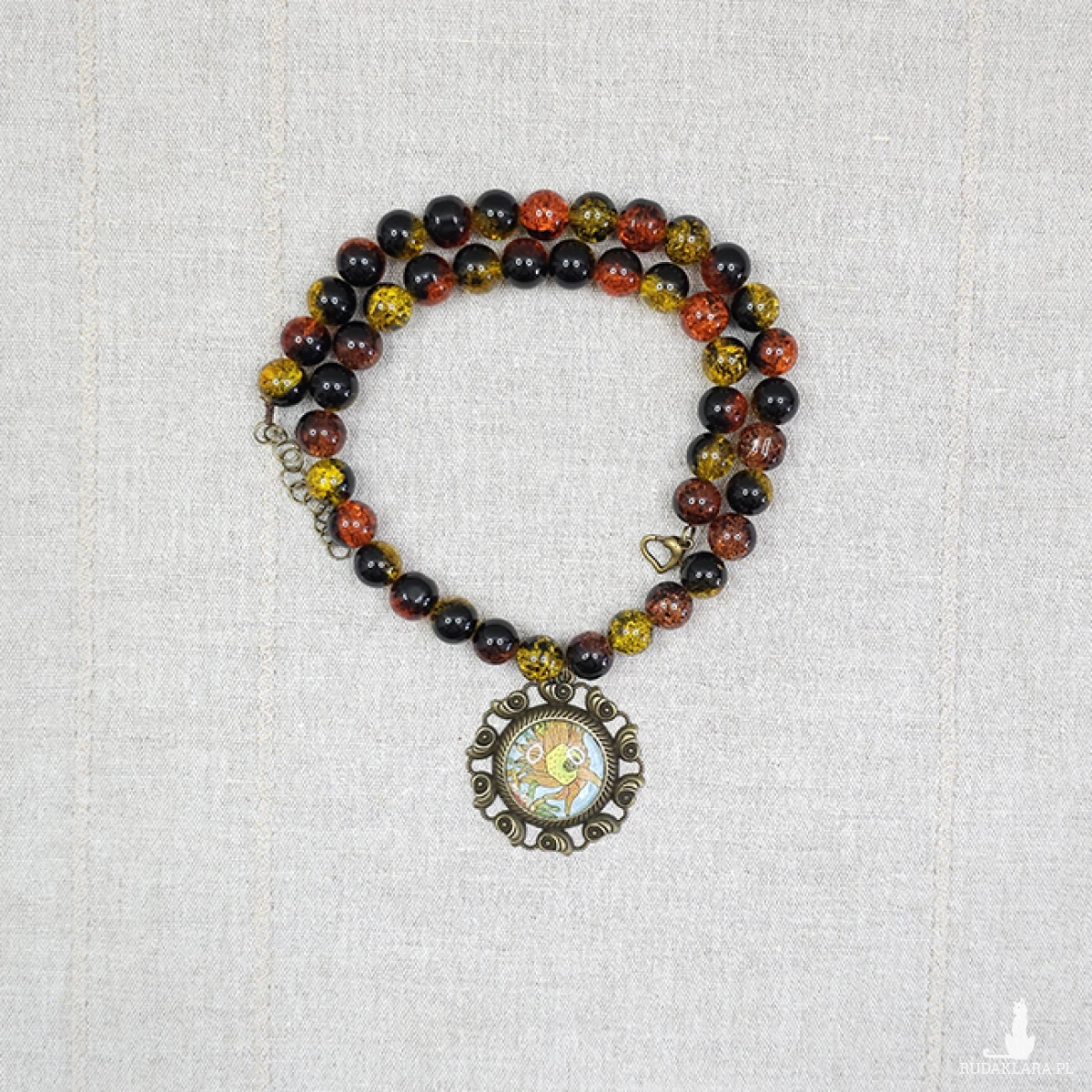 Naszyjnik wykonany ze szklanych korali (12 mm) i fragmentu rysunku mojego autorstwa ukrytego za szkłem w wisiorku.