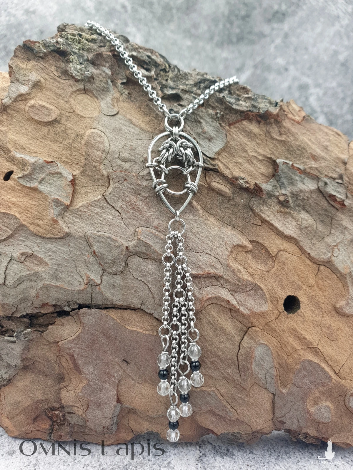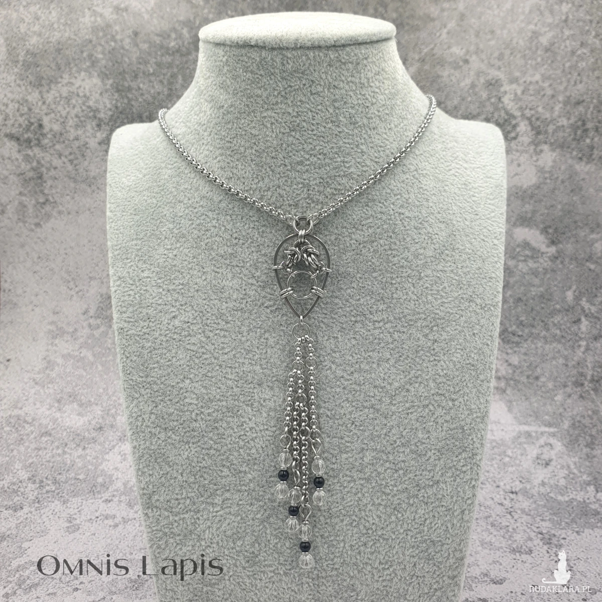 Ozdobiony fasetowanymi kulkami kryształu górskiego i gładkiego onyksu. Naszyjnik wykonany w technice chainmaille, polegającej na łączeniu ogniw w określony splot.