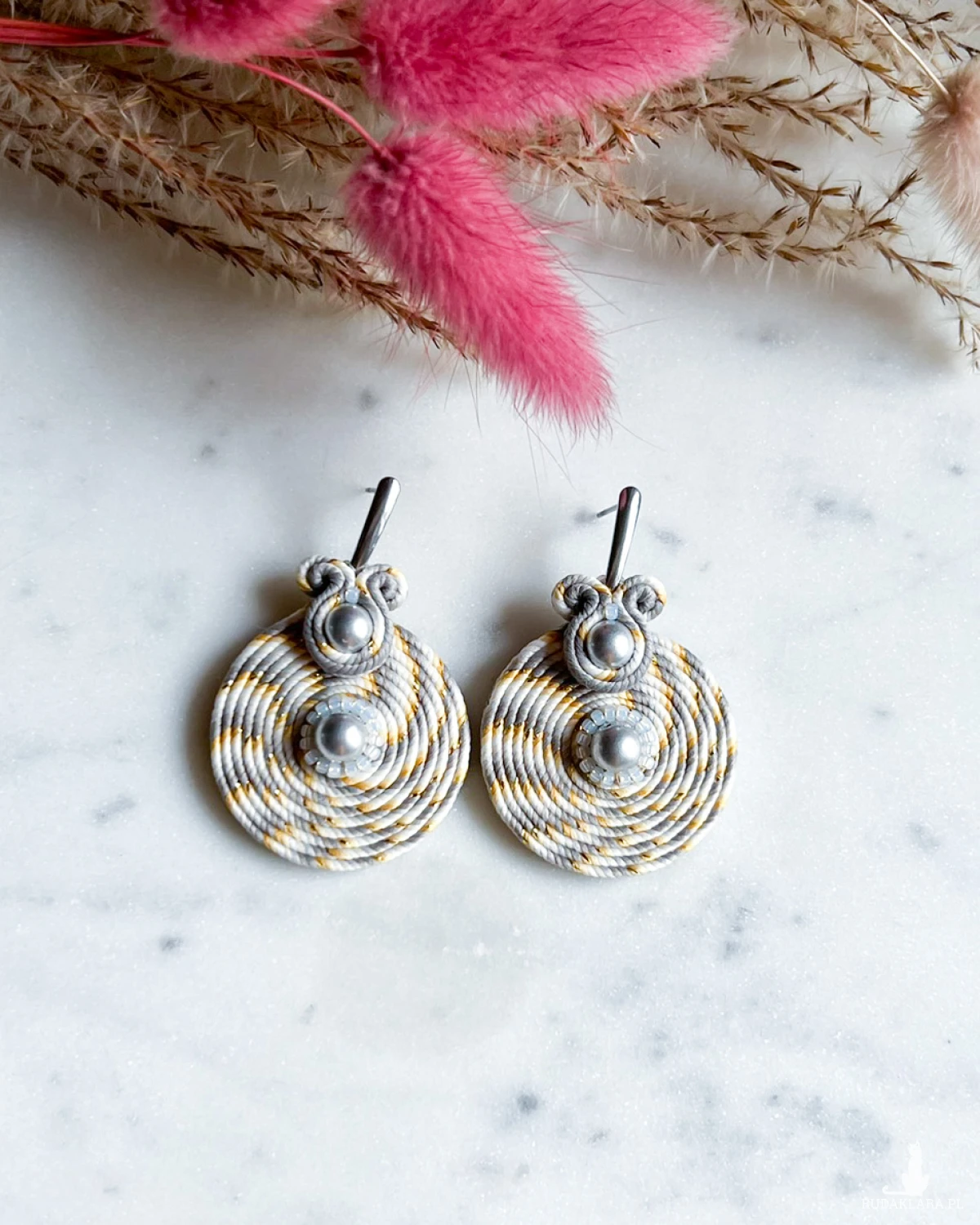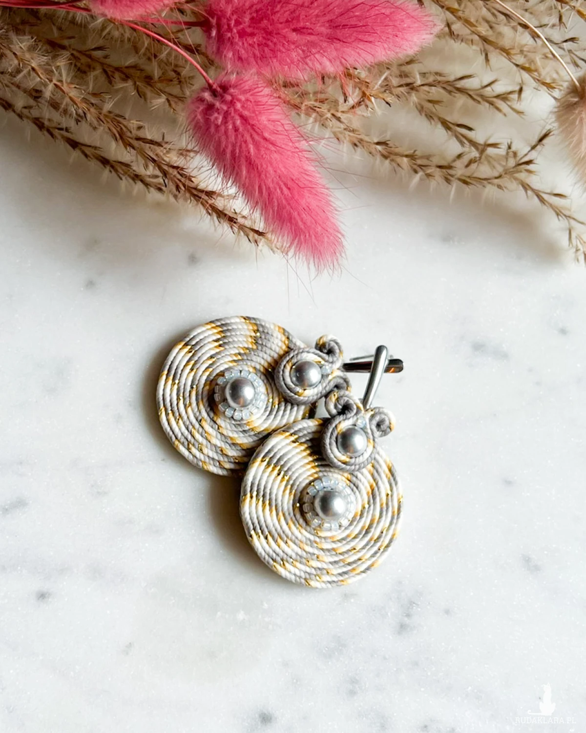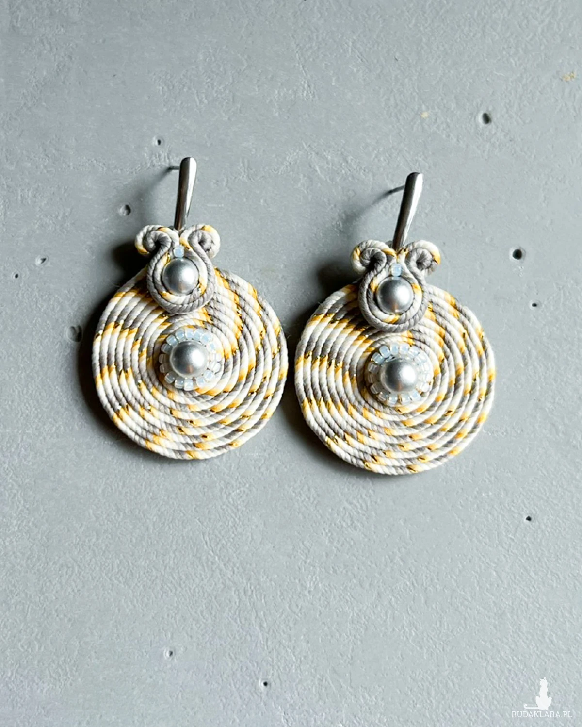 Średniej wielkości, wyjątkowo lekkie kolczyki-ślimaczki z uroczym perłowym oczkiem w kolorze srebra. Kolczyki wykonane są z wielokolorowego pasma sutaszu złożonego z odcieni złamanej bieli i szarości przełamanych nutą żółtego oraz złotą nitką. Dodatek szaro-srebrnych perełek idealnie komponuje się z kolorami "ślimaczka". Ten model jest niezwykle lekki, doskonale sprawdzi się jako uzupełnienie codziennych stylizacji. Kolczyki na sztyfcie ze stali chirurgicznej w kolorze srebrnym.