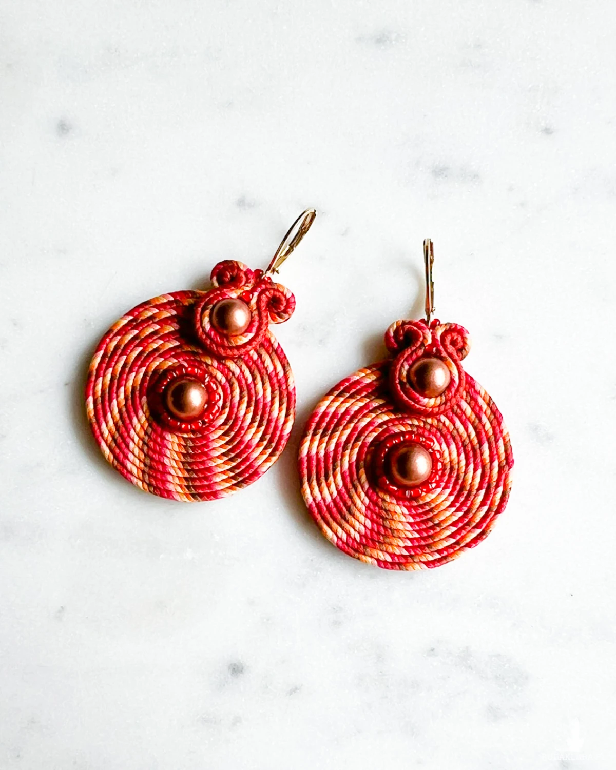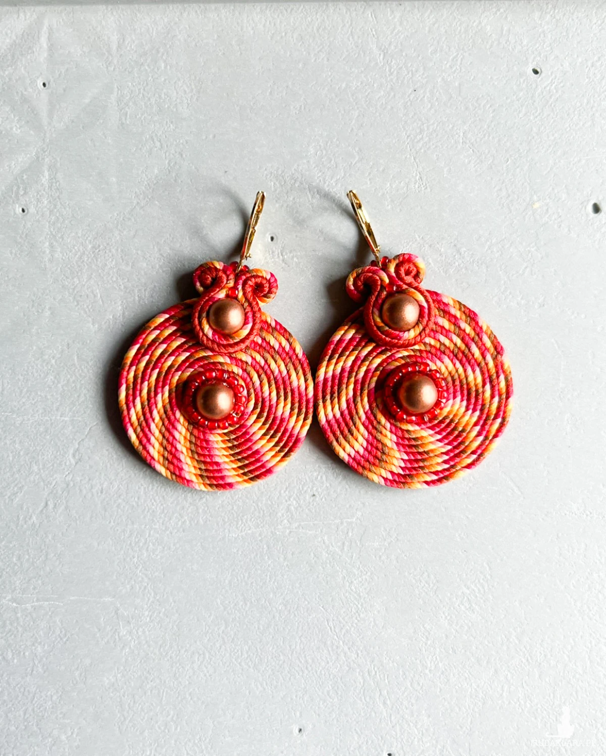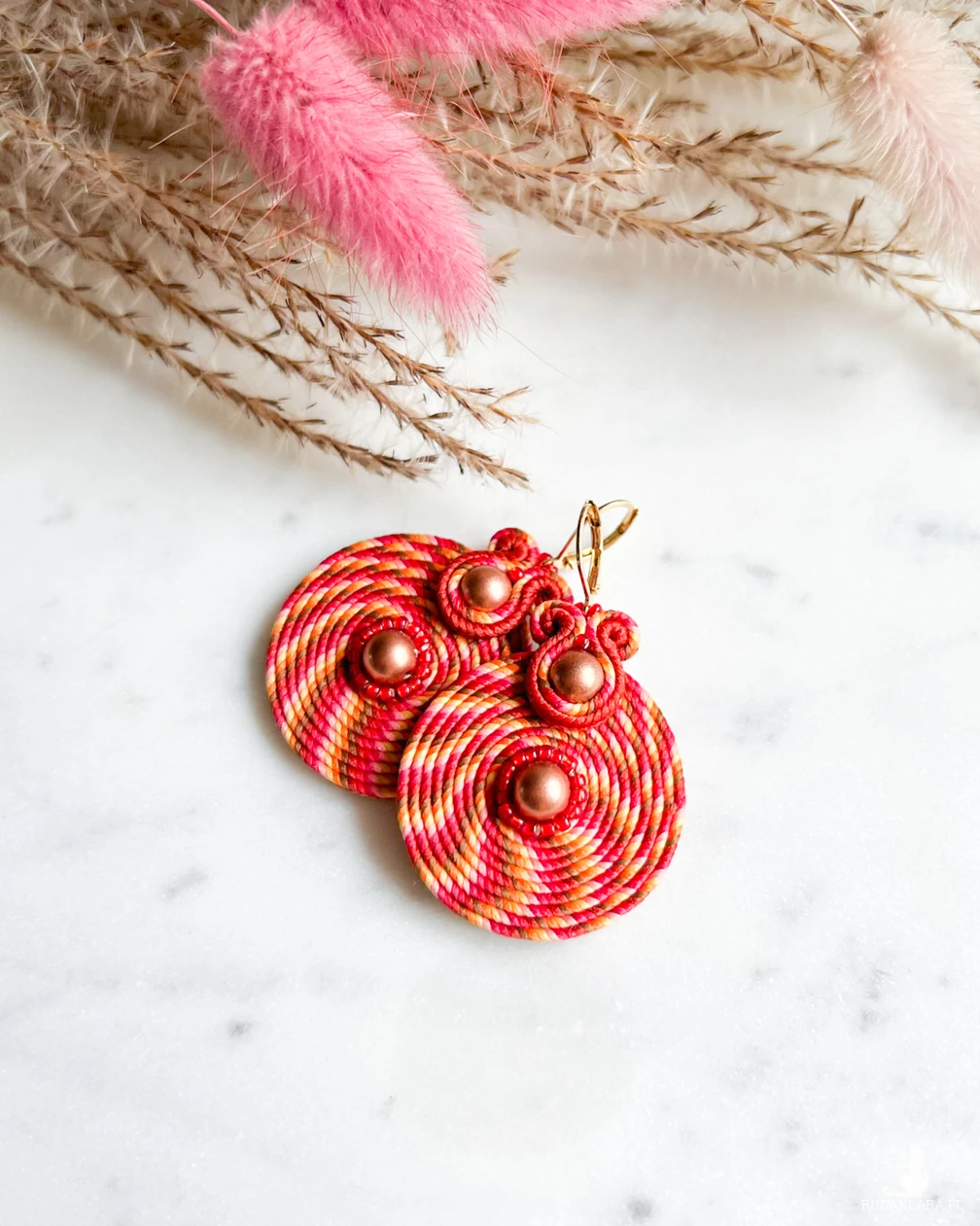 Średniej wielkości, wyjątkowo lekkie kolczyki-ślimaczki z uroczym perłowym oczkiem w kolorze rudym. Kolczyki wykonane są z wielokolorowego pasma sutaszu złożonego z odcieni czerwieni i pomarańczu z nutą bladego różu. Dodatek rudo-złotych perełek idealnie komponuje się z kolorami "ślimaczka". Ten model jest niezwykle lekki, doskonale sprawdzi się jako uzupełnienie codziennych stylizacji. Kolczyki na zamykanym biglu z antyalergicznej stali chirurgicznej w kolorze złotym.
