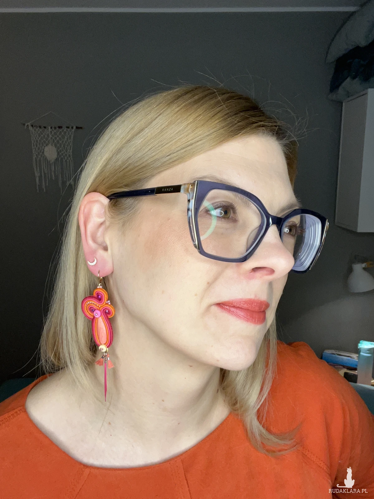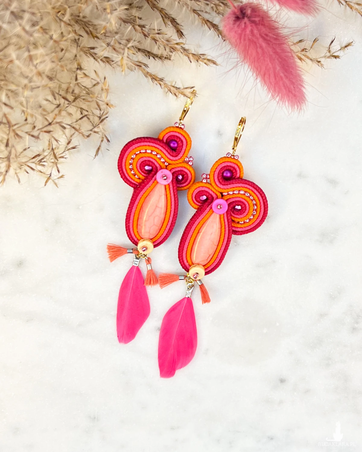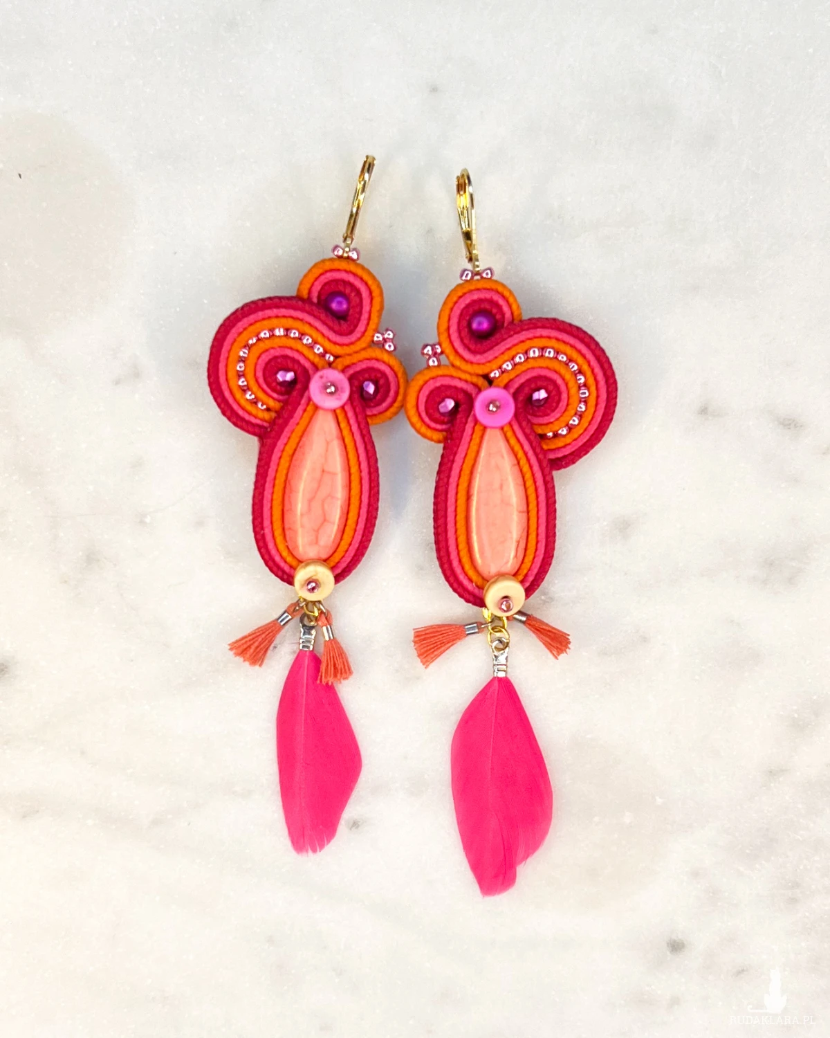 Długie i lekkie kolczyki z pomarańczowym howlitem i ozdobą z małych chwościków i piórek. Intensywne kolory kolczyków ożywią każdy strój. Idealne na specjalne okazje i na codzień. Kolczyki na biglu ze stali chirurgicznej w kolorze złotym.
