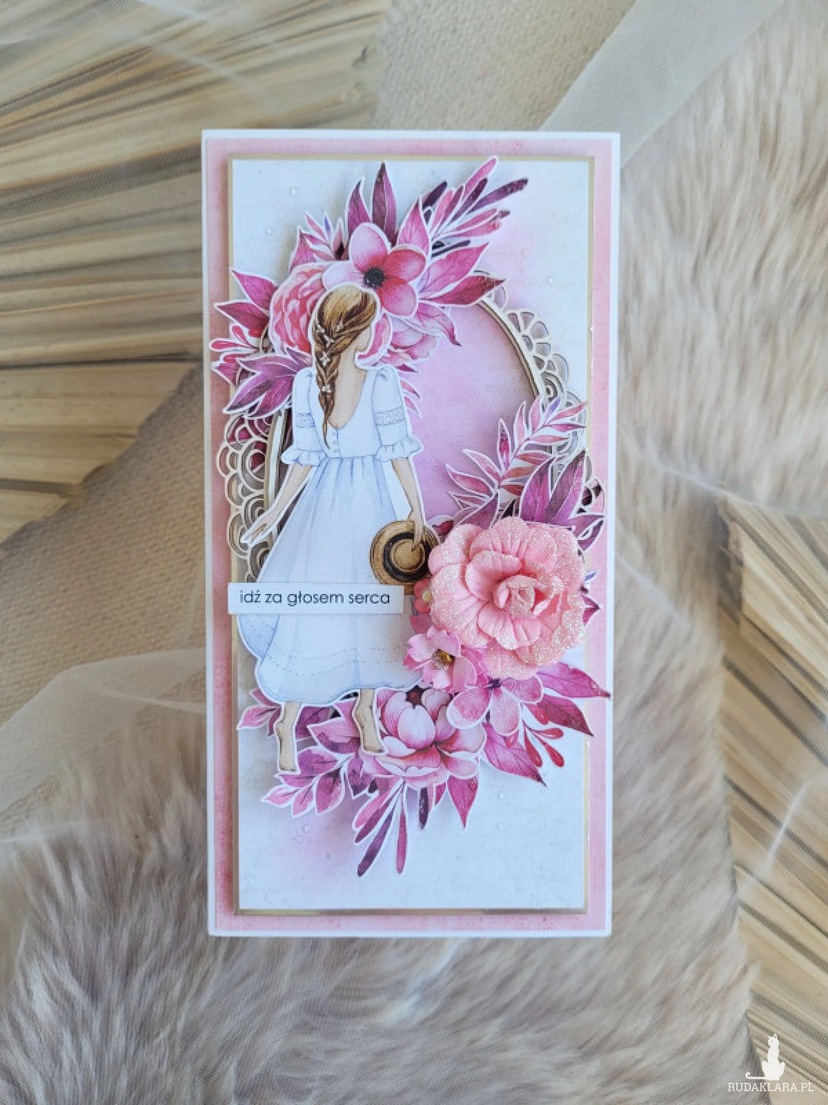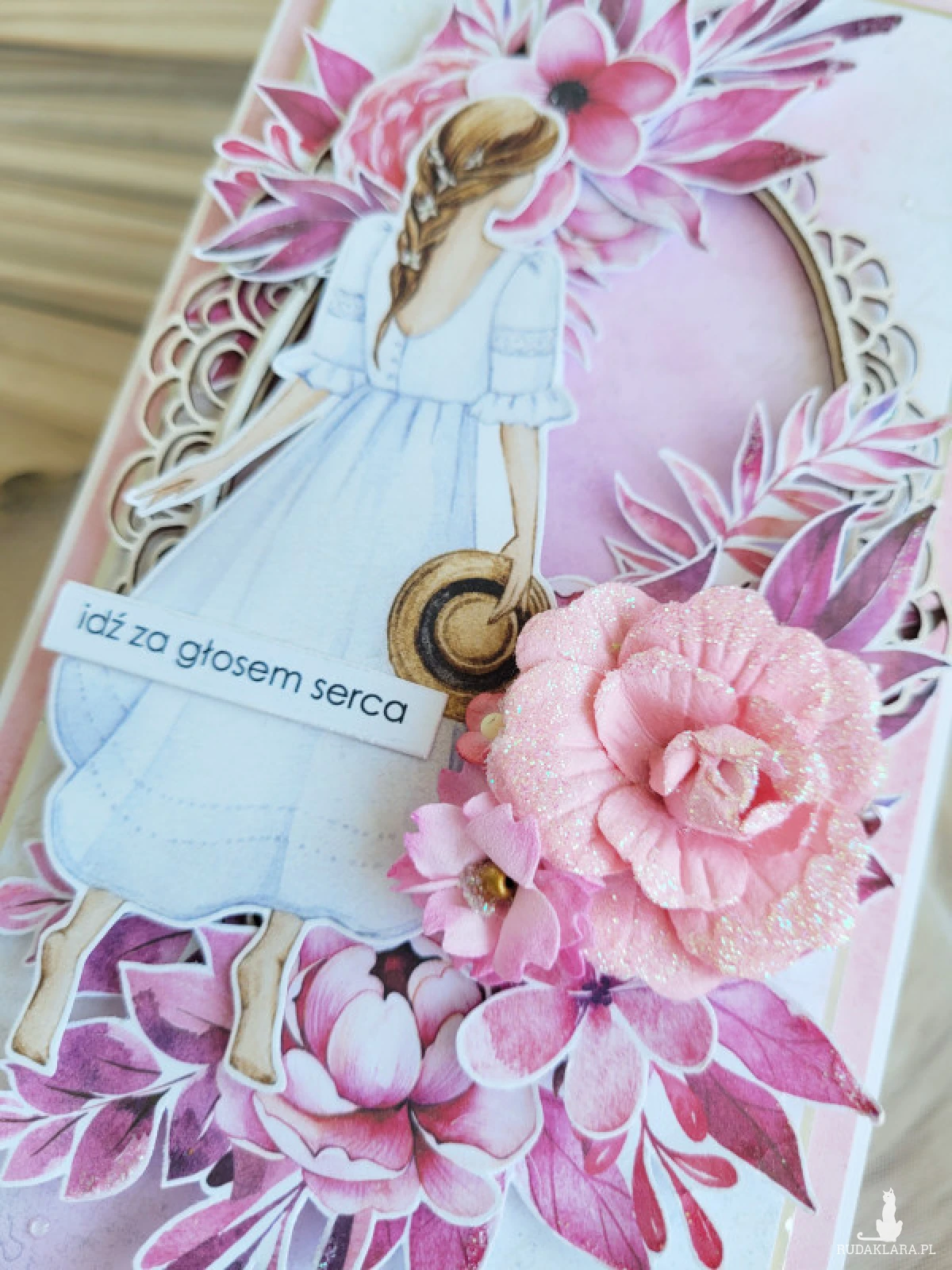 Delikatna, ręcznie robiona kartka z przesłaniem „Idź za głosem serca”, utrzymana w romantycznych odcieniach różu. Głównym motywem jest subtelna sylwetka dziewczyny w białej sukience, otoczona bogatą kompozycją kwiatów i przestrzennych elementów. Całość tworzy harmonijną, pełną lekkości i marzycielskiego nastroju kompozycję. To idealny prezent dla romantyczki, dla przyjaciółki, a także na urodziny i inne wyjątkowe okazje. Kartka ma wymiary 10,5 x 20,5 cm i jest zapakowana w eleganckie pudełko. Istnieje możliwość personalizacji – mogę dodać imię lub dedykację, a także wkleić przesłany przez Ciebie tekst życzeń. Kartka dostępna od ręki. Zapraszam! Alicja Kielar SmuggyBoo Papierowe Rękodzieło