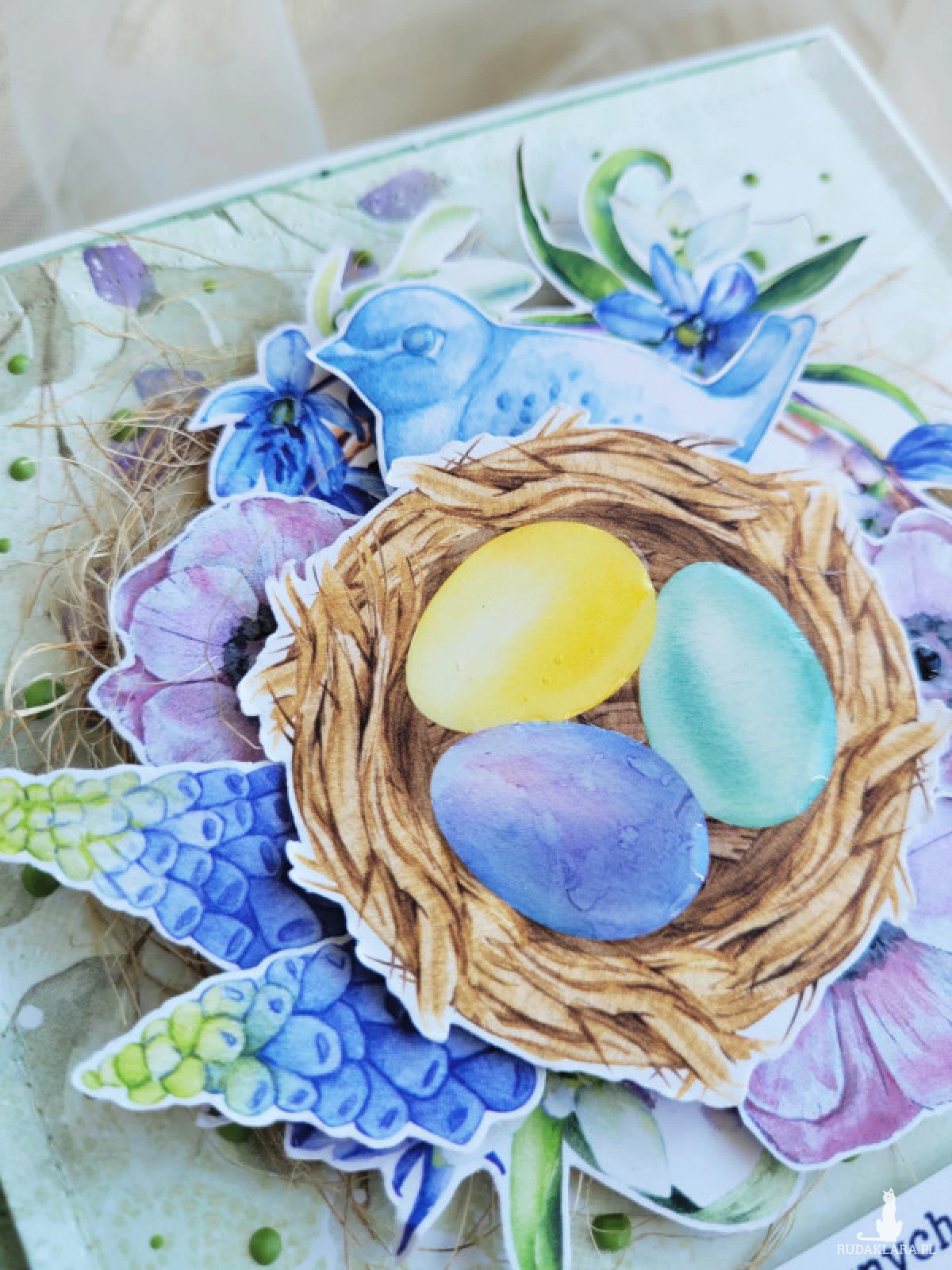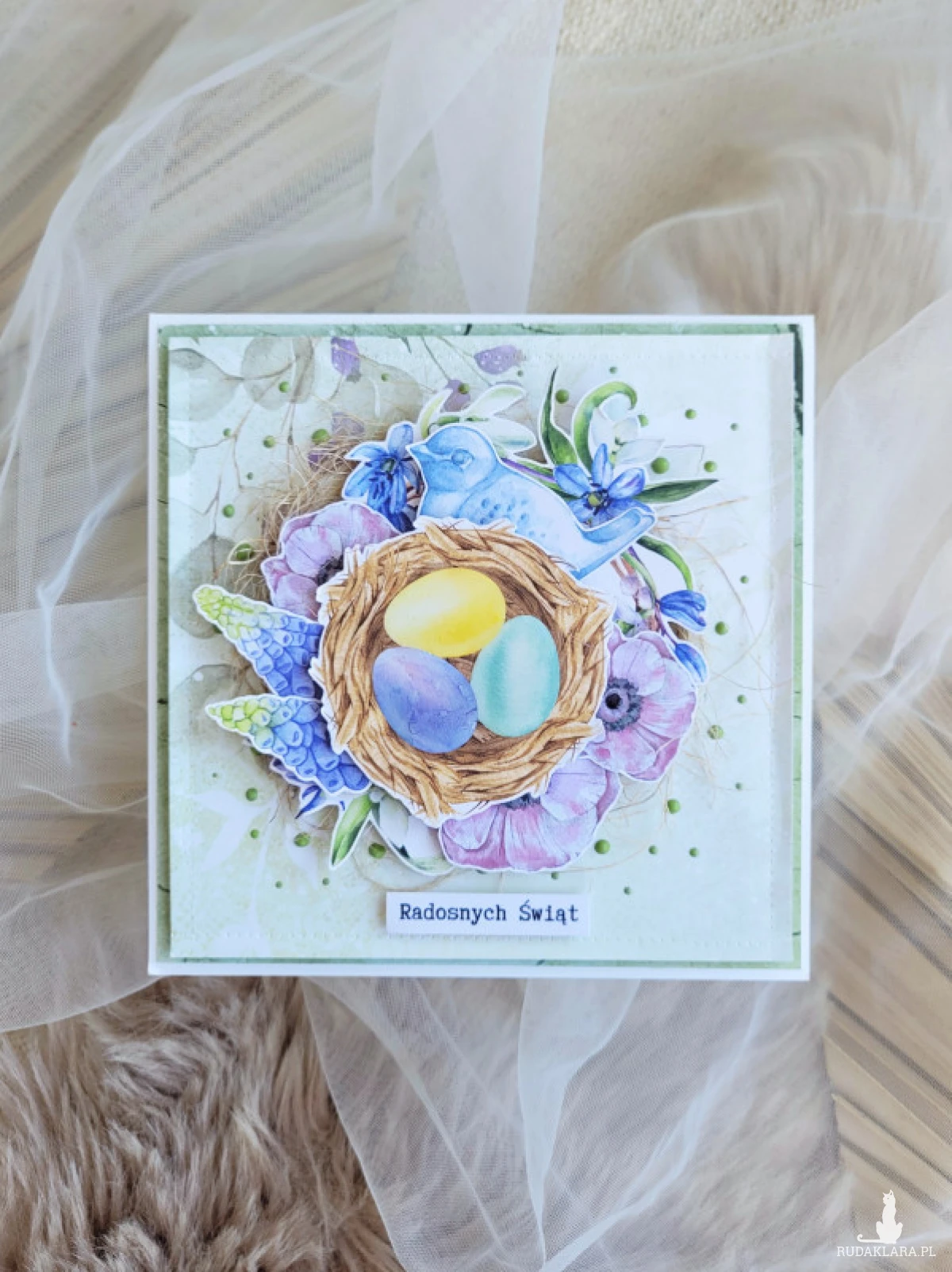 Wyjątkowa, ręcznie robiona kartka wielkanocna w delikatnych pastelowych barwach, pełna subtelnych detali i wiosennej lekkości. Na pierwszym planie znajduje się gniazdo z kolorowymi jajkami, otoczone kwiatami i gałązkami, a całość dopełnia uroczy, niebieski ptaszek. Tło utrzymane jest w naturalnych, zielonych tonach, z delikatnymi akwarelowymi wzorami. Kartka ma wymiary 14,5 x 14,5 cm, w komplecie dołączona jest koperta. Wewnątrz pozostawiam miejsce na własne życzenia, ale mogę także wkleić wydrukowany tekst – wystarczy, że go prześlesz. Kartka dostępna od ręki. Zapraszam! Alicja Kielar SmuggyBoo Papierowe Rękodzieło