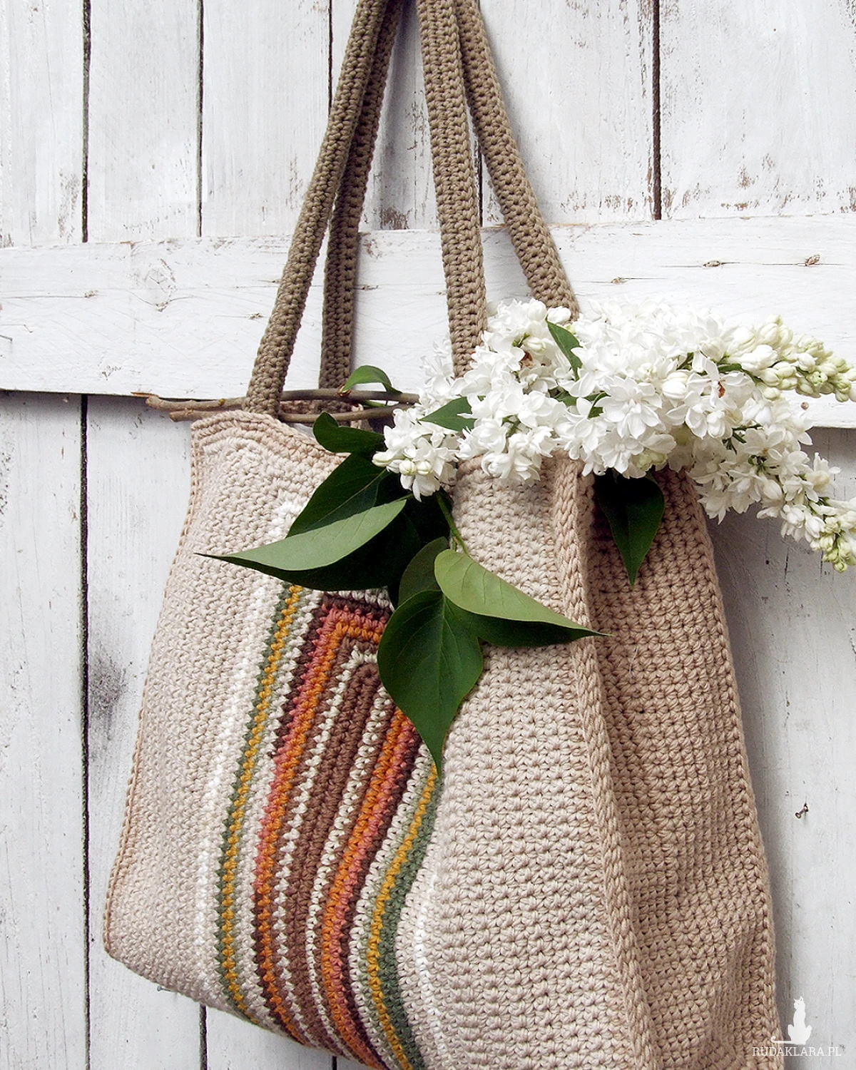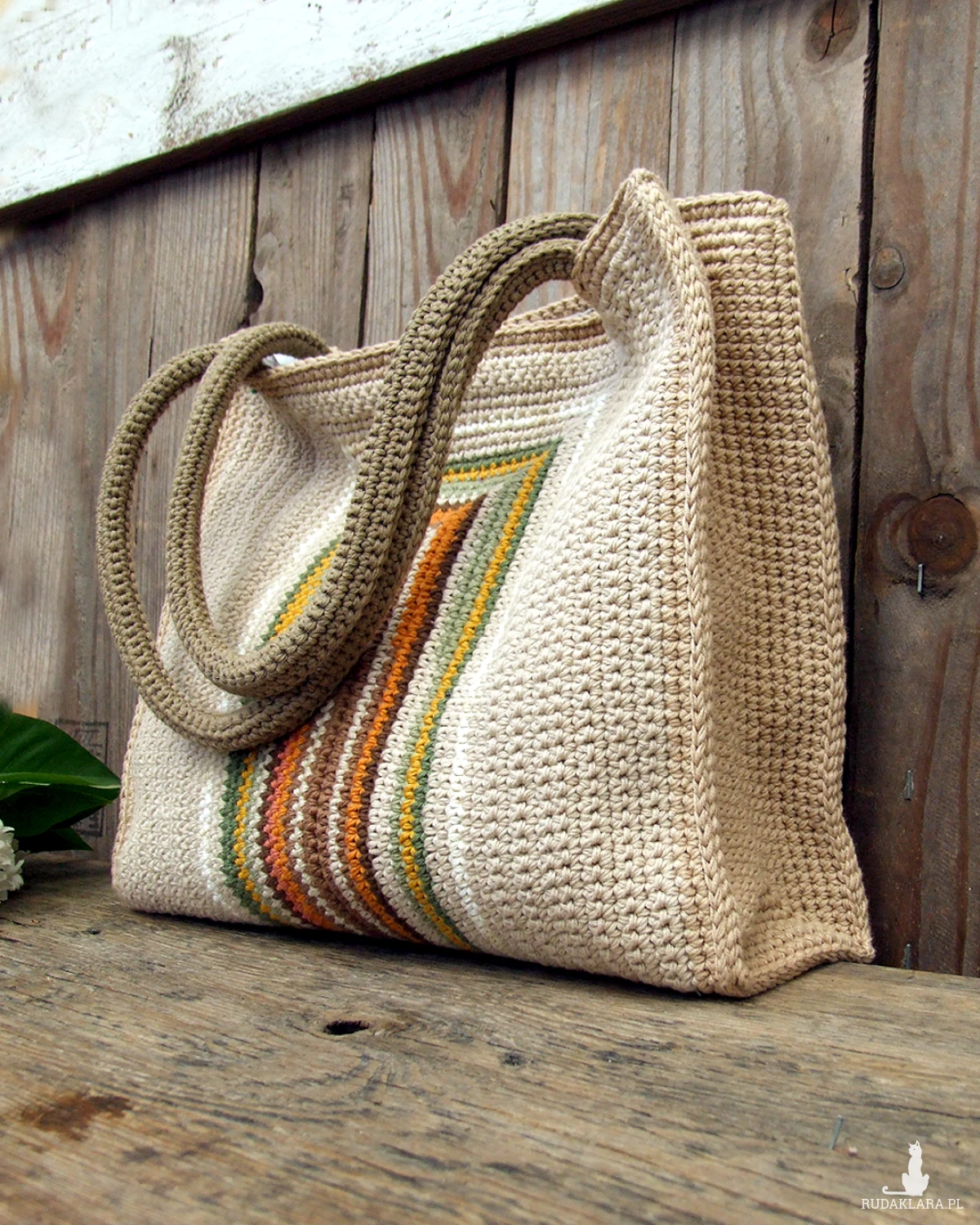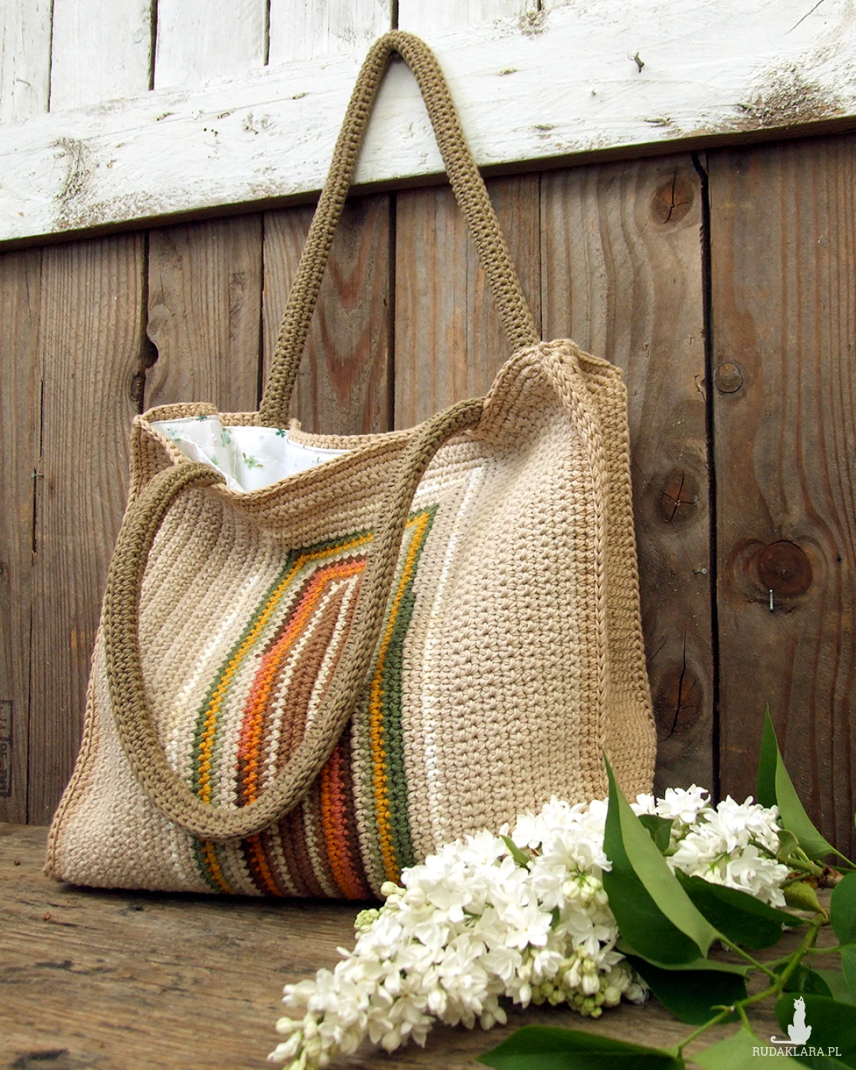 Duża torebka, wykonana ręcznie na szydełku, z bawełnianej włóczki (nie ze sznurka) - można ją nosić w ręku, dość długie rączki pozwalają także na swobodne noszenie torebki na ramieniu.