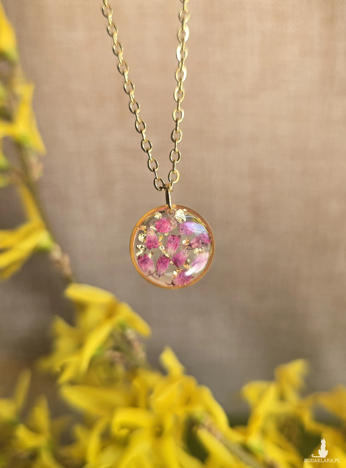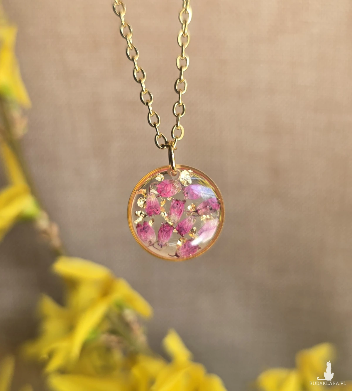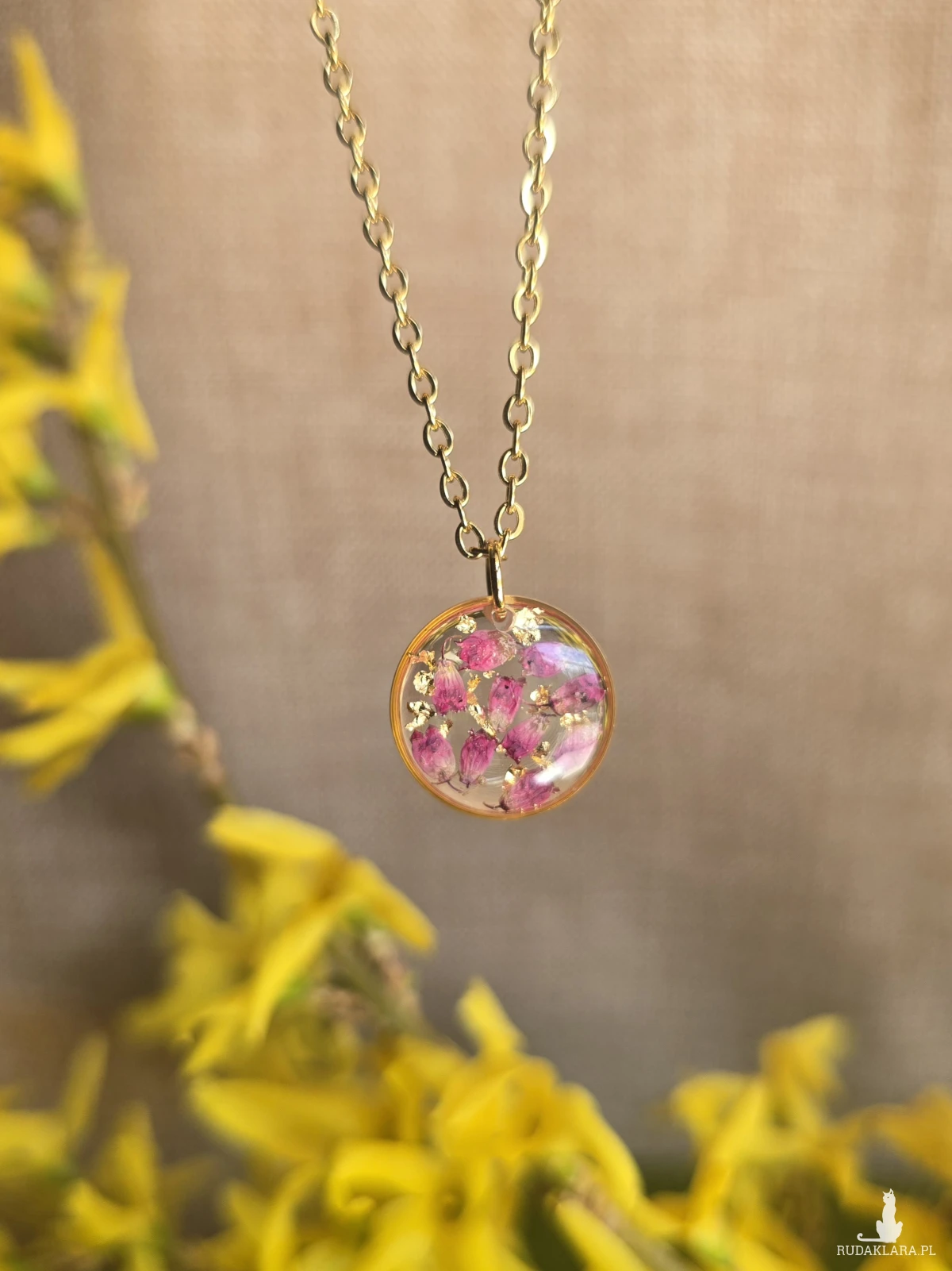 Złota zawieszka złoty wisiorek kwiat naszyjnik żywica z żywicy suszone kwiaty z kwiatami żywicy kwiaty żywica różowy kwiat wrzos z wrzosem