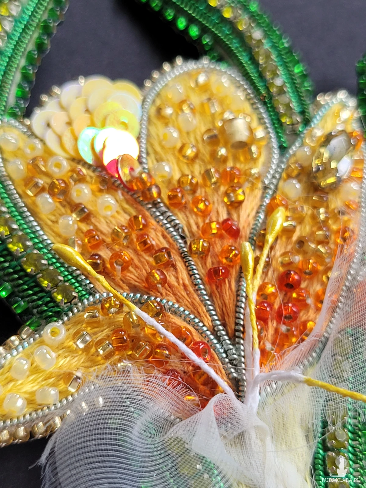 🔸 Materiały: wysokiej jakości szklane koraliki, duże połyskujące kryształy, ozdobne koraliki, tkanina szyfon, skóra ekologiczna (tył broszki).