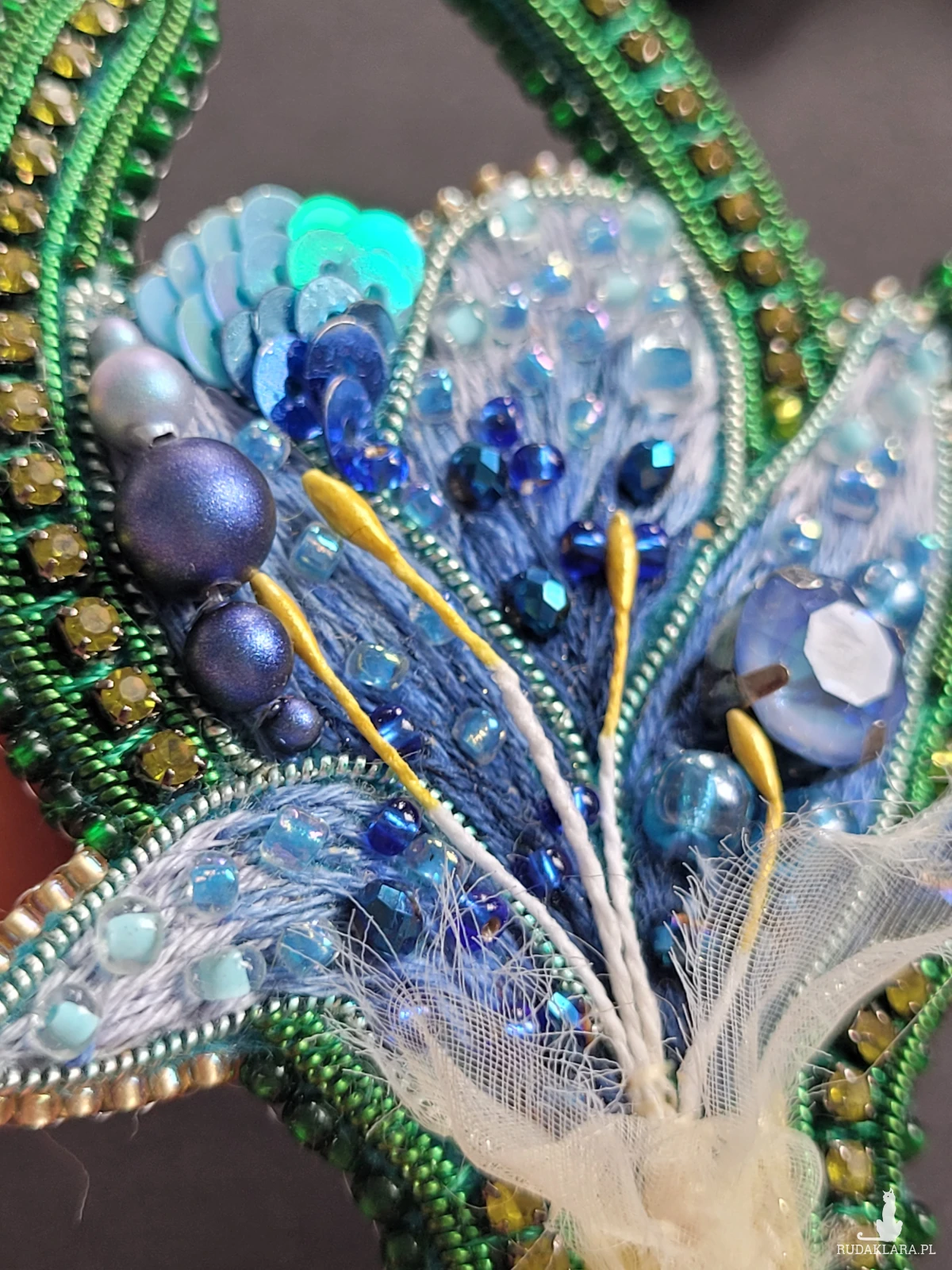 🔸 Materiały: wysokiej jakości szklane koraliki, duże połyskujące kryształy, ozdobne koraliki, tkanina szyfon, skóra ekologiczna (tył broszki).