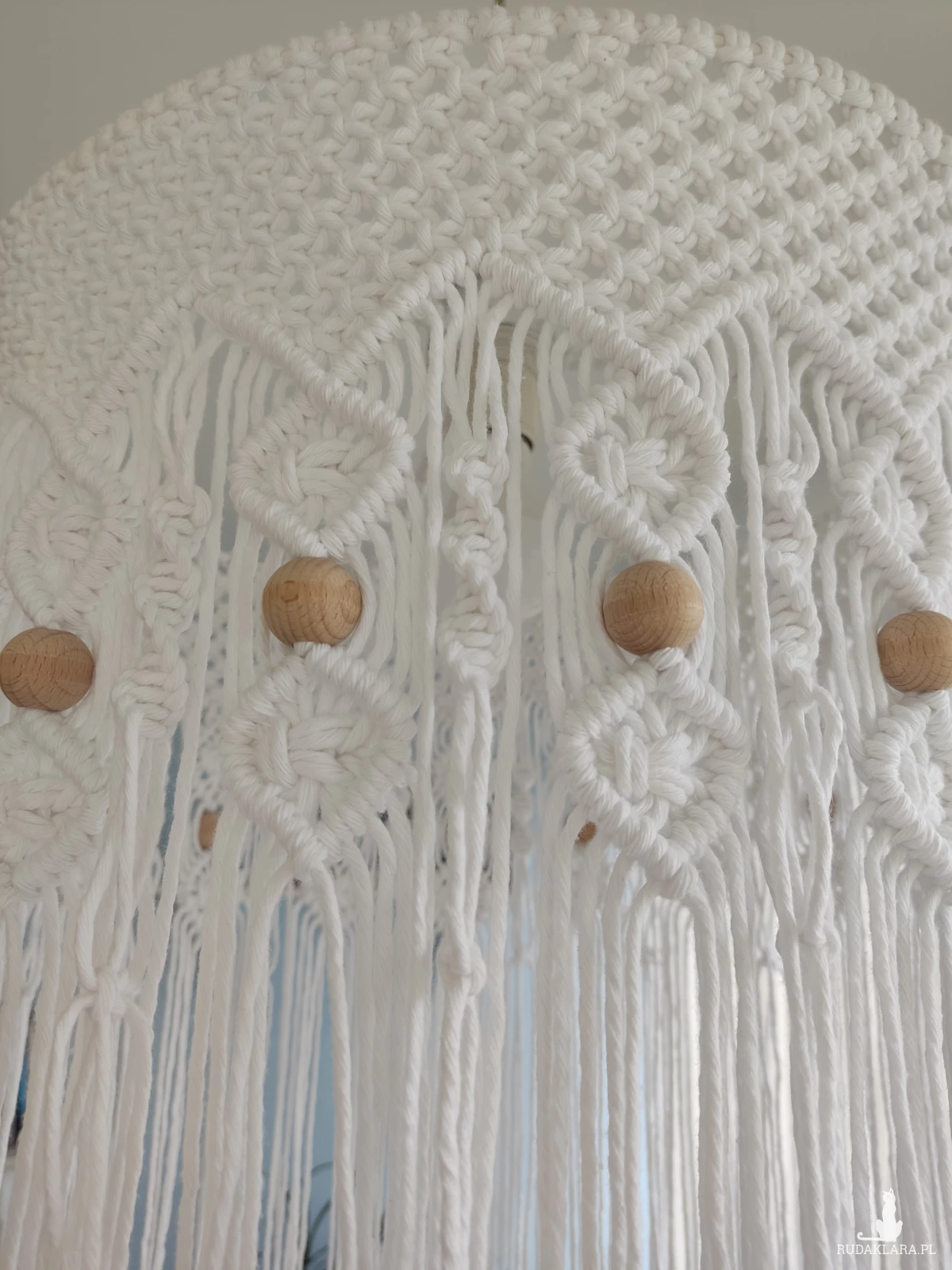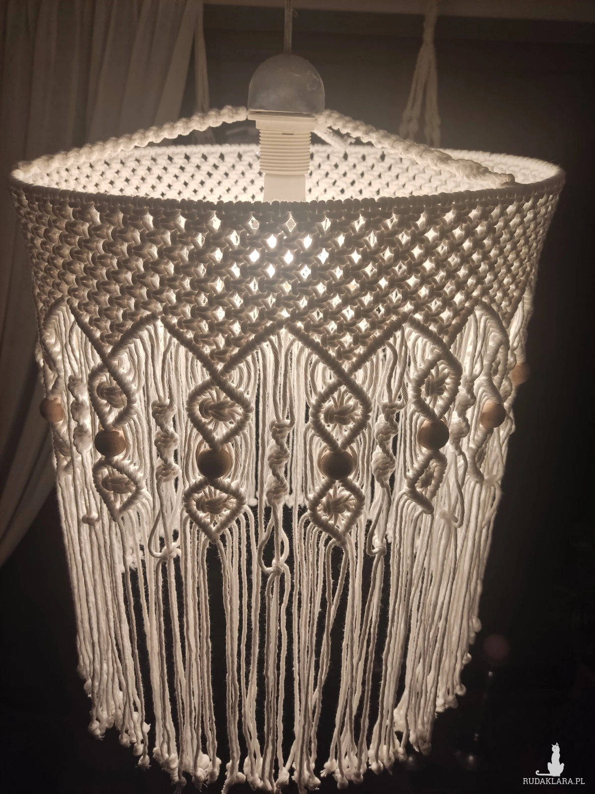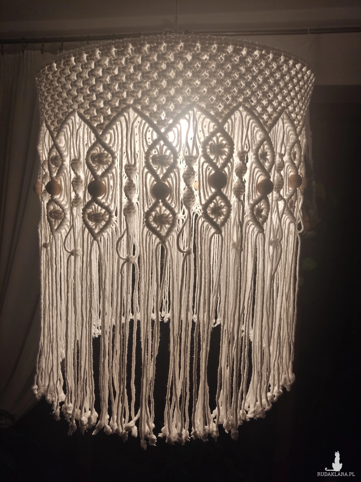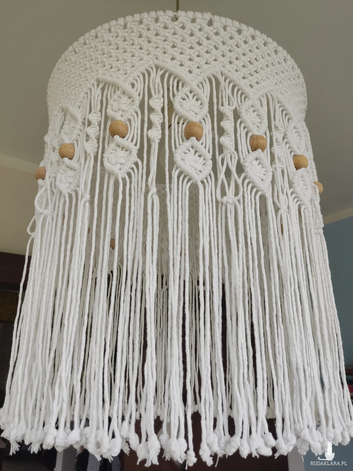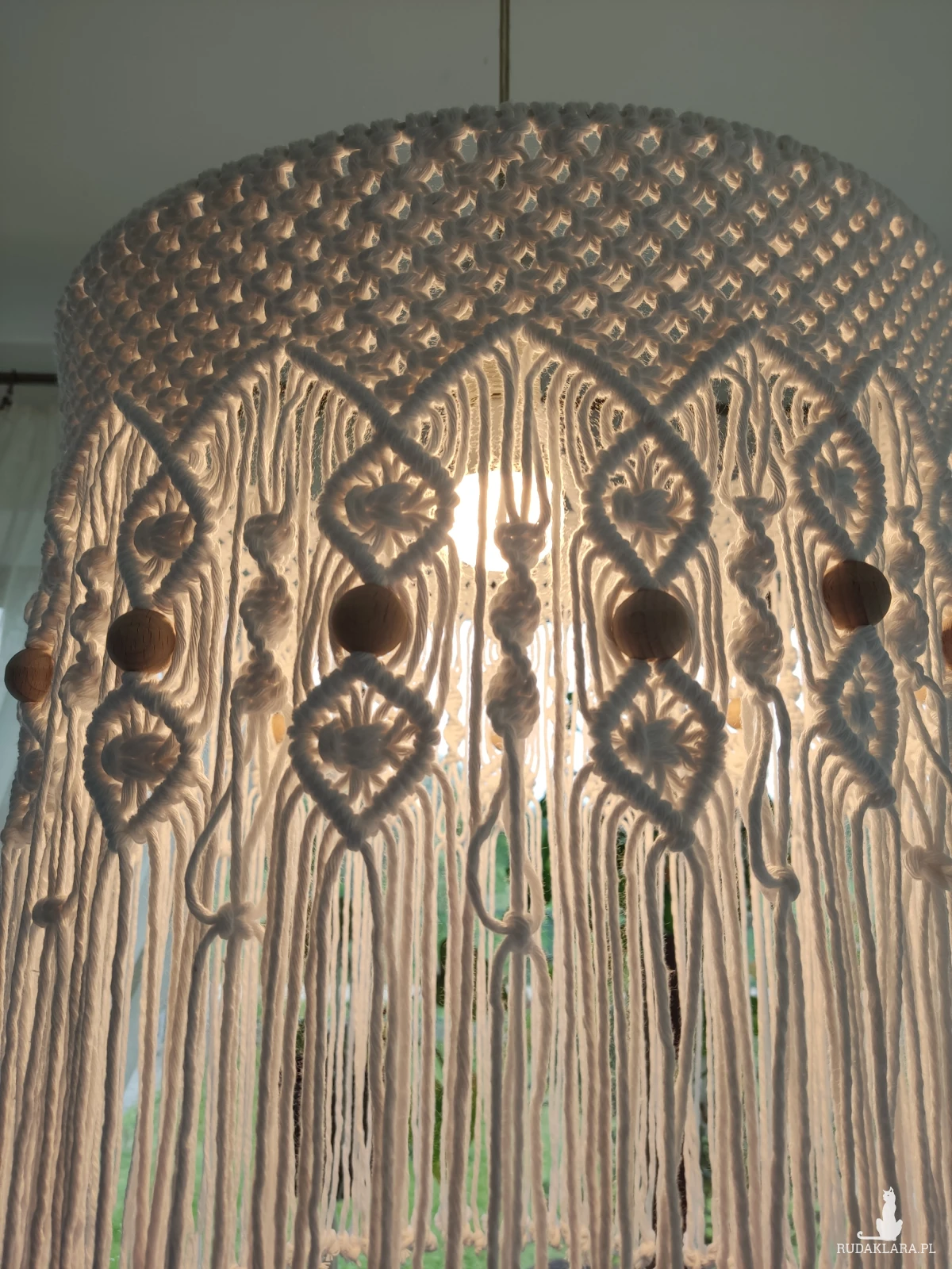 Sprzedam nowy ręcznie wykonany abażur w stylu Boho wypleciony ze sznurka 3 mm w kolorze naturalnym. W sprzedaży sam abażur bez przewodów eklektycznych. Średnica abażuru wynosi 40 cm natomiast wysokość 40 cm z dodatkiem drewnianych koralików.