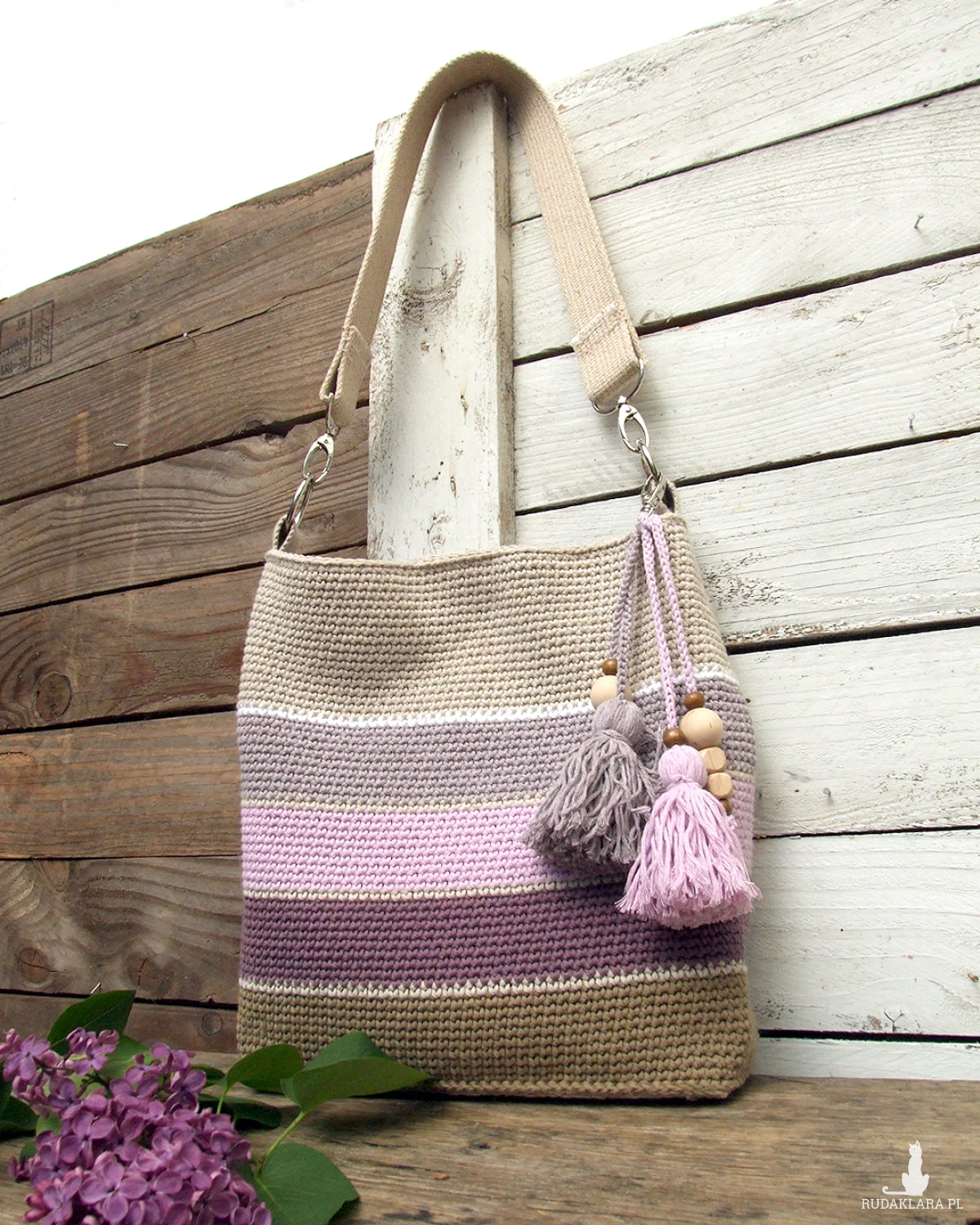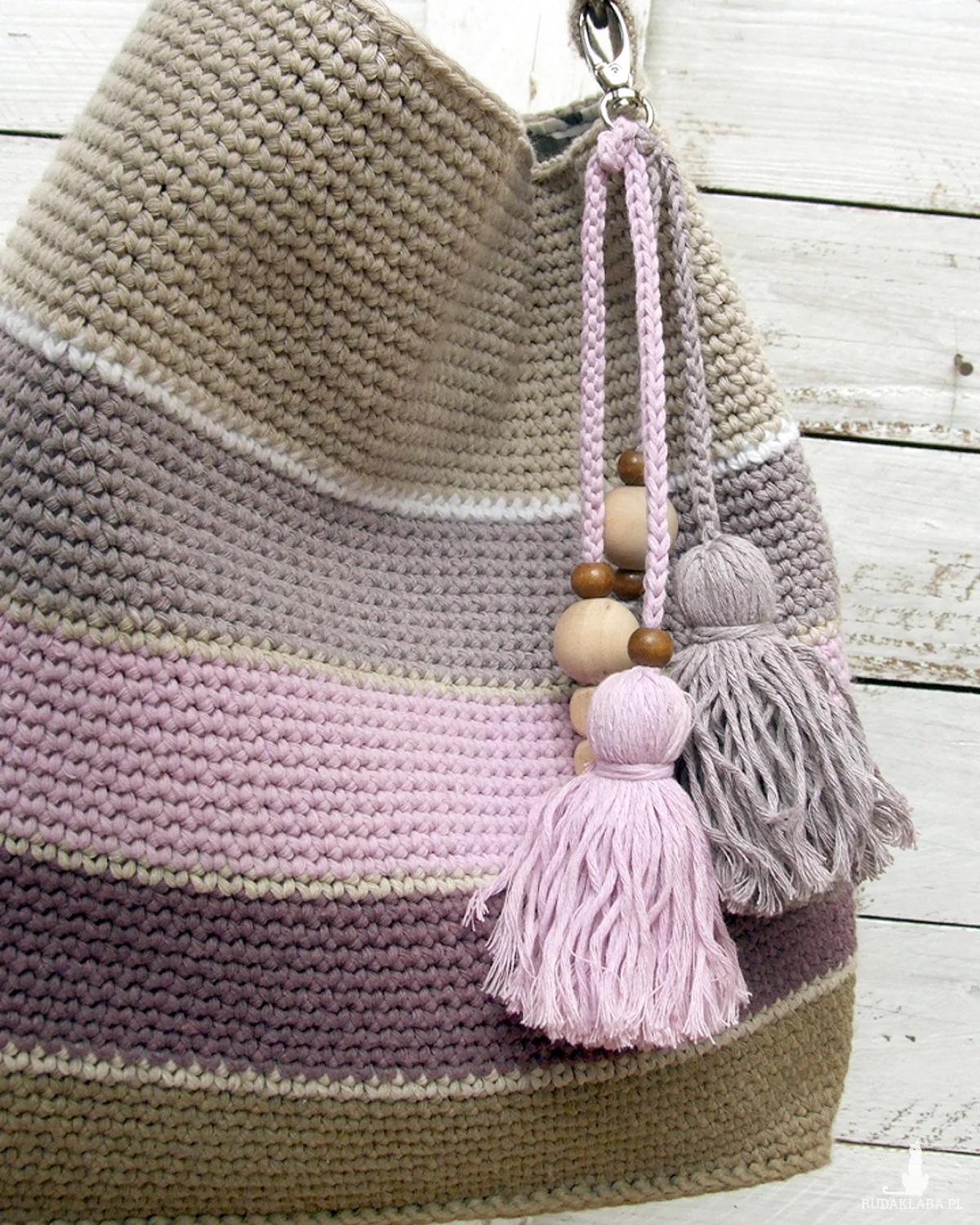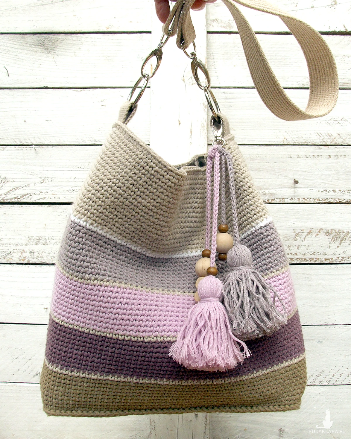 Bawełniana torebka na ramię, średniej wielkości. Wykonana na szydełku z bawełnianej włóczki. Dodatkową ozdobą jest ręcznie wykonany brelok z dużymi chwostami i drewnianymi koralikami, brelok można odpinać.