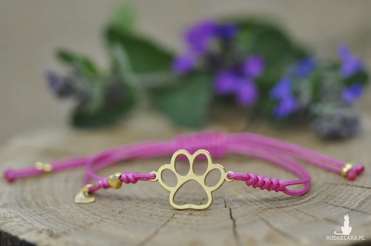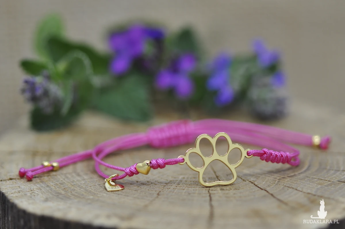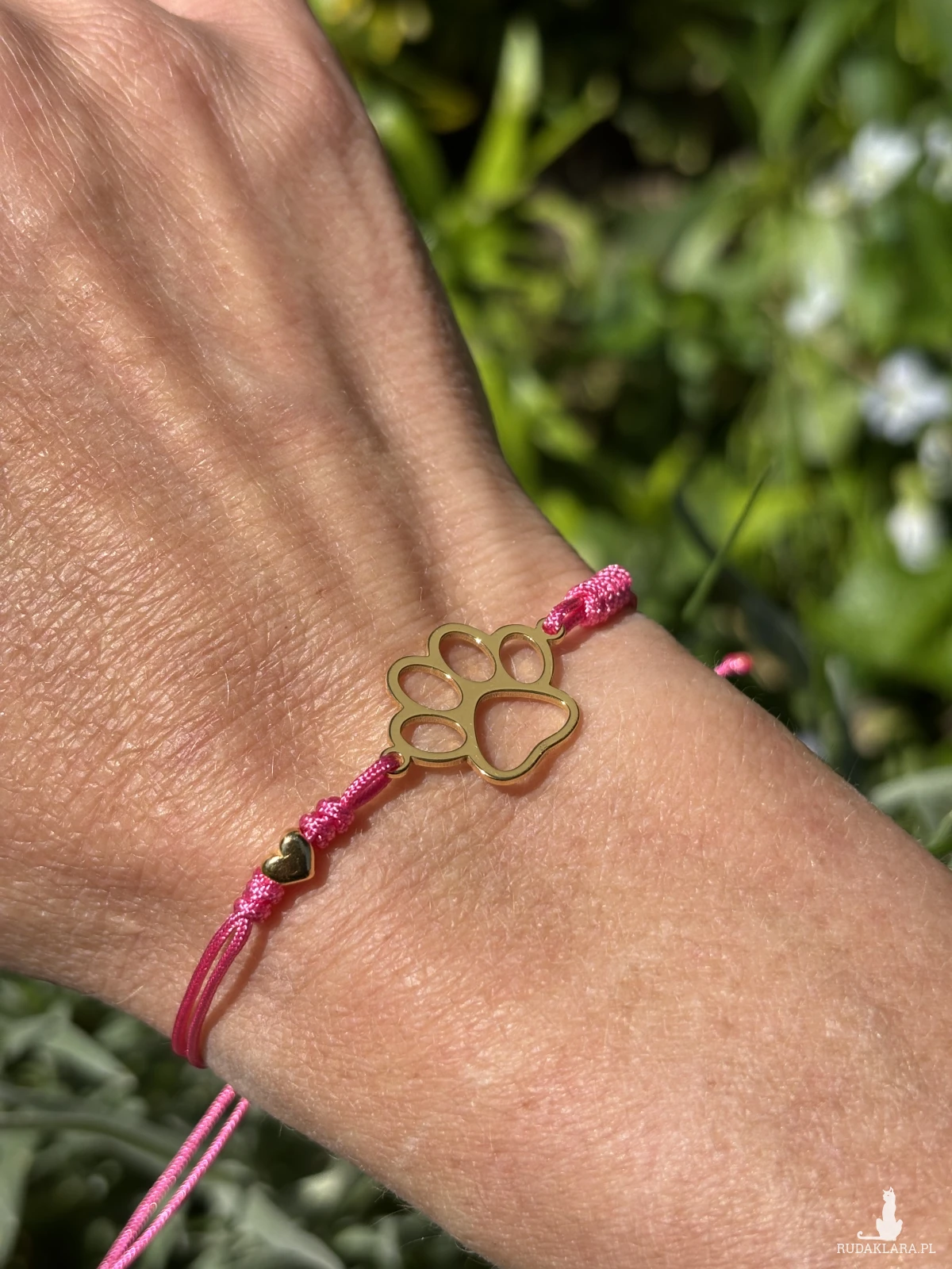 Łapa ze srebrnej blachy próby 925, o wymiarach 14,8 x 21,6 mm, grubość 0,8 mm, srebrne kulki na zakończeniach sznurka oraz koralik serduszko.