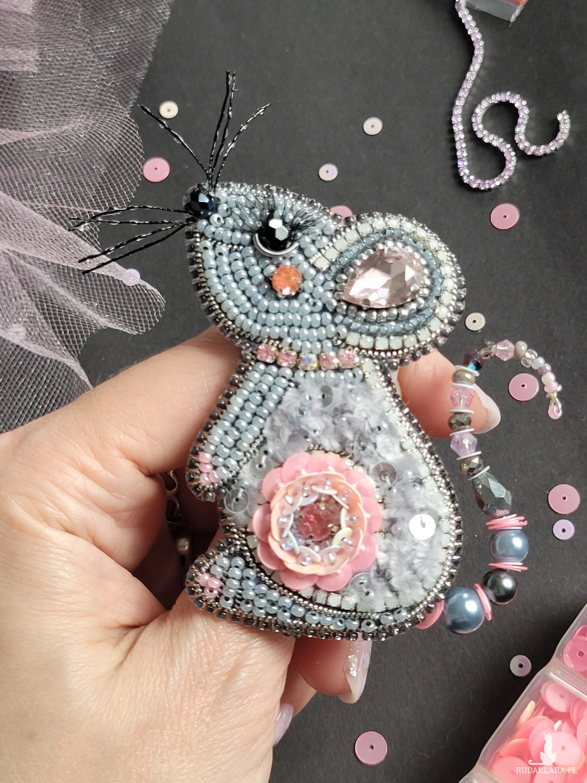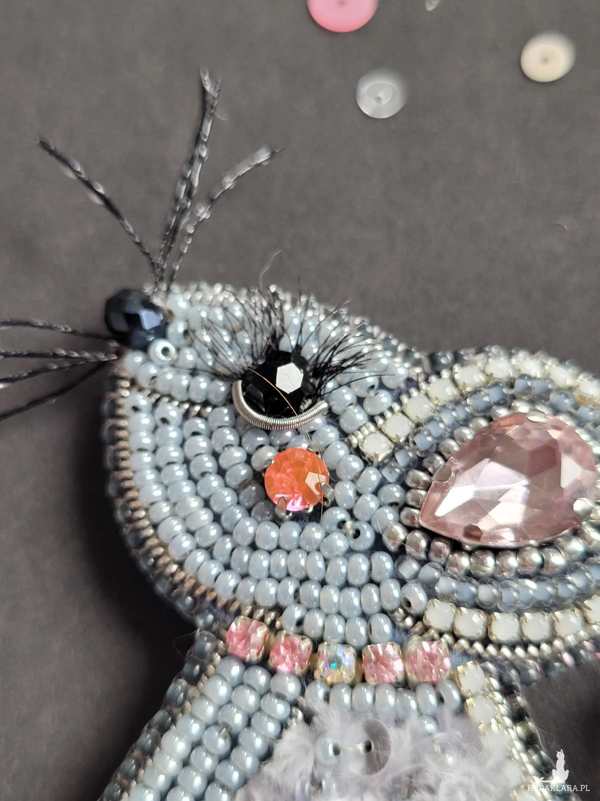 • Ręczne wykonanie z koralików, cekinów, kryształków, tkaniny i ozdobnych perełek.