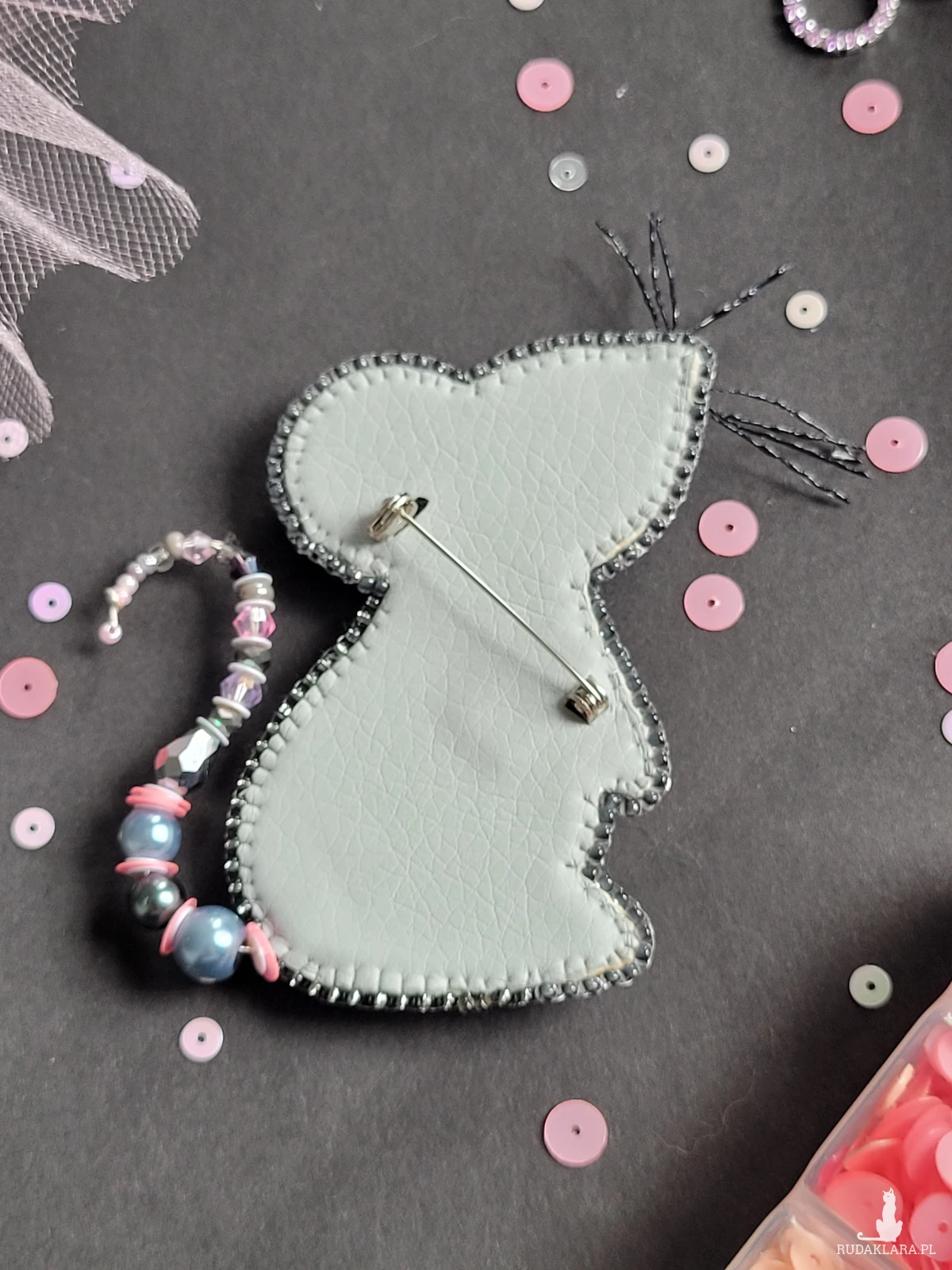 "Myszka jasna z różą" broszka haftowana cekinamy i koralikami