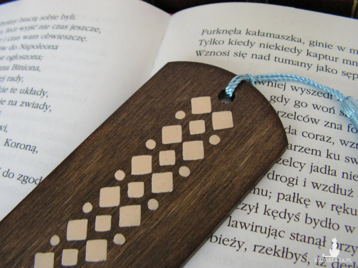 Awers - grafika na papierze ryżowym, rewers - wzór naniesiony pastą strukturalną. Wykończenie zakładki to niebieski, jedwabny chwost.