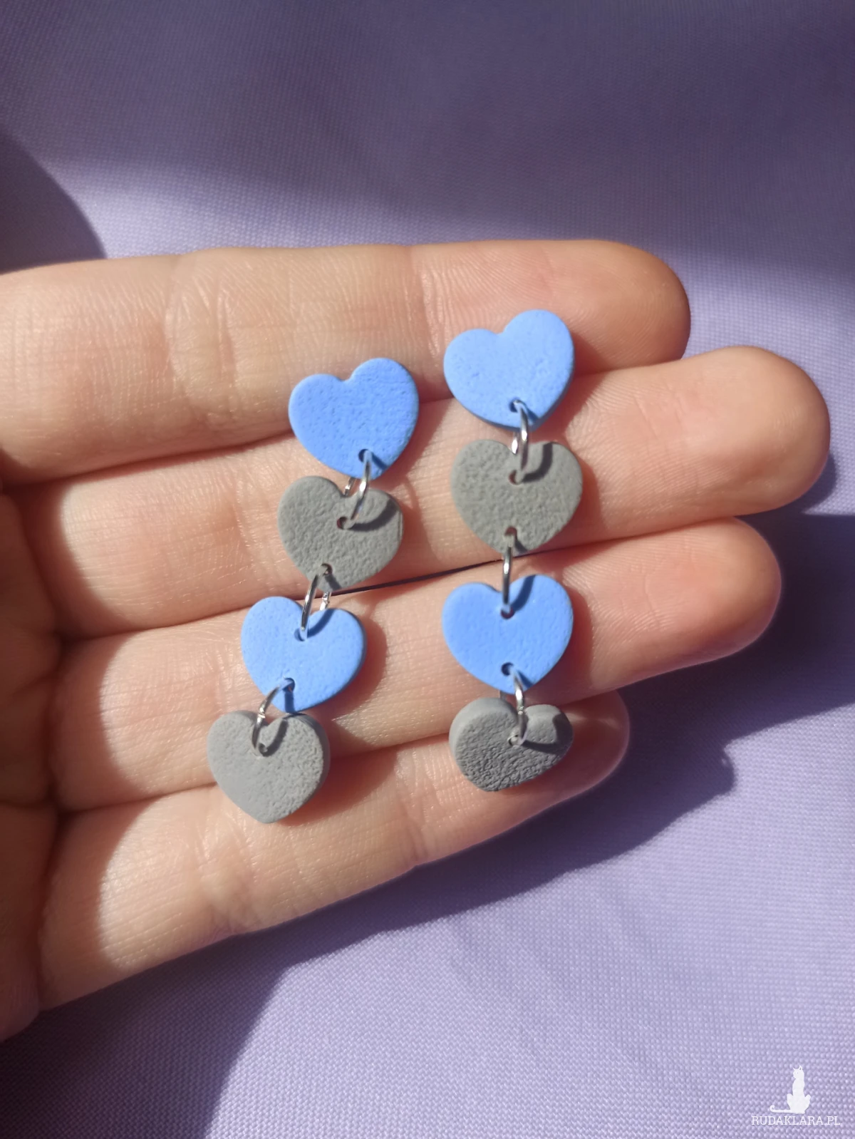 Kolczyki wiszące sztyfty w kształcie 4 połączonych ze sobą serduszek w kolorach szarym i niebieskim.