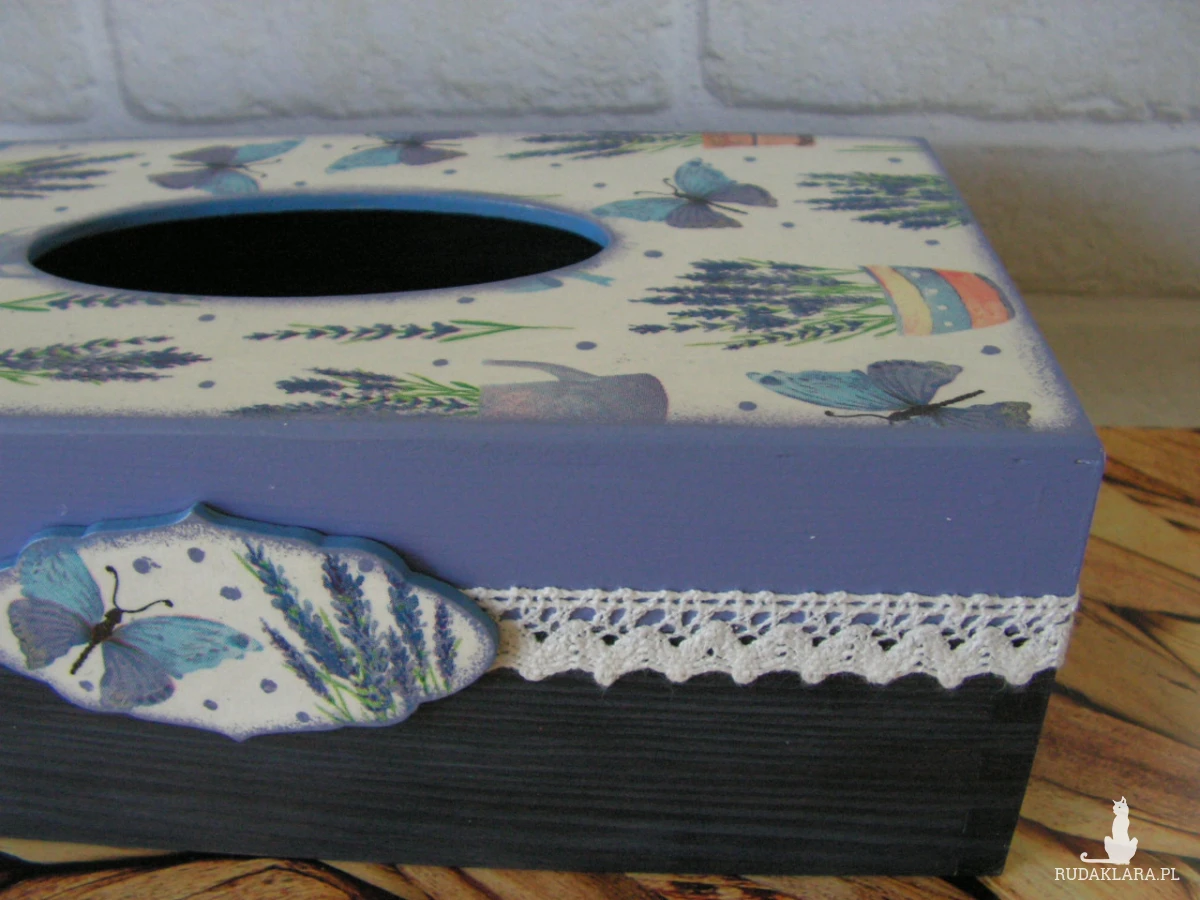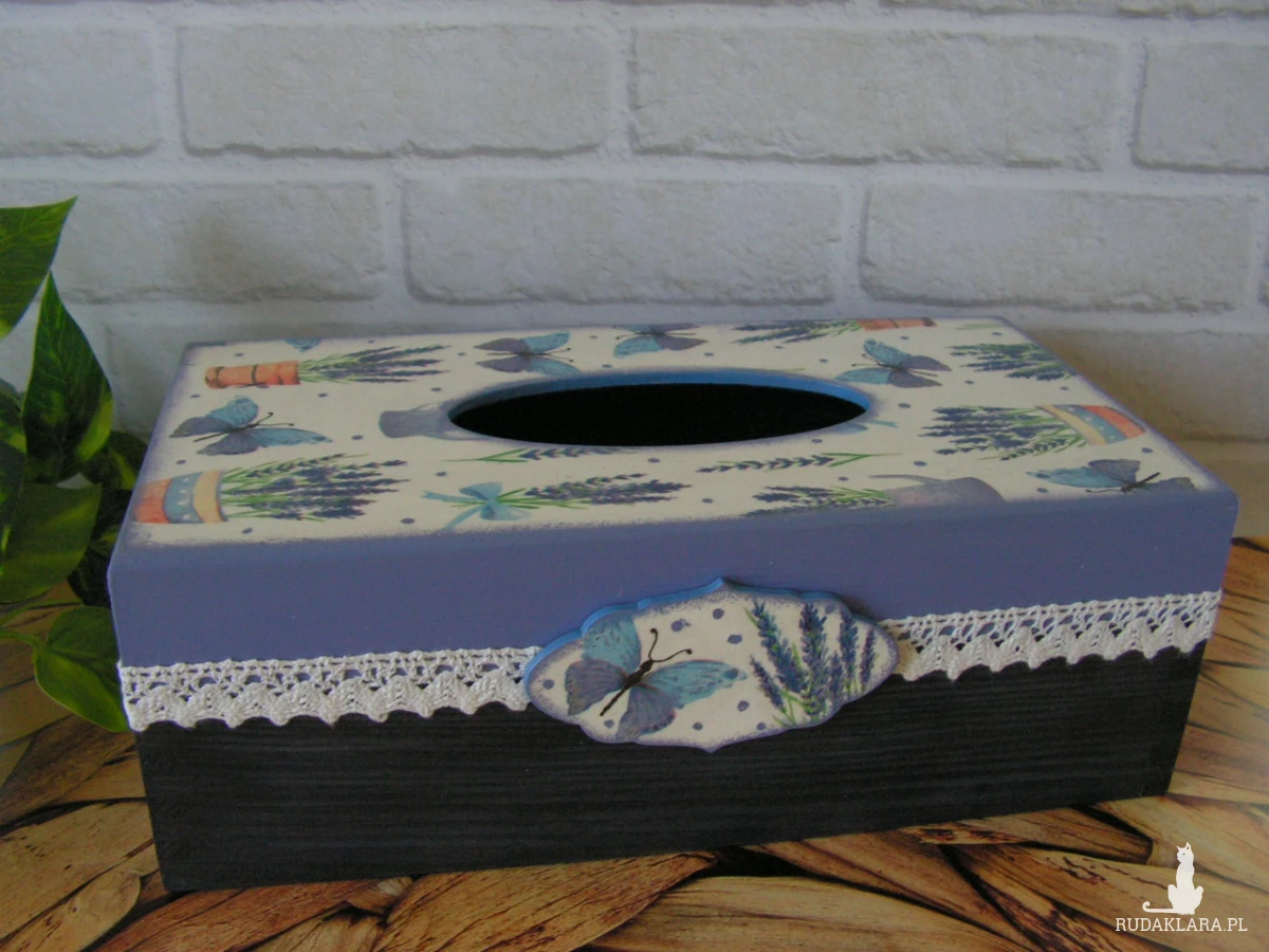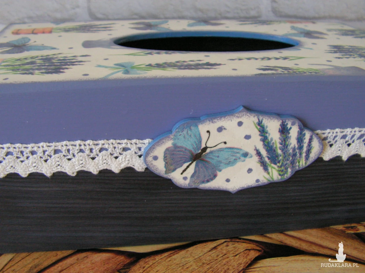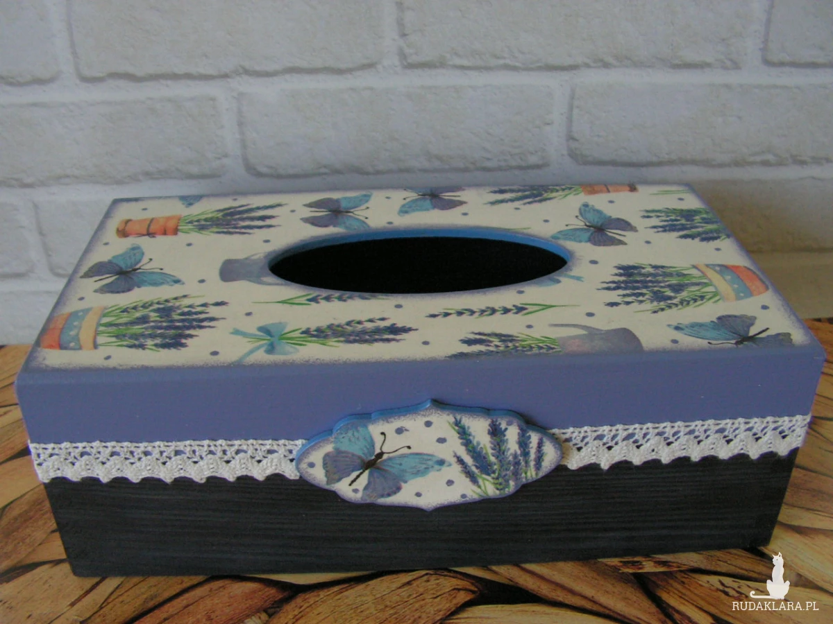 Chustecznik prostokątny, drewniany, ręcznie malowany i ozdobiony metodą decoupage. Otwierany od dołu. Całość zabezpieczona lakierem akrylowym. Mieści się w nim standardowe, prostokątne pudełko chusteczek higienicznych (albo pudełko rękawiczek jednorazowych).