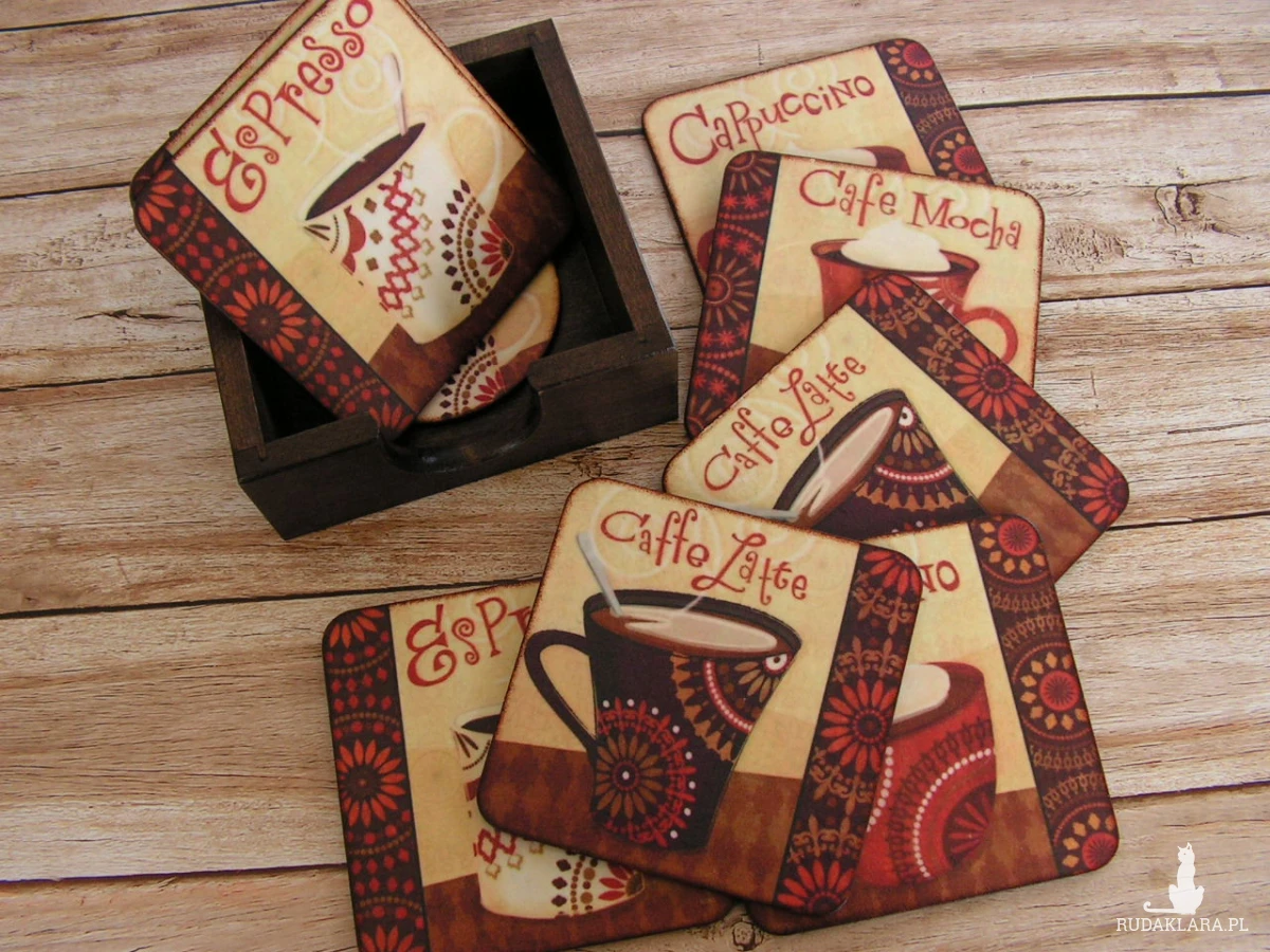Podkładki i pudełko pomalowane bejcą wodną w kolorze "belgijska czekolada" i ozdobione techniką decoupage.