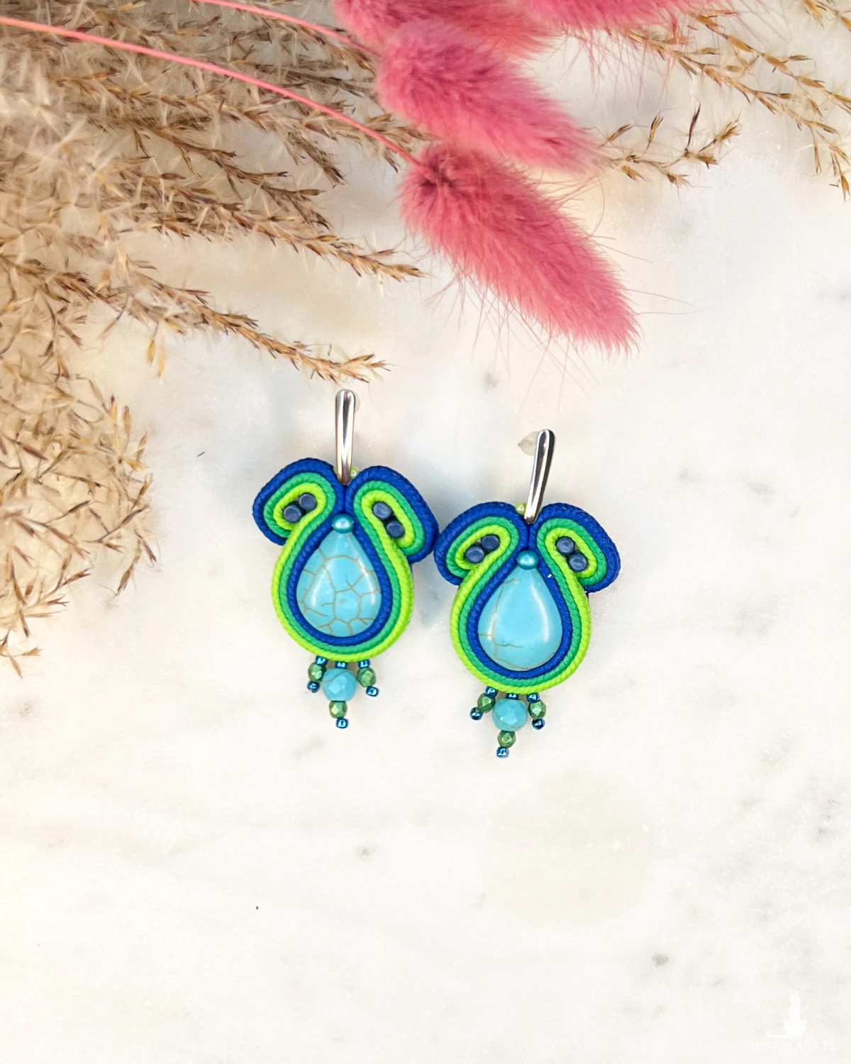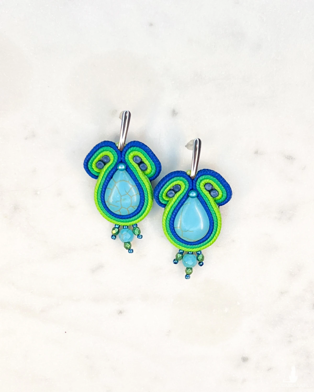 Średnie, leciutkie kolczyki z turkusowym howlitem i ozdobą z małych koralików. Intensywne kolory kolczyków ożywią każdy strój. Idealne na codzień. Kolczyki na sztyfcie ze stali chirurgicznej w kolorze srebrnym.