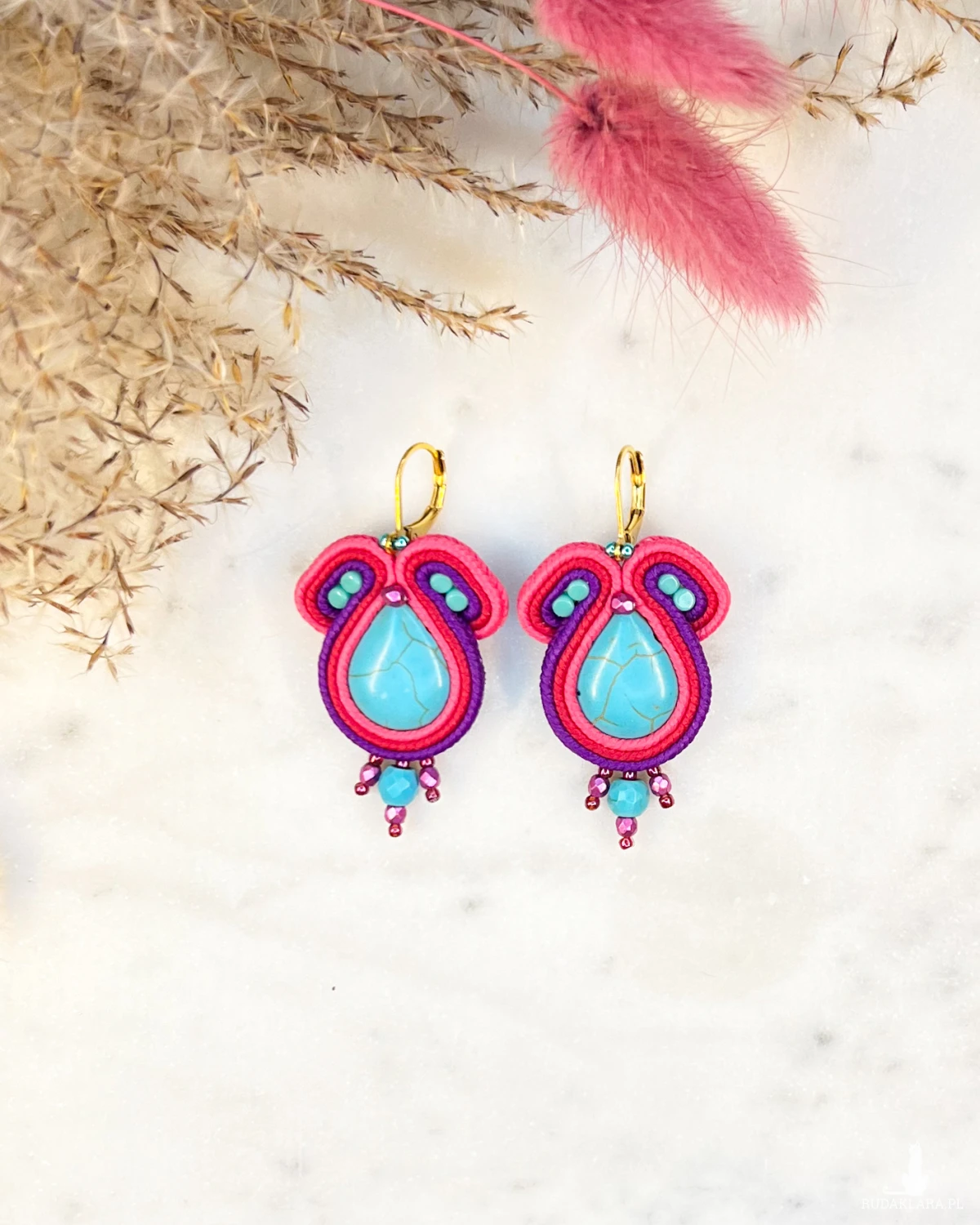 Średnie, leciutkie kolczyki z turkusowym howlitem i ozdobą z małych koralików. Intensywne kolory kolczyków ożywią każdy strój. Idealne na codzień. Kolczyki na biglu ze stali chirurgicznej w kolorze złotym.