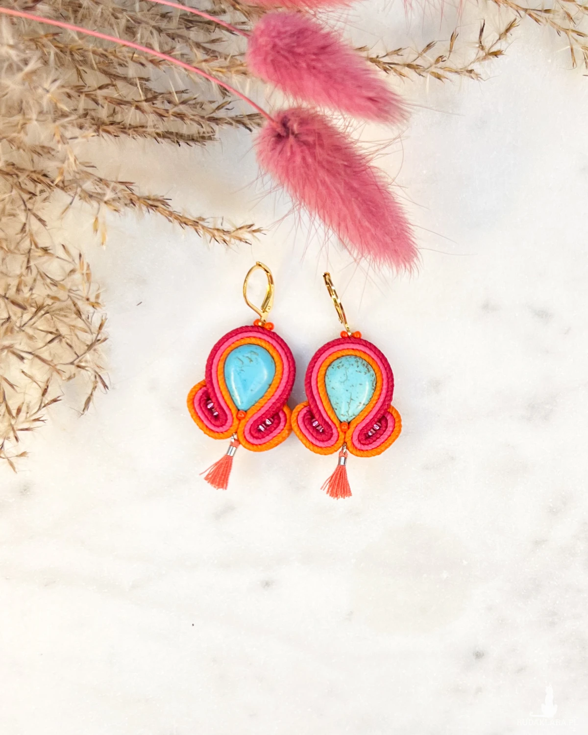 Małe, leciutkie kolczyki z turkusowym howlitem i mini chwościkiem. Intensywne kolory kolczyków ożywią każdy strój. Idealne na codzień. Kolczyki na zamykanym biglu z antyalergicznej stali chirurgincznej w kolorze złotym.