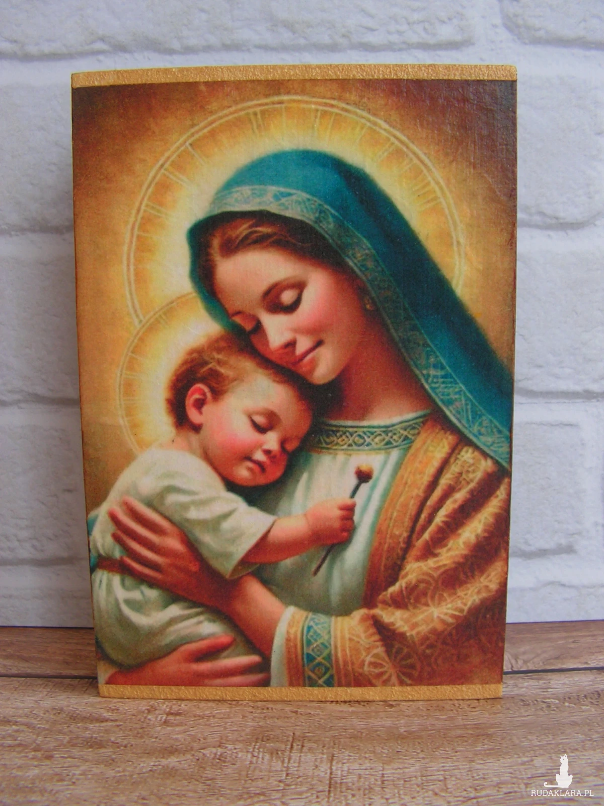 "Matka Boża Opiekunka" - obrazek na desce, wykonany w technice decoupage. Boki pomalowane bejcą wodną w kolorze „trufla” i przetarte złotą pastą antyczną.