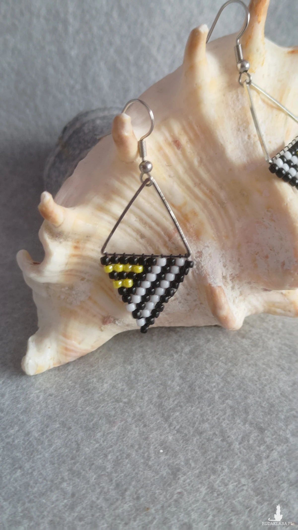 Kolczyki wykonane są z japońskich koralików toho techniką beadingu na trójkątnej bazie. Koraliki są w kolorze czarnym, białym i żółtym. Kolczyki zawieszone są na otwartych biglach ze stali chirurgicznej.