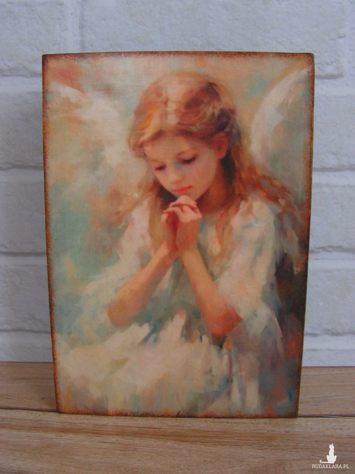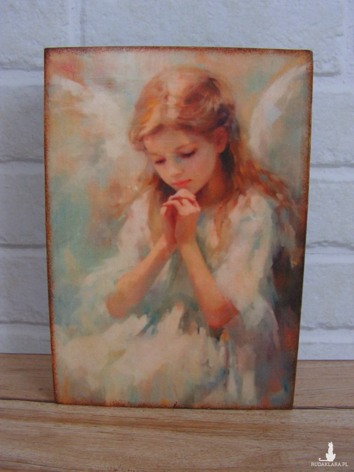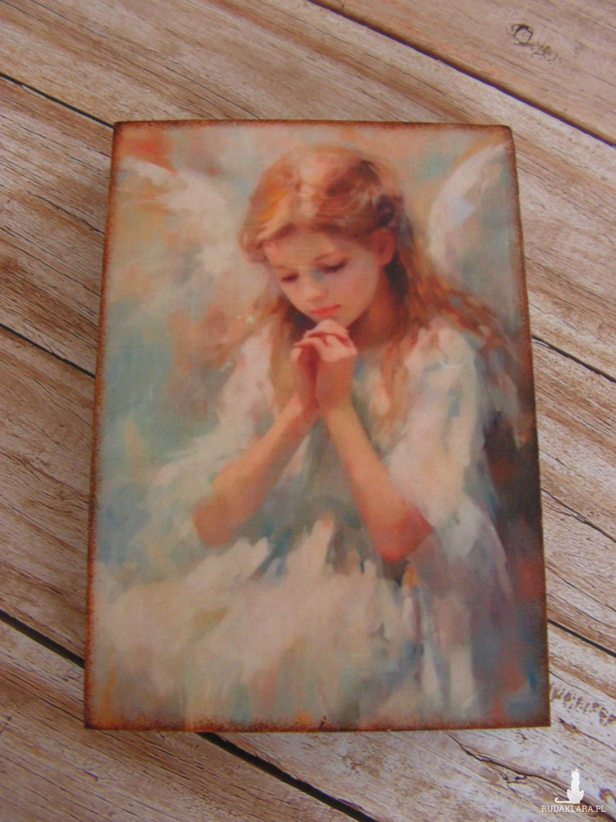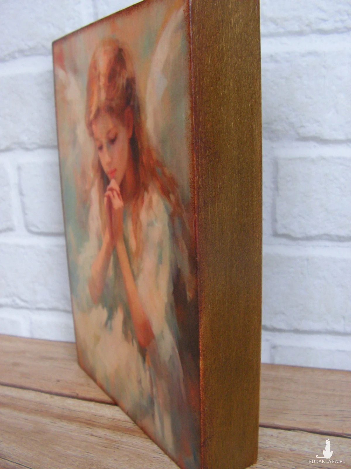 "Anielska Modlitwa" - obrazek na desce, wykonany w technice decoupage. Boki pomalowane bejcą wodną w kolorze „dąb”.