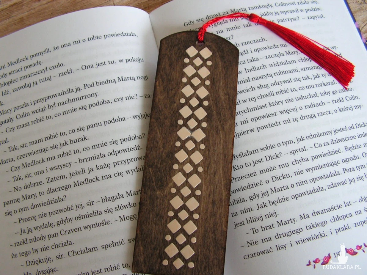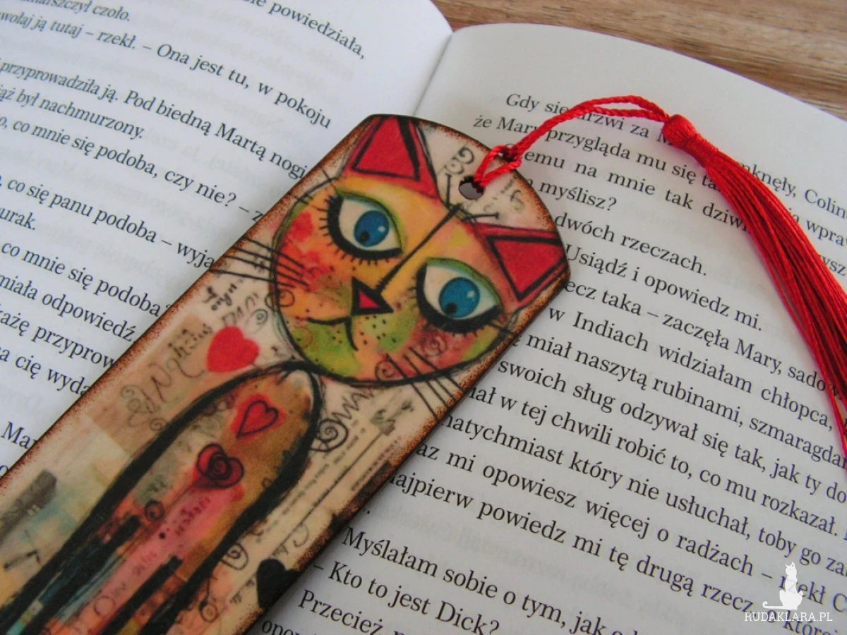 Awers - grafika na papierze ryżowym, rewers - wzór naniesiony pastą strukturalną. Wykończenie zakładki to czerwony, jedwabny chwost.