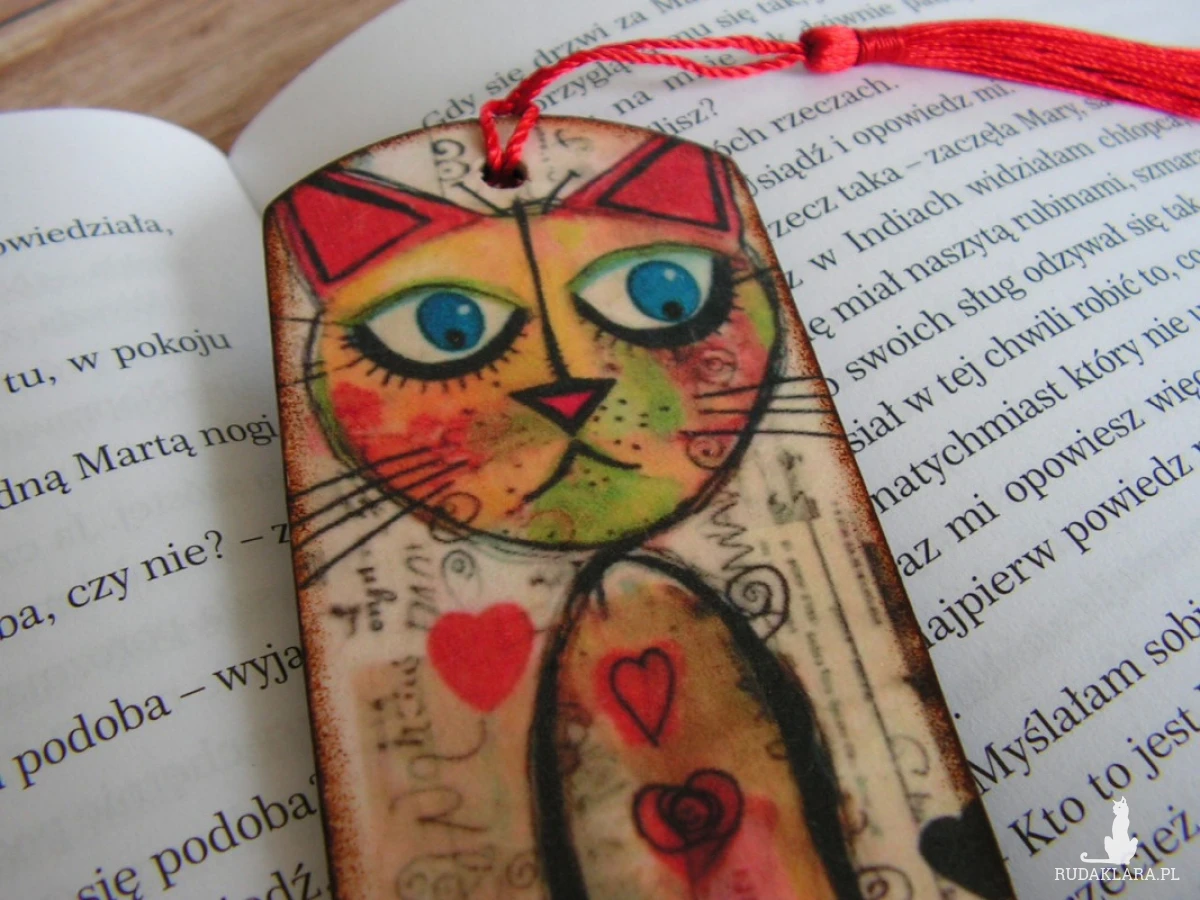 Zakładka dwustronnie zdobiona techniką decoupage i zabezpieczone kilkoma warstwami lakieru.
