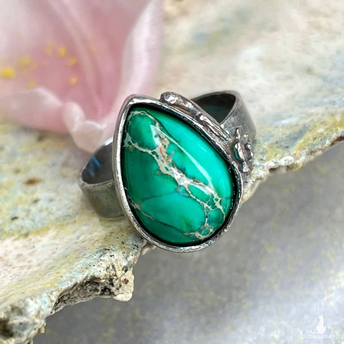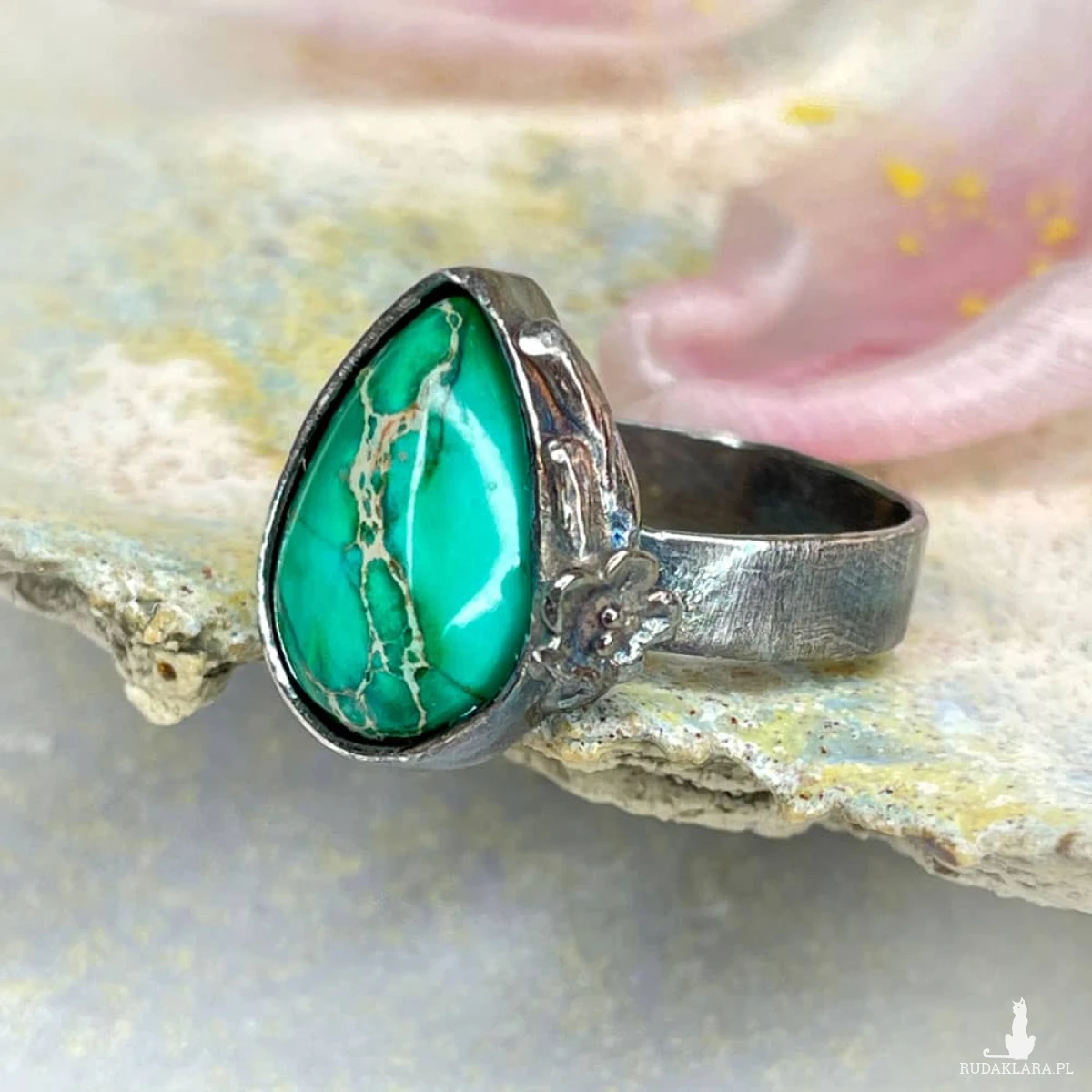 Ten srebrny pierścionek z jaspisem cesarskim to połączenie wyrazistego koloru i subtelnej formy, inspirowanej naturą. Intensywnie turkusowy kamień o charakterystycznym wzorze przywołuje na myśl mapy nieznanych miejsc – dodając biżuterii nuty tajemnicy i świeżości. Osadzony w ręcznie fakturowanym srebrze i ozdobiony kwiatowym akcentem, pierścionek zachwyca lekkością i dopracowaniem detali.
