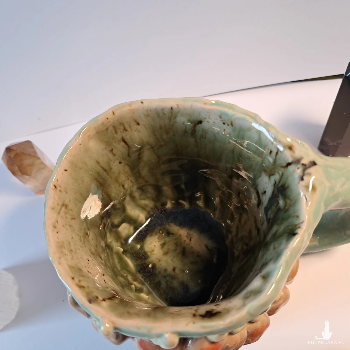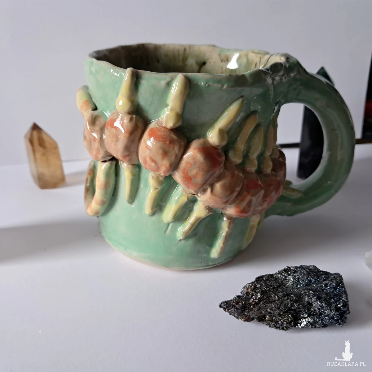 średni kubek z gliny ze skolopendrą. Wykonany własnoręcznie. Kubek ma około 170ml