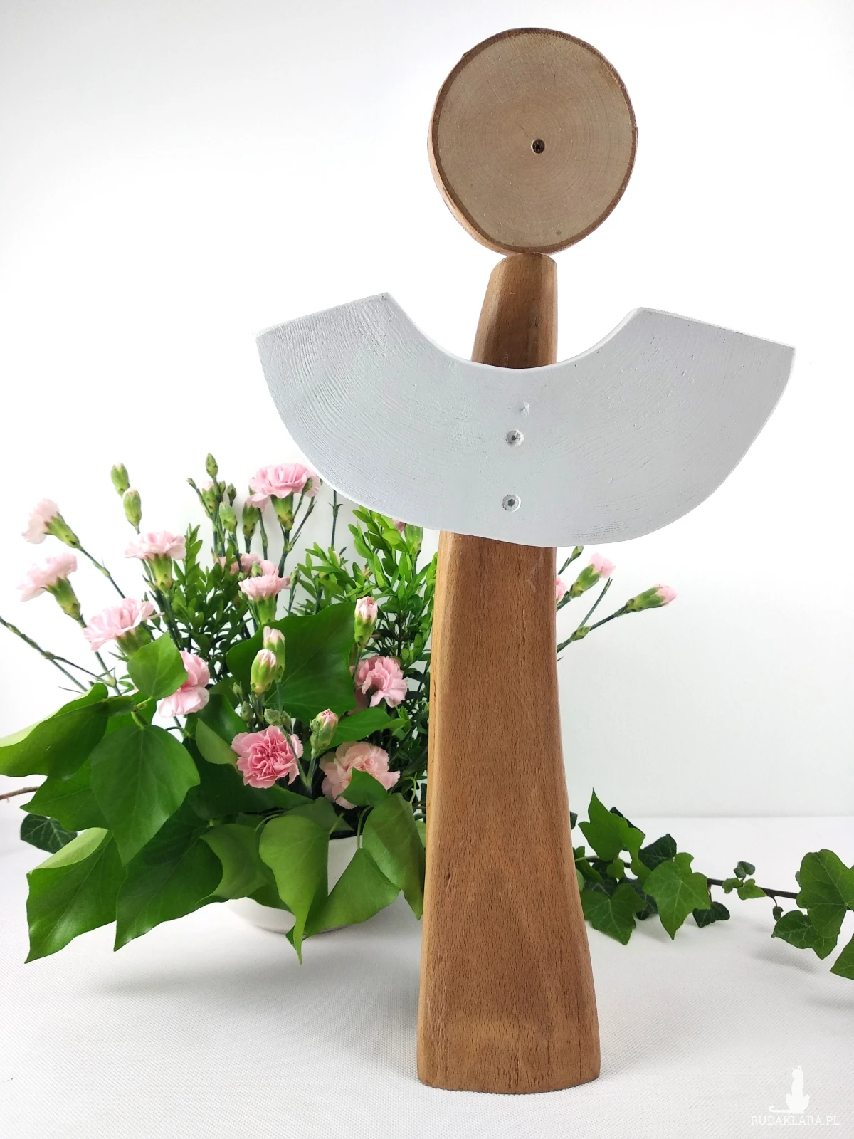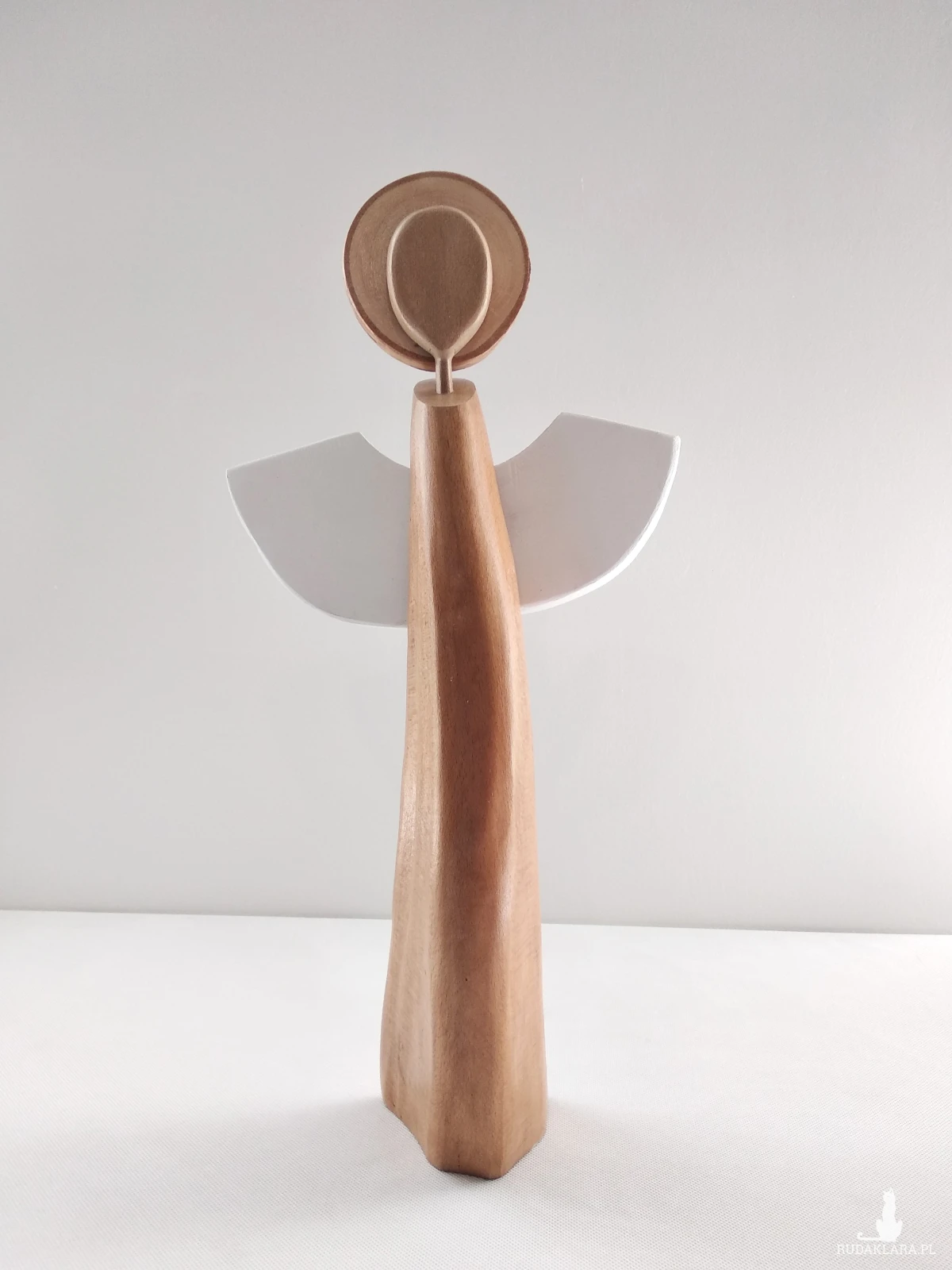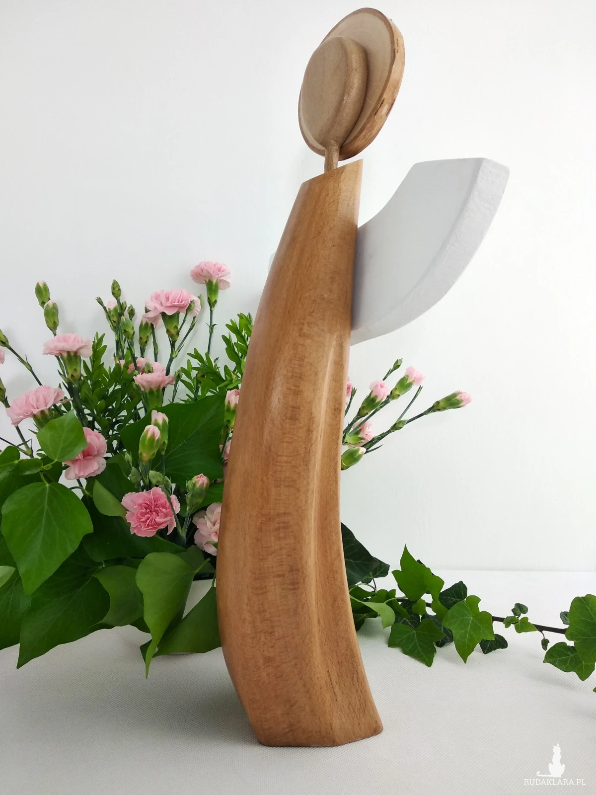 Nowoczesna figura anioła, wykonana ręcznie z naturalnego drewna różnego gatunku. Gładki, drewniany bukowy korpus o ciepłym odcieniu zestawiony został z białymi skrzydłami, tworząc subtelny kontrast i elegancką formę. Rzeźba ma minimalistyczny kształt, który podkreśla piękno drewna i precyzję ręcznego wykonania.