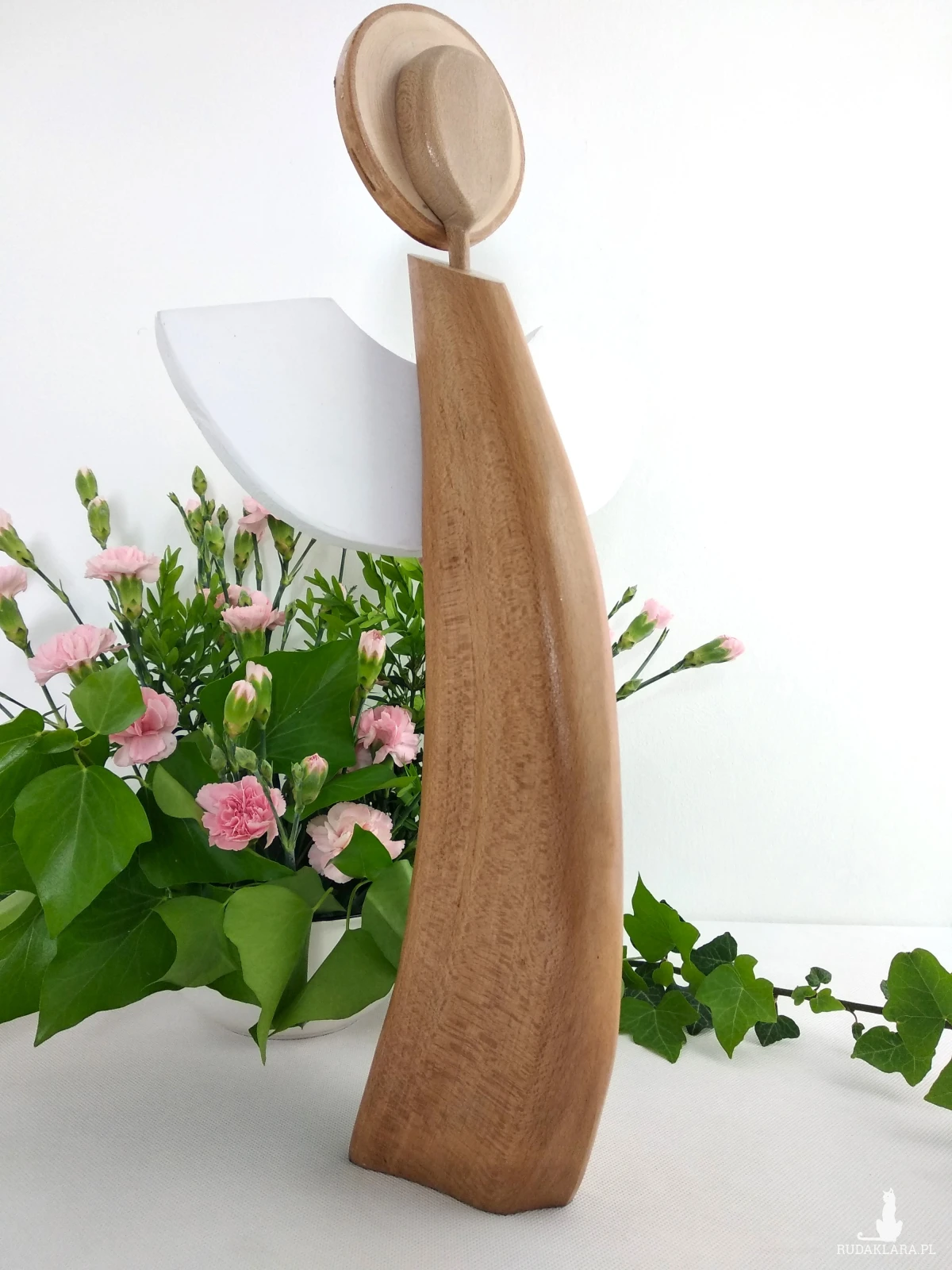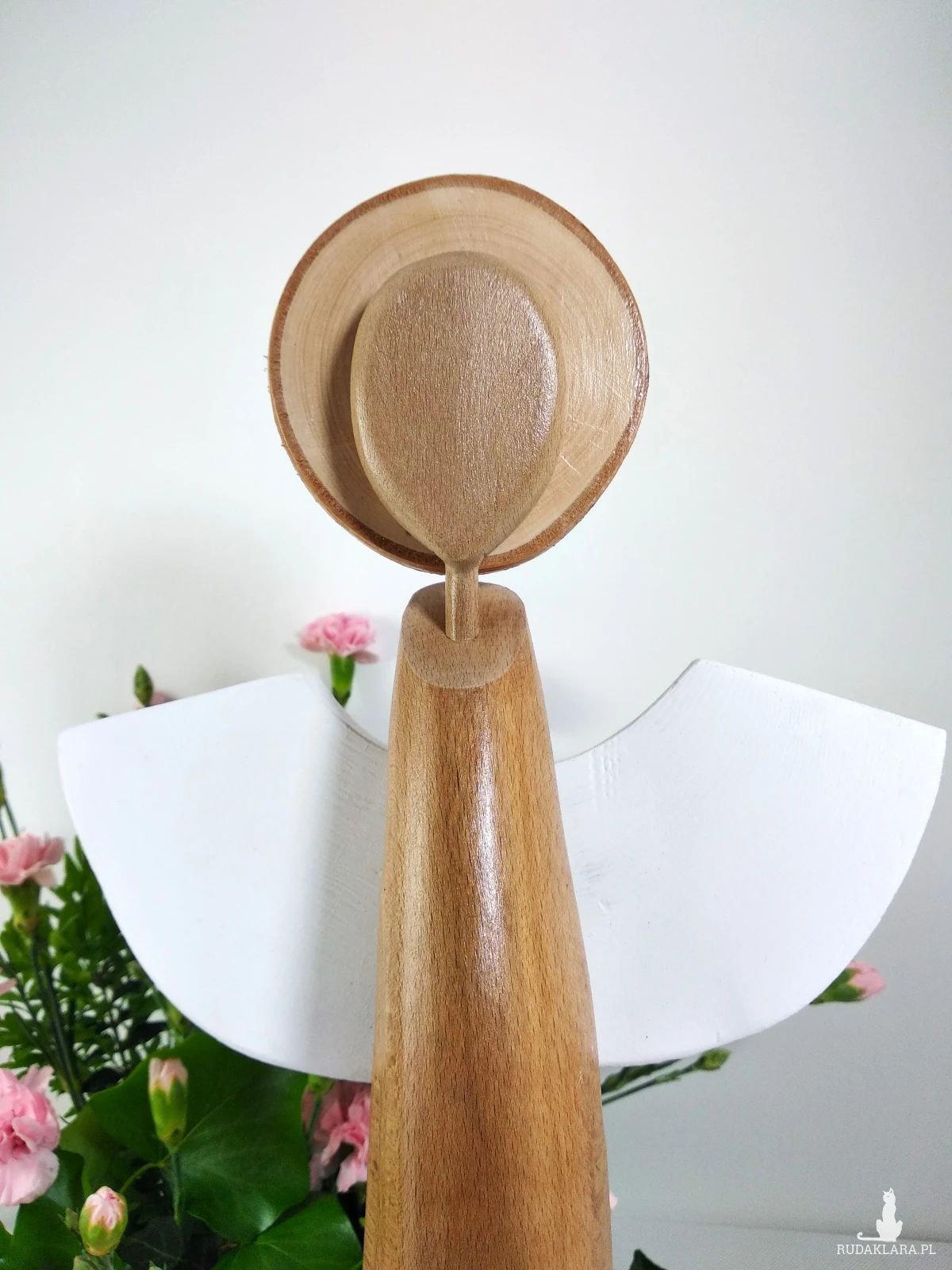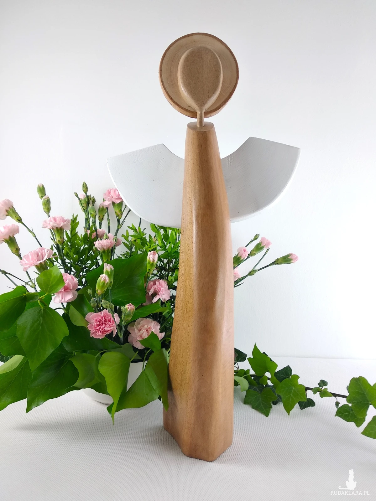 Nowoczesna figura anioła, wykonana ręcznie z naturalnego drewna różnego gatunku. Gładki, drewniany bukowy korpus o ciepłym odcieniu zestawiony został z białymi skrzydłami, tworząc subtelny kontrast i elegancką formę. Rzeźba ma minimalistyczny kształt, który podkreśla piękno drewna i precyzję ręcznego wykonania.