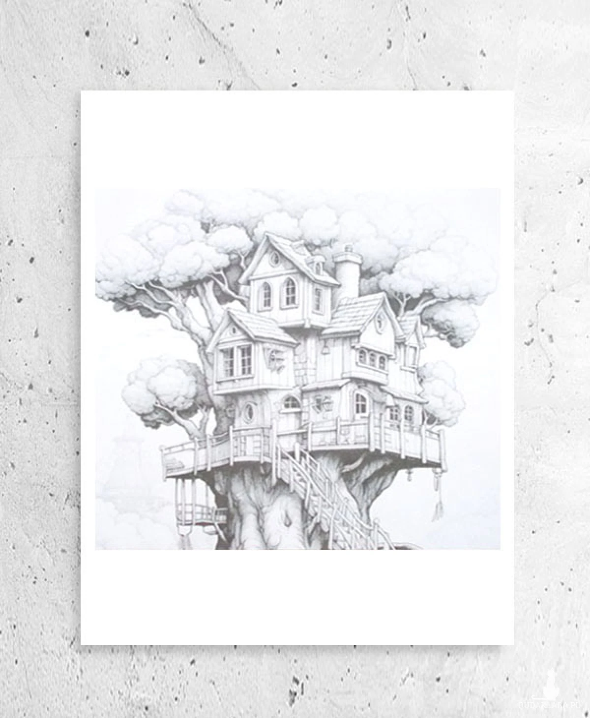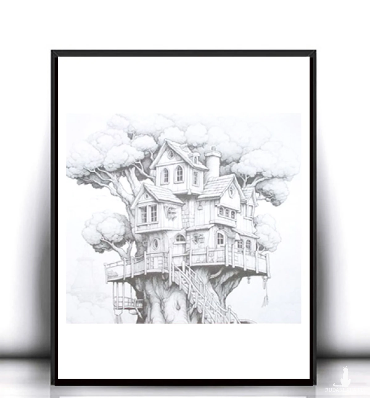 Nowy plakat z bajkową chatką, domkiem. Biało czarna ilustracja na białym kartoniku A4. Poster wystarczy tylko umieścić w ramce 21x30 cm. Plakat na ścianę do sypialni, salonu, przedpokoju, jadalni, pokoju młodzieżowego lub dziecięcego, biura, gabinetu, holu, garderoby, kawiarni, restauracji itp. Grafika będzie pasowała do każdego wystroju wnętrz, zarówno do tych nowoczesnych, jak i bardziej tradycyjnych. Przedmiot do dekoracji domu lub mieszkania,